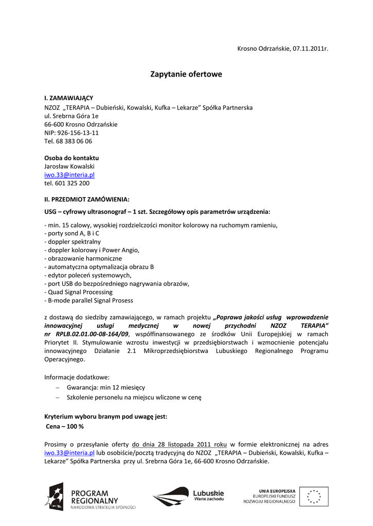 Krosno Odrzańskie, 07.11.2011r. Zapytanie ofertowe I. ZAMAWIAJĄCY NZOZ „TERAPIA – Dubieński, Kowalski, Kufka – Lekarze” Spółka Partnerska ul. Srebrna Góra 1e 66-600 Krosno Odrzańskie NIP: 926-156-13-11 Tel. 68 383 06 06 Osoba do kontaktu Jarosław Kowalski [email protected] tel. 601 325 200 II. PRZEDMIOT ZAMÓWIENIA: USG – cyfrowy ultrasonograf – 1 szt. Szczegółowy opis parametrów urządzenia: - min. 15 calowy, wysokiej rozdzielczości monitor kolorowy na ruchomym ramieniu, - porty sond A, B i C - doppler spektralny - doppler kolorowy i Power Angio, - obrazowanie harmoniczne - automatyczna optymalizacja obrazu B - edytor poleceń systemowych, - port USB do bezpośredniego nagrywania obrazów, - Quad Signal Processing - B-mode parallel Signal Prosess z dostawą do siedziby zamawiającego, w ramach projektu „Poprawa jakości usług wprowadzenie innowacyjnej usługi medycznej w nowej przychodni NZOZ TERAPIA” nr RPLB.02.01.00-08-164/09, współfinansowanego ze środków Unii Europejskiej w ramach Priorytet II. Stymulowanie wzrostu inwestycji w przedsiębiorstwach i wzmocnienie potencjału innowacyjnego Działanie 2.1 Mikroprzedsiębiorstwa Lubuskiego Regionalnego Programu Operacyjnego. Informacje dodatkowe: Gwarancja: min 12 miesięcy Szkolenie personelu na miejscu wliczone w cenę Kryterium wyboru branym pod uwagę jest: Cena – 100 % Prosimy o przesyłanie oferty do dnia 28 listopada 2011 roku w formie elektronicznej na adres [email protected] lub osobiście/pocztą tradycyjną do NZOZ „TERAPIA – Dubieński, Kowalski, Kufka – Lekarze” Spółka Partnerska przy ul. Srebrna Góra 1e, 66-600 Krosno Odrzańskie.