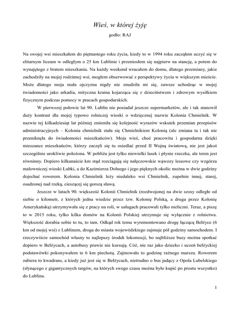 Wieś, w której żyję godło: RAJ Na swojej wsi mieszkałem do piętnastego roku życia, kiedy to w 1994 roku zacząłem uczyć się w elitarnym liceum w odległym o 25 km Lublinie i przeniosłem się najpierw na stancję, a potem do wynajętego z bratem mieszkania. Na każdy weekend wracałem do domu, dlatego przemiany, jakie zachodziły na mojej rodzinnej wsi, mogłem obserwować z perspektywy życia w większym mieście. Może dlatego moja mała ojczyzna nigdy nie znudziła mi się, zawsze uchodząc w mojej świadomości jako arkadia, mityczna kraina kojarząca się z dzieciństwem i zdrowym wysiłkiem fizycznym podczas pomocy w pracach gospodarskich. W pierwszej połowie lat 90. Lublin nie posiadał jeszcze supermarketów, ale i tak stanowił duży kontrast dla mojej typowo rolniczej wioski o wdzięcznej nazwie Kolonia Chmielnik. W nazwie tej kilkadziesiąt lat później zmieniła się kolejność wyrazów wskutek przemian przepisów administracyjnych – Kolonia chmielnik stała się Chmielnikiem Kolonią (ale zmiana ta i tak nie przeniknęła do świadomości mieszkańców). Moja wieś, choć pracowita i gospodarna dzięki mieszance mieszkańców, którzy zaczęli się tu osiedlać przed II Wojną światową, nie jest jakoś szczególnie urokliwie położona. W pobliżu jest tylko niewielki lasek i płynie rzeczka, ale teren jest równinny. Dopiero kilkanaście km stąd rozciągają się nałęczowskie wąwozy lessowe czy wzgórza malowniczej wioski Łubki, a do Kazimierza Dolnego i jego pięknych okolic można w dwie godziny dojechać rowerem. Kolonia Chmielnik leży niedaleko wsi Chmielnik, zupełnie innej, starej, osadzonej nad rzeką, cieszącej się gorszą sławą. Jeszcze w latach 90. większość Kolonii Chmielnik (rozdwojonej na dwie szosy odległe od siebie o kilometr, z których jedna wiedzie przez tzw. Kolonię Polską, a druga przez Kolonię Amerykańską) utrzymywała się z pracy na roli, w usługach pracowali tylko nieliczni. Teraz, a piszę to w 2015 roku, tylko kilka domów na Kolonii Polskiej utrzymuje się wyłącznie z rolnictwa. Większość dorabia sobie to tu, to tam. Odkąd rok temu wyremontowano drogę łączącą Bełżyce (6 km od mojej wsi) z Lublinem, droga do miasta wojewódzkiego zajmuje pół godziny samochodem. I rzeczywiście samochód własny to najlepszy środek lokomocji, bo najbliższe busy można spotkać dopiero w Bełżycach, a autobusy prawie nie kursują. Cóż, nie raz jako dziecko i uczeń bełżyckiej podstawówki pokonywałem te 6 km piechotą. Zajmowało to godzinę raźnego marszu. Rowerem zabiera to kwadrans, a kiedy już jest się w Bełżycach, nietrudno o bus jadący z Opola Lubelskiego (słynącego z gigantycznych targów, na których swego czasu można było kupić po prostu wszystko) do Lublina. 1 Kiedy w latach 90. w poniedziałek rano dojeżdżałem ze wsi do swojego liceum na ulicy Ogrodowej w Lublinie, wiozłem (jako tzw. słoik, tyle że nie warszawski, jak to teraz w modzie, ale lubelski) cały plecak jajek, pierogów, prania i słoików właśnie, co mi musiało wystarczyć aż do piątku. Pamiętam jak kiedyś demonstracyjnie na przerwie lekcyjnej wypiłem surowe jajko (których kilka miałem w plecaku), wprawiając w osłupienie miastowych kolegów i koleżanki. Taka kozacka fantazja. Ale dzięki temu, że dni powszednie spędzałem w ścisłym centrum miasta, na bocznej Chopina, tym bardziej podobały mi się weekendowe powroty do natury, a to przecież przyroda, a nie kamienice i bloki, była dla mnie widokiem naturalnym. Nie tylko w mojej rodzinie, ale też w niemal całej wsi obowiązywał - że tak powiem - etos gospodarza. Praca na roli była bardzo ważna i musiała być wykonywana rzetelnie i bez oszczędzania się. Mój dziadek po mieczu (umarł w 1989 r.) mawiał, że dopóki się przy robocie nie spoci to znaczy, że praca mu nie idzie. Bo musiała mieć swoje tempo, na tyle szybkie, żeby ubywała, ale też niezbyt prędkie, żeby pracującym starczyło sił na cały dzień, a przynajmniej do najbliższej przerwy. A przerwy w pracy są bardzo ważne. Pozwalają z perspektywy spojrzeć na to, co się aktualnie robi, i podczas wytchnienia można wpaść na jakiś pomysł, który ułatwi lub przyśpieszy robotę. No i można złapać oddech, napić się czegoś i zjeść kanapkę (najlepiej z boczkiem, który daje krzepę). Oczywiście wszystko zależy od wykonywanej pracy, bo podczas robienia oprysków nie wolno jeść ani pić, ale choćby praca przy wyrzucaniu gnoju wymaga dużo picia i przerw, jako typowo fizyczna i jedna z najcięższych na wsi. Wracając do etosu gospodarza, polegał on m.in. na tym, że właściciel gospodarstwa, czyli gospodarz, dbał pieczołowicie o wszystko i nie pozwalał na żadne marnotrawstwo. Raczej nie upijał się, nie wydawał pieniędzy na zbytki, pracował dużo i ciężko, a odpoczywał jedynie w święta kościelne (moja wieś jest typowo katolicka, choć kilkaset lat temu na tych terenach były zbory ariańskie). Słyszałem nawet opowieść o gospodarzu z niedalekiej wioski, który miał kilkoro dzieci, ale został wdowcem i pojął za żonę pannę, z którą też miał kilkoro dzieci (dawniej wielość dzieci nie była niczym niezwykłym). Taki ponowny ożenek nie był wcale rzadko spotykany (młodych wdów i wdowców było o wiele więcej niż obecnie), natomiast zaskakujące z obecnego punktu widzenia jest to, że ta druga żona gotowała mężowi o wiele lepiej niż swoim i jego dzieciom, ponieważ był on żywicielem rodziny i od jego pracy zależało utrzymanie wszystkich, więc musiał dobrze zjeść żeby mieć siły do pracy. Jeśli brakowało mięsa, to mąż je dostawał, a żona i dzieci musiały się obyć bez tego przysmaku. Wiązało się z tym też zupełnie inne niż obecnie podejście do dzieci - których teraz jest mało, a kiedyś było bardzo wiele. Otóż czym osoba była starsza, tym należał jej się większy szacunek (dziś jest odwrotnie