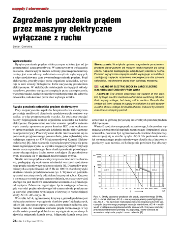 Zagrożenie porażenia prądem przez maszyny elektryczne wyłączane z ruchu Stefan Gierlotka Wprowadzenie Ryzyko porażenia prądem elektrycznym zależne jest od jego natężenia i czasu przepływu. W samoczynnym wyłączaniu zasilania, stanowiącym środek ochrony przeciwporażeniowej, istotny jest czas własny zadziałania urządzeń wyłączających, a więc spodziewany czas ewentualnego rażenia prądem. Prąd elektryczny, przepływając przez organizm człowieka, wywołuje w nim zmiany biologiczne, które nazywamy porażeniem elektrycznym. W niektórych instalacjach zasilających układy napędowe, pomimo wyłączenia napięcia przez zabezpieczenie, występuje nadal, napięcie rażeniowe niebezpieczne dla zdrowia człowieka, indukowane przez stan wybiegu silnika. Ryzyko porażenia człowieka prądem elektrycznym Przy rozpatrywaniu aspektów bezpieczeństwa elektrycznego istnieje możliwość określenia spodziewanych skutków wypadku, a więc prognozowanie ryzyka. Za podstawę przyjąć należy fizjologiczne reakcje organizmu człowieka na bodźce elektryczne. Dopuszczalne wartości czasów i prądów rażeniowych zostały opracowane przez komitet IEC oraz wykazane w opracowaniach dotyczących działania prądu elektrycznego na organizm żywy. Przewidywane skutki rażenia ocenia się na podstawie przyjmowanego powszechnie, jako najbardziej miarodajnego, raportu nr 479 Międzynarodowej Komisji Elektrotechnicznej [6]. Jako zdarzenie niepożądane przyjmuje się porażenie zagrażające życiu, w wyniku mogącej wystąpić fibrylacji komór serca u porażonego. Inne skutki porażenia powodujące urazy niezagrażające życiu, nawet szokujące dla poszkodowanych, mieszczą się w granicach tolerowanego ryzyka. Skutki rażenia prądem elektrycznym oceniać można ilościowo, posługując się wykresem zależności wartości spodziewanego prądu rażeniowego od czasu rażenia [6]. Dla prądów przemiennych o częstotliwości od 15 Hz do 100 Hz charakterystyki skutków rażenia przedstawiono na rys. 1. Wykres ten podzielony został na cztery strefy oddzielone krzywymi a, b, c. Krzywa b wyznacza wartość prądu samouwolnienia, to znaczy powyżej którego nie jest możliwe samodzielne uwolnienie się rażonego od napięcia. Zdarzenie zagrażające życiu następuje wówczas, gdy wartości prądu rażeniowego lub czasu rażenia przekraczają wartości graniczne wynikające z krzywej c rozdzielającej strefy AC-3 i AC-4 (rys. 1). W strefie AC-4, ograniczonej krzywą c, prawdopodobne jest niebezpieczeństwo wystąpienia skutków patofizjologicznych, takich jak: zatrzymanie pracy serca, zatrzymanie oddechu, oparzenia ciała. Ze wzrostem wartości prądu rażeniowego w tej strefie rośnie prawdopodobieństwo wystąpienia u porażonych zjawiska migotania komór serca. Migotanie komór serca jest 24 l Nr 1 l Styczeń 2012 r. Streszczenie: W artykule opisano zagrożenie porażeniem prądem elektrycznym od maszyn elektrycznych po wyłączeniu napięcia zasilającego, a będących jeszcze w ruchu. Pomimo wyłączenia napięcia nadal występuje w instalacji zasilającej napięcie rażeniowe niebezpieczne dla zdrowia człowieka, indukowane przez stan wybiegu maszyny. Hazard of electric shock by large electric machines switched off from work Abstract: The article describes the hazard of the electric by large electric machines after them switching off from their supply voltage, but being still in motion. Despite the switch-off from voltage in supply-installation it is still dangerous the shock voltage for health of man, induced by electric machine in stopping period. uznawane za główną przyczynę śmiertelnych porażeń prądem elektrycznym. Wartość spodziewanego prądu rażeniowego, którą można wyznaczyć ze znajomości napięcia rażeniowego i impedancji ciała człowieka, powinna być ograniczona do wartości bezpiecznej, mieszczącej się w strefie ryzyka AC-3. Na podstawie wartości wyznaczonego prądu rażeniowego określa się z krzywej c graniczny czas rażenia, od którego nie powinien być dłuższy Rys. 1. Strefy czasowo-prądowe dla prądu przemiennego 50 Hz. AC-1 – brak efektów; AC-2 – nie występują efekty patofizjologiczne; AC-3 – nie zachodzi niebezpieczeństwo migotania komór sercowych, jedynie mogą wystąpić reakcje mięśniowe; AC-4 – możliwość wystąpienia migotania komór sercowych. Krzywa c dotyczy prawdopodobieństwa poniżej 1% populacji, które wzrasta ze wzrostem natężenia prądu i czasu rażenia, [6] Układ sieci Napięcie względem ziemi 50V≤120 V 120V≤230 V 230V≤400 V ˃400 V TN 0,8 s 0,4 s 0,2 s 0,1 s TT 0,3 s 0,2 s 0,07 s 0,04 s reklama Tabela 1. Maksymalne czasy wyłączania dla obwodów końcowych AC o prądzie nieprzekraczającym 32 A podane w: Norma PN-HD 60364-4-41: 2009 [8] czas działania urządzenia ochronnego, zapewniającego samoczynne wyłączenie zasilania. Krzywa c jest granicą tolerowanego ryzyka. Ochrona przed porażeniem prądem elektrycznym Od 1991 r. obowiązuje Rozporządzenie Ministra Przemysłu z dnia 08.10.1990 r. [7] w sprawie warunków technicznych, jakim powinny odpowiadać urządzenia elektroenergetyczne w zakresie ochrony przeciwporażeniowej. Rozporządzenie określa napięcie dotykowe nieprzekraczające 50 V za bezpieczne, jeżeli w określonych warunkach środowiskowych impedancja ciała człowieka jest większa od 1000 Ω, lub napięcie 25 V, gdy impedancja ciała człowieka jest mniejsza od 1000 Ω. Dla rażeń prądem stałym wartość napięcia bezpiecznego określono odpowiednio jako 120 V oraz 60 V. Najbardziej rozpowszechnionym środkiem ochrony przed dotykiem pośrednim, zalecanym we wszystkich instalacjach elektrycznych, jest ochrona przez samoczynne wyłączenie zasilania. Ochrona ta może być stosowana we wszystkich układach sieciowych: TN, TT oraz IT. Urządzenie zabezpieczająco-wyłączające powinno działać w taki sposób, aby w przypadku zwarcia doziemnego między częścią czynną a częś