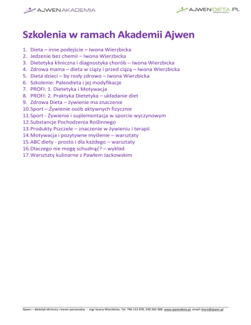 Szkolenia w ramach Akademii Ajwen 1. Dieta – inne podejście – Iwona Wierzbicka 2. Jedzenie bez chemii – Iwona Wierzbicka 3. Dietetyka kliniczna i diagnostyka chorób – Iwona Wierzbicka 4. Zdrowa mama – dieta w ciąży i przed ciążą – Iwona Wierzbicka 5. Dieta dzieci – by rosły zdrowo – Iwona Wierzbicka 6. Szkolenie: Paleodieta i jej modyfikacje 7. PROFI: 1. Dietetyka i Motywacja 8. PROFI: 2. Praktyka Dietetyka – układanie diet 9. Zdrowa Dieta – żywienie ma znaczenie 10.Sport – Żywienie osób aktywnych fizycznie 11.Sport - Żywienie i suplementacja w sporcie wyczynowym 12.Substancje Pochodzenia Roślinnego 13.Produkty Pszczele – znaczenie w żywieniu i terapii 14.Motywacja i pozytywne myślenie – warsztaty 15.ABC diety - prosto i dla każdego – warsztaty 16.Dlaczego nie mogę schudnąć? – wykład 17.Warsztaty kulinarne z Pawłem Jackowskim Ajwen – dietetyk kliniczny i trener personalny - mgr Iwona Wierzbicka. Tel. 796 122 070, 530 263 389. www.ajwendieta.pl, email: [email protected] Dieta – inne podejście prowadzący: Iwona Wierzbicka czas trwania: 2 dni Szkolenie skierowane jest do wszystkich osób, które chcą poznać inne oblicza dietetyki. To nie jest taka dietetyka jaką znasz, nie dowiesz się że w 5 posiłkach należy jeść pełnoziarniste zboża, a jedynym i najlepszym źródłem wapnia jest nabiał. Nie jesteśmy za chudym mięsem, ani za ograniczaniem jaj do 2 razy w tygodniu. Oświadczenie Iwony Wierzbickiej. To jest pierwsze szkolenie z cyklu trzech najpopularniejszych szkoleń w systemie Ajwen – szkolenia: Dieta – inne podejście -> Jedzenie bez chemii -> Dietetyka Kliniczna. Warto od tego szkolenia zacząć by zrozumieć treść kolejnych szkoleń. Będzie o białkach, tłuszczach, węglowodanach, witaminach, minerałach, substancjach antyodżywczych, biologicznej biodostępności. Porównam piramidę Ajwen i piramidę IŻŻ, opowiem o cholesterolu i obalę wiele mitów. Ajwen – dietetyk kliniczny i trener personalny - mgr Iwona Wierzbicka. Tel. 796 122 070, 530 263 389. www.ajwendieta.pl, email: [email protected] Szczegółowe zagadnienia Dieta – inne podejście: METABOLIZM: 1. Insulina, glukagon, procesy poposiłkowe i międzyposiłkowe 2. Jak często należy jeść 3. Jesteś tym co jesz, czy jesteś tym co twój organizm zrobi z jedzeniem 4. Najważniejsze składniki dla organizmu: energetyczne, budulcowe, regulujące 5. Źródła energii dla organizmu WĘGLOWODANY: 6. Podział oficjalny i nieoficjalny 7. Cukry proste (mono i disacharydy) 8. Glukoza, fruktoza, sacharoza, laktoza, maltoza 9. Szerzej o glukozie 10. Szerzej o fruktozie 11. Glikacja i AGE 12. Ile człowiek potrzebuje węglowodanów 13. Gdzie znajdziemy węglowodany 14. Polisacharydy czyli węglowodany złożone 15. Skrobia, właściwości, rodzaje 16. Czy banany są tuczące 17. Błonnik pokarmowy – właściwości, dobry czy zły partner, gdzie jaki znajdziemy 18. Pełnoziarniste kontra rafinowane – co kiedy jest lepsze 19. Biały cukier a brązowy cukier 20. Słodzenie, słodziki, substancje słodzące 21. Syrop fruktozowo – glukozowy (krótko, bo więcej jest na Jedzeniu bez chemii) 22. Jakie węglowodany znajdziemy w warzywach i owocach 23. Insulina, cukrzyca a węglowodany (krótko, bo więcej jest na Dietetyce Klinicznej) 24. Węglowodany, a wzdęcia (krótko, bo więcej jest na Dietetyce Klinicznej) 25. Problemy z nadnerczami i tarczycą, a węglowodany (krótko, bo więcej jest na Dietetyce Klinicznej) TŁUSZCZE: 26. Które są dobre a które złe 27. Charakterystyka kwasów tłuszczowych 28. Jakie mięso jest najtłustsze 29. Wielonienasycone kwasy tłuszczowe 30. Transformacje kwasów tłuszczowych 31. Kwasy omega 3, 6 i 9 – źródła i oddziaływanie 32. Tran, olej z kryla, tran fermentowany, kapsułki omega 3 33. Kwasy DHA i EPA – wpływ na zdrowie 34. Olej z wiesiołka i ogórecznika 35. Olej lniany 36. Porównanie olei 37. Tłuszcze trans 38. Przykładowe produkty tłuszczowe 39. Hity olejowe i „kity” na etykietach 40. Temperatura dymienia 41. Metody produkcji oleju 42. Gdzie kryją się jakie kwasy tłuszczowe, czyli jak poznać czy produkt można poddawać obróbce termicznej 43. Orzechy i pestki – zdrowe czy nie 44. Czy można wypiekać chleby z mąk dyniowej, migdałowej czy kasztanowej 45. Jak wypada smalec w porównaniu z oliwą Ajwen – dietetyk kliniczny i trener personalny - mgr Iwona Wierzbicka. Tel. 796 122 070, 530 263 389. www.ajwendieta.pl, email: [email protected] 46. Cholesterol – po co on nam? (więcej o cholesterolu na Dietetyce Klinicznej) BIAŁKA I AMINOKWASY: 47. Co jest potrzebne do budowy 48. Rola białek w organizmie 49. Zapotrzebowanie na białko 50. Źródła białek i alternatywne źródła białka 51. Turnover białek – wymiana aminokwasów 52. Białka pełnowartościowe i niepełnowartościowe 53. Aminokwasy ograniczające 54. Jak skomponować posiłek by białko było pełnowartościowe 55. Problematyczne białko – czyli skąd się bierze alergia i nietolerancja (więcej o alergiach na Dietetyce Klinicznej) WOLNE RODNIKI i POPULARNE ANTYOKSYDANTY ROŚLINY STRĄCZKOWE: 56. Co zaliczamy do roślin strączkowych 57. Czy są dobrym źródłem białka 58. Za i przeciw 59. Soja, soja a dzieci, soja a hormony, soja a tarczyca 60. Lektyny SUBSTANCJE ANTYODŻYWCZE: 61. Kwas fitynowy 62. Inhibitory trypsyny 63. Antywitaminy 64. Taniny 65. Kwas szczawiowy 66. Saponiny 67. Solaniny i rośliny psiankowate 68. Goitrogeny 69. Trucizny OMÓWIENIE GRUP PRODUKTÓW: 70. Kasze – jakie są, jakie mają właściwości, które dla kogo 71. Jaja i skorupki jaj (przepisy na nalewki, jajo zamiast chleba) 72. Grzyby 73. Orzechy 74. Warzywa – zielone, krzyżowe, psiankowate, korzeniowe – co się w nich kryje (o toksynach w roślinach – Jedzenie bez chemii) 75. Owoce (co jest owocem a co nie? Dlaczego czasami nam szkodzą) 76. Mleko 77. Podroby WITAMINY I MINERAŁY: 78. Straty witamin i minerałów 79. Witamin
