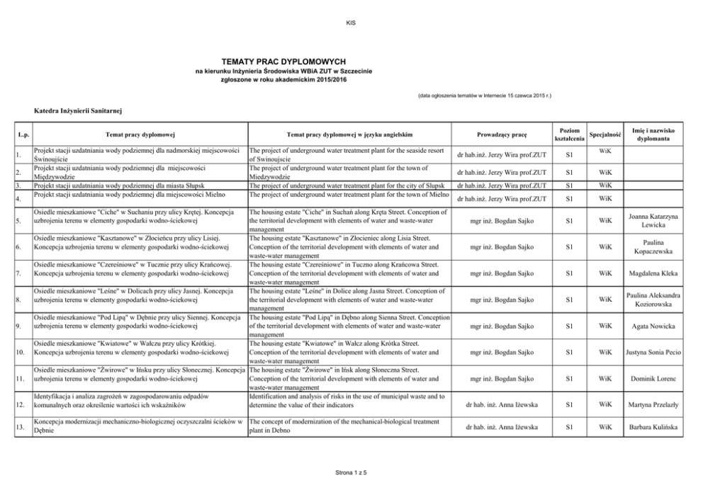 KIS TEMATY PRAC DYPLOMOWYCH na kierunku Inżynieria Środowiska WBiA ZUT w Szczecinie zgłoszone w roku akademickim 2015/2016 (data ogłoszenia tematów w Internecie 15 czewca 2015 r.) Katedra Inżynierii Sanitarnej L.p. 1. 2. 3. 4. 5. 6. 7. 8. 9. 10. 11. 12. 13. Temat pracy dyplomowej Projekt stacji uzdatniania wody podziemnej dla nadmorskiej miejscowości Świnoujście Projekt stacji uzdatniania wody podziemnej dla miejscowości Międzywodzie Projekt stacji uzdatniania wody podziemnej dla miasta Słupsk Projekt stacji uzdatniania wody podziemnej dla miejscowości Mielno Poziom Specjalność kształcenia Imię i nazwisko dyplomanta Temat pracy dyplomowej w języku angielskim Prowadzący pracę The project of underground water treatment plant for the seaside resort of Swinoujscie The project of underground water treatment plant for the town of Miedzywodzie The project of underground water treatment plant for the city of Slupsk The project of underground water treatment plant for the town of Mielno dr hab.inż. Jerzy Wira prof.ZUT S1 dr hab.inż. Jerzy Wira prof.ZUT S1 WiK dr hab.inż. Jerzy Wira prof.ZUT S1 WiK dr hab.inż. Jerzy Wira prof.ZUT S1 WiK mgr inż. Bogdan Sajko S1 WiK Joanna Katarzyna Lewicka mgr inż. Bogdan Sajko S1 WiK Paulina Kopaczewska mgr inż. Bogdan Sajko S1 WiK Magdalena Kleka mgr inż. Bogdan Sajko S1 WiK Paulina Aleksandra Koziorowska mgr inż. Bogdan Sajko S1 WiK Agata Nowicka mgr inż. Bogdan Sajko S1 WiK Justyna Sonia Pecio Osiedle mieszkaniowe "Ciche" w Suchaniu przy ulicy Krętej. Koncepcja uzbrojenia terenu w elementy gospodarki wodno-ściekowej WiK The housing estate "Ciche" in Suchań along Kręta Street. Conception of the territorial development with elements of water and waste-water management Osiedle mieszkaniowe "Kasztanowe" w Złocieńcu przy ulicy Lisiej. The housing estate "Kasztanowe" in Złocieniec along Lisia Street. Koncepcja uzbrojenia terenu w elementy gospodarki wodno-ściekowej Conception of the territorial development with elements of water and waste-water management Osiedle mieszkaniowe "Czereśniowe" w Tucznie przy ulicy Krańcowej. The housing estate "Czereśniowe" in Tuczno along Krańcowa Street. Koncepcja uzbrojenia terenu w elementy gospodarki wodno-ściekowej Conception of the territorial development with elements of water and waste-water management Osiedle mieszkaniowe "Leśne" w Dolicach przy ulicy Jasnej. Koncepcja The housing estate "Leśne" in Dolice along Jasna Street. Conception of uzbrojenia terenu w elementy gospodarki wodno-ściekowej the territorial development with elements of water and waste-water management Osiedle mieszkaniowe "Pod Lipą" w Dębnie przy ulicy Siennej. Koncepcja The housing estate "Pod Lipą" in Dębno along Sienna Street. Conception uzbrojenia terenu w elementy gospodarki wodno-ściekowej of the territorial development with elements of water and waste-water management Osiedle mieszkaniowe "Kwiatowe" w Wałczu przy ulicy Krótkiej. The housing estate "Kwiatowe" in Wałcz along Krótka Street. Koncepcja uzbrojenia terenu w elementy gospodarki wodno-ściekowej Conception of the territorial development with elements of water and waste-water management Osiedle mieszkaniowe "Żwirowe" w Ińsku przy ulicy Słonecznej. Koncepcja The housing estate "Żwirowe" in Ińsk along Słoneczna Street. uzbrojenia terenu w elementy gospodarki wodno-ściekowej Conception of the territorial development with elements of water and waste-water management Identyfikacja i analiza zagrożeń w zagospodarowaniu odpadów Identification and analysis of risks in the use of municipal waste and to komunalnych oraz określenie wartości ich wskaźników determine the value of their indicators mgr inż. Bogdan Sajko S1 WiK Dominik Lorenc dr hab. inż. Anna Iżewska S1 WiK Martyna Przelazły Koncepcja modernizacji mechaniczno-biologicznej oczyszczalni ścieków w The concept of modernization of the mechanical-biological treatment Dębnie plant in Debno dr hab. inż. Anna Iżewska S1 WiK Barbara Kulińska Strona 1 z 5 KIS L.p. Temat pracy dyplomowej Badanie skuteczności napowietrzania wody i ścieków przy zastosowaniu aplikatora powietrza typu ATOL-OXY Ocena jakości wód jeziora województwa zachodniopomorskiego Temat pracy dyplomowej w języku angielskim Prowadzący pracę Poziom Specjalność kształcenia Imię i nazwisko dyplomanta Study of the effectiveness of water and wastewater aeration using airtype applicator ATOL-OXY Quality water rating of lakes in West Pomeranian Voivodeship dr hab. inż. Anna Iżewska S1 WiK dr hab. inż. Anna Iżewska S1 WiK Projekt budowlany sieci kanalizacyjnej i wodociągowej w miejscowości 16 a wiejskiej w województwie zachodniopomorskim Construction project of the sewage system and the water supply system in village area in the West Pomeranian voivodeship dr inż. Sławomira Bering S1 WiK Joanna Smętoch Projekt budowlany sieci kanalizacyjnej i wodociągowej w miejscowości 16 b wiejskiej w województwie zachodniopomorskim Construction project of the sewage system and the water supply system in village area in the West Pomeranian voivodeship dr inż. Sławomira Bering S1 WiK Mariusz Ostrowski Projekt budowlany sieci kanalizacyjnej w miejscowości wiejskiej w województwie zachodniopomorskim Projekt budowlany sieci kanalizacyjnej w miejscowości wiejskiej w 18 a województwie zachodniopomorskim Projekt budowlany sieci kanalizacyjnej w miejscowości wiejskiej w 18b województwie zachodniopomorskim Projekt budowlany sieci kanalizacyjnej w miejscowości wiejskiej w 19. województwie zachodniopomorskim 20 Projekt oczyszczania ścieków dla miasta Świnoujście 21 Projekt oczyszczania ścieków dla miejscowości Międzywodzie 22 Projekt oczyszczania ścieków dla miasta Słupsk Projekt oczyszczania ścieków dla miejscowości Mielno 23 Construction project of the sewage system in village area in the West Pomeranian voivodeship Construction project of the sewage system in village area in the West Pomerani