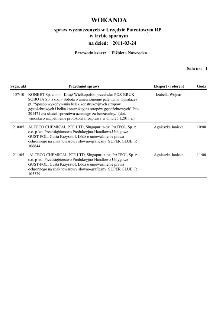 WOKANDA spraw wyznaczonych w Urzędzie Patentowym RP w trybie spornym na dzień: 2011-03-24 Przewodniczący: Elżbieta Nawrocka Sala nr: 1 Sygn. akt Przedmiot sprawy Ekspert - referent Godz 157/10 KONBET Sp. z o.o. - Książ Wielkopolski przeciwko POZ-BRUK SOBOTA Sp. z o.o. - Sobota o unieważnienie patentu na wynalazek pt. "Sposób wykonywania belek konstrukcyjnych stropów gęstożebrowych i belka konstrukcyjna stropów gęstożebrowych" Pat201471 /na skutek sprzeciwu uznnaego za bezzasadny/ (dot. wniosku o uzupełnienie protokołu z rozprawy w dniu 25.I.2011 r.) Izabella Wojnar 210/05 ALTECO CHEMICAL PTE LTD, Singapur, z-ca: PATPOL Sp. z o.o. p-ko: Przedsiębiorstwo Produkcyjno-Handlowo-Usługowe GUST-POL, Gusta Krzysztof, Łódź o unieważnienie prawa ochronnego na znak towarowy słowno-graficzny SUPER GLUE R 106644 Agnieszka Janicka 10:00 211/05 ALTECO CHEMICAL PTE LTD, Singapur, z-ca: PATPOL Sp. z o.o. p-ko: Przedsiębiorstwo Produkcyjno-Handlowo-Usłygowe GUST-POL, Gusta Krzysztof, Łódź o unieważnienie prawa ochronnego na znak towarowy słowno-graficzny SUPER GLUE R 105379 Agnieszka Janicka 11:00