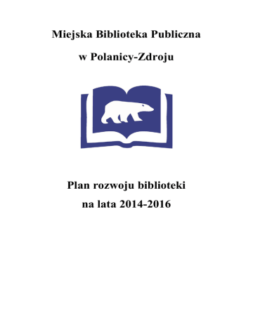 Miejska Biblioteka Publiczna w Polanicy-Zdroju Plan rozwoju biblioteki na lata 2014-2016 Miejska Biblioteka Publiczna w Polanicy-Zdroju PLAN ROZWOJU BIBLIOTEKI NA LATA 2014-2016 I. Wizytówka biblioteki Polanica-Zdrój jest gminą uzdrowiskową, liczy 6412 mieszkańców (stan na 31.12.2013). MBP działa od 1949; ma 1 punkt biblioteczny - w Biurze Promocji w Parku Zdrojowym. Księgozbiór: 34 tys. woluminów, liczba czytelników: 1686; zatrudnienie: 6 pracowników, w tym 4 na stanowiskach merytorycznych. W bibliotece jest 10 stanowisk komputerowych dla czytelników, wi-fi, płatne usługi ksero. Działa Kłodzki Klub Fotograficzny i klub literacki dla dzieci. Działalność kult.: wystawy czasowe, spotkania z ciekawymi ludźmi (pisarze, regionaliści, politycy, działacze społ.), prelekcje i wykłady o historii regionu, kameralne koncerty muz., konkursy wiedzy o literaturze, warsztaty artystyczne. Od 2013 uczestniczy w Europejskich Dniach Dziedzictwa, propagując wiedzę o historii miasta. Obecnie jest wyremontowana i na nowo kompleksowo wyposażona ze środków finansowych programu Biblioteka+. Infrastruktura bibliotek. Stale współpracuje z lokalnymi szkołami i stowarzyszeniami. Organizuje Ogólnopolskie Biennale Rysunku Satyrycznego "Kurorty i kuracjusze" i wystawy indywidualne znanych satyryków. W 2013 otrzymała tytuł najlepszej biblioteki Dolnego Śląska w rankingu Rzeczypospolitej i Instytutu Książki. Zachęcamy do kontaktu: Miejska Biblioteka Publiczna ul. Wojska Polskiego 23 -, 57-320 Polanica-Zdrój Iwona Mokrzanowska e-mail: [email protected], [email protected] telefon: 748681467 ten dokument został stworzony przez bibliotekę w ramach jej udziału w Programie Rozwoju Bibliotek Miejska Biblioteka Publiczna w Polanicy-Zdroju PLAN ROZWOJU BIBLIOTEKI NA LATA 2014-2016 II. Potencjał biblioteki Analiza SWOT Mocne strony biblioteki Słabe strony biblioteki 1. Zasoby ludzkie: wykwalifikowany zespół 1. Od 2001 roku lokalizacja poza ścisłym pracowników; 2. lokalizacja w centrum uzdrowiska (tj. okolicami deptaka i nowoczesnym dużym obiekcie (699,9 m Parku Zdrojowego), co zmniejszyło liczbę kw.); 3. nowe estetyczne wyposażenie kuracjuszy, korzystających z biblioteki; 2. (drewniane meble i regały biblioteczne; kłopotliwe sąsiedztwo kuchni szkolnej nowy sprzęt komputerowy); 4. (hałas wentylatorów słyszalny w systematycznie uzupełniany i pomieszczeniach administracyjnych selekcjonowany księgozbiór - ponad 40% biblioteki, czasami też kłopotliwe kuchenne zakupiono po 2002 r.; 5. strona www, dostęp zapachy; przepełnione odpadami do katalogu on-line, 100% księgozbioru spożywczymi kubły na śmiecie naprzeciw wpisana do katalogu elektron.; 6. wejścia do budynku biblioteki); 3. systematyczna działalność w zakresie niedogrzanie obiektu zimą (jedna kotłownia upowszechniania kultury: wystawy gazowa dla całego kompleksu budynków, artystyczne, kameralne koncerty muzyczne, bez możliwości oddzielenia biblioteki); 4. spotkania autorskie; 7. obiekt dostępny dla niewystarczające oznakowanie drogi z niepełnosprawnych (schodołaz); 8. przed centrum uzdrowiska do biblioteki; 5. budynkiem duży bezpłatny parking; 9. brzydka (wypłowiała i zabrudzona) elewacja wygodna duża czytelnia: 7 stanowisk i słabo zagospodarowana przestrzeń wokół komputerowych dla osób dorosłych, wi-fi, budynku biblioteki (biblioteka nie ma dział regionalny, zarchiwizowane prawnych możliwości sfinansowania takiej dokumenty życia społecznego; 10. modernizacji, bo nie jest właścicielem ten dokument został stworzony przez bibliotekę w ramach jej udziału w Programie Rozwoju Bibliotek Miejska Biblioteka Publiczna w Polanicy-Zdroju PLAN ROZWOJU BIBLIOTEKI NA LATA 2014-2016 organizacja ogólnopolskiego biennale obiektu ani działki wokół niego); 6. brak rysunku satyrycznego pt. "Kurorty i zaplecza rekreacyjnego dla czytelników (np. kuracjusze", cykliczne wystawy rysunków małej kawiarni). znanych polskich artystów satyryków, patronat Stowarzyszenia Polskich Artystów Karykatury; 11. sąsiedztwo placówek edukacyjnych: szkoła podstawowa, szkoła średnia o profilu turystycznym, trochę dalej przedszkole publiczne; 12. własny pokój gościnny dla zapraszanych gości; 13. korzystny czas otwarcia biblioteki - 50 godzin tygodniowo; 14. umiejętność pozyskiwania środków pozabudżetowych. Zagrożenia Szanse 1. Sprzyjające bibliotekom publicznym 1. Zmiany personalne w mieście po ustawodawstwo; 2. korzystne dla rozwoju wyborach samorządowych; 2. możliwość bibliotek programy systemowe (PRB, włączenia biblioteki w większą strukturę, Biblioteka+. Infrastruktura bibliotek) i obejmującą całość działań samorządu w możliwość pozyskiwania finansowych sferze kultury i promocji miasta, bez środków pozabudżetowych z wielu źródeł; zagwarantowania bibliotece autonomii 3. rozwój Polanicy-Zdroju i wiążący się z finansowej i merytorycznej; 3. niż tym wzrost liczby kuracjuszy i turystów; 4. demograficzny i zmniejszenie się liczby marka miasta i jego popularność ułatwia najmłodszych czytelników; 4. niekorzystna bibliotece zapraszanie interesujących ludzi dla biblioteki forma władania do współpracy; 5. przychylność władz nieruchomością - umowa dzierżawy na czas samorządowych i stabilna sytuacja nieograniczony z możliwością finansowa miasta; 6. systematyczne wypowiedzenia w trybie 3 miesięcy; 5. przekształcanie biblioteki w funkcjonalne i odpływ czytelników z powodu ten dokument został stworzony przez bibliotekę w ramach jej udziału w Programie Rozwoju Bibliotek Miejska Biblioteka Publiczna w Polanicy-Zdroju PLAN ROZWOJU BIBLIOTEKI NA LATA 2014-2016 nowoczesne centrum informacji, edukacji i upowszechnienia e-booków i czytników; 5. kultury; 7. współpraca z różnymi zmiana polityki państwa wobec bibliotek instytucjami artystycznymi, naukowymi oraz publicznych, pogłębiający się kryzys z wydawnictwami; 8. systematyczne finansowy;