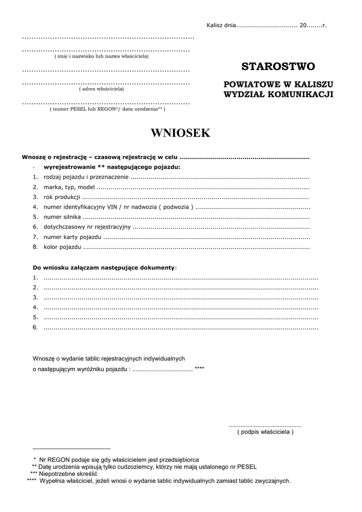 Kalisz dnia............................... 20........r. .......................................................................... ........................................................................ ( imię i nazwisko lub nazwa właściciela) ........................................................................ ........................................................................ ( adres właściciela) STAROSTWO POWIATOWE W KALISZU WYDZIAŁ KOMUNIKACJI ........................................................................ ( numer PESEL lub REGON*/ data urodzenia** ) WNIOSEK Wnoszę o rejestrację – czasową rejestrację w celu .................................................................. - wyrejestrowanie ** następującego pojazdu: 1. rodzaj pojazdu i przeznaczenie .......................................................................................... 2. marka, typ, model ........................................................................................................... 3. rok produkcji .................................................................................................................. 4. numer identyfikacyjny VIN / nr nadwozia ( podwozia ) .......................................................... 5. numer silnika .................................................................................................................. 6. dotychczasowy nr rejestracyjny ......................................................................................... 7. numer karty pojazdu ........................................................................................................ 8. kolor pojazdu .................................................................................................................. Do wniosku załączam następujące dokumenty: 1. .......................................................................................................................................... 2. .......................................................................................................................................... 3. .......................................................................................................................................... 4. .......................................................................................................................................... 5. .......................................................................................................................................... 6. .......................................................................................................................................... Wnoszę o wydanie tablic rejestracyjnych indywidualnych o następującym wyróŜniku pojazdu : .................................... **** ........................................... ( podpis właściciela ) _______________________ * Nr REGON podaje się gdy właścicielem jest przedsiębiorca ** Datę urodzenia wpisują tylko cudzoziemcy, którzy nie mają ustalonego nr PESEL *** Niepotrzebne skreślić **** Wypełnia właściciel, jeŜeli wnosi o wydanie tablic indywidualnych zamiast tablic zwyczajnych.