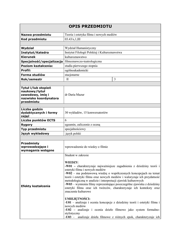 OPIS PRZEDMIOTU Nazwa przedmiotu Kod przedmiotu Teoria i estetyka filmu i nowych mediów 03.43/s,1,III Wydział Humanistyczny Instytut Filologii Polskiej i Kulturoznawstwa Instytut/Katedra kulturoznawstwo Kierunek Specjalność/specjalizacja filmoznawczo-teatrologiczna studia pierwszego stopnia Poziom kształcenia: ogólnoakademicki Profil: stacjonarne Forma studiów II 3 Rok/semestr Wydział Tytuł i/lub stopień naukowy/tytuł zawodowy, imię i nazwisko koordynatora przedmiotu Liczba godzin dydaktycznych i formy zajęć Liczba punktów ECTS Rygory Typ przedmiotu Język wykładowy Przedmioty wprowadzające i wymagania wstępne dr Daria Mazur 30 wykładów, 15 konwersatoriów 6 egzamin, zaliczenie z oceną specjalnościowy język polski wprowadzenie do wiedzy o filmie Student w zakresie Efekty kształcenia WIEDZY: -W01 – charakteryzuje najważniejsze zagadnienia z dziedziny teorii i estetyki filmu i nowych mediów -W02 – ma podstawową wiedzę o współczesnych koncepcjach na temat teorii i estetyki filmu oraz nowych mediów i waloryzuje ich przydatność metodologiczną w analizie i interpretacji zjawisk kulturowych -W03 – wymienia filmy reprezentujące poszczególne zjawiska z dziedziny estetyki filmu oraz ich twórców, charakteryzuje ich konteksty oraz znaczenie kulturowe UMIEJĘTNOŚCI: -U01 – analizuje i ocenia koncepcje z dziedziny teorii i estetyki filmu i nowych mediów -U02 – analizuje i ocenia dzieło filmowe jako system formalnostylistyczny -U03 – analizuje dzieła filmowe z różnych epok, charakteryzuje ich specyfikę i określa ich relacje z zagadnieniami z dziedziny estetyki -U04 – analizuje polityczne, historyczne, kulturowe, ideologiczne, społeczne i artystyczne konteksty wybranych problemów z dziedziny teorii i estetyki filmu i nowych mediów KOMPETENCJI SPOŁECZNYCH: -K01 – docenia wagę zagadnień z dziedziny teorii i estetyki filmu nowych mediów jako elementu dziedzictwa kultury europejskiej światowej -K02 – dostrzega konieczność integracji wiedzy z dziedziny teorii estetyki filmu i nowych mediów w budowaniu tożsamości narodowej rozwijaniu więzi społecznych na poziomie lokalnym, krajowym globalnym ..................................................... data i i i i i ......................................................................................................................................... podpis prowadzącego przedmiot/ koordynatora przedmiotu* Tab. Opis sposobu sprawdzania efektów kształcenia dla przedmiotu z odniesieniem do form zajęć i sprawdzianów Efekty kształcenia a forma zajęć Efekty kształcenia dla ** kierunku Forma zajęć przedmiotu K_W09 K_W15, K_W16, K_W18 K_U01 K_U05 K_08 K_09 Ocenianie efektów kształcenia Efekty kształcenia dla przedmiotu Sposoby oceniania*** W01, W02 W, Ć egzamin W03 W, Ć kolokwium W02 U02 U01,U03,U04 K01 K02 W, Ć W, Ć W, Ć W, Ć W, Ć W01,W02,W03, U01,U02,U03,U04, K01, K02 W01,W02,W03, U01,U02,U03,K01,K02 PROGRAM NAUCZANIA PRZEDMIOTU Rok akademicki: (2013/2014) Semestr: (zimowy) Teoria i estetyka filmu i nowych mediów Nazwa przedmiotu Wydział Humanistyczny Wydział Instytut Filologii Polskiej i Kulturoznawstwa Instytut/Katedra kulturoznawstwo Kierunek Specjalność/specjalizacja filmoznawczo-teatrologiczna wykład Opisywana forma zajęć Liczba godzin dydaktycznych 30 Tytuł i/lub stopień naukowy/tytuł dr Daria Mazur zawodowy, imię i nazwisko prowadzącego daną formę zajęć Treści programowe realizowane podczas zajęć 1. 2. 3. 4. 5. 6. 7. 8. 9. 10. 11. 12. 13. 14. 15. Znaczenie formy filmowej i zasady rządzące formą filmową. Opowiadanie jako system formalny. Problemy stylu filmowego. Ujęcie – technika inscenizacji. Reżyseria ujęcia – ruch i gra aktorska. Inscenizacja w czasie i przestrzeni. Ujęcie – technika zdjęciowa. Kadrowanie. Relacja ujęcia do ujęcia – montaż. Dźwięk w kinie. Tradycja formalna – Hugo Münsterberg, Rudolf Arnheim, Siergiej Eisenstein, Béla Balázs. Teoria fotograficznej reprodukcji – Siegfried Kracauer, André Bazin. Współczesna francuska teoria filmu – Jean Mitry, Christian Metz, Edgar Morin. Teoria autorska. Krytyka ideologiczna. Wprowadzenie do problematyki sztuki wideo. Sztuka multimediów. Metody dydaktyczne Metody i kryteria oceniania wykład, prezentacje multimedialne egzamin pisemny (system punktowy – ocena) Ocena dostateczna: charakteryzuje najważniejsze zagadnienia z dziedziny teorii i estetyki filmu i nowych mediów, student ma podstawową wiedzę o współczesnych koncepcjach na temat teorii i estetyki filmu oraz nowych mediów i waloryzuje ich przydatność metodologiczną w analizie i interpretacji zjawisk kulturowych, student analizuje i ocenia koncepcje z dziedziny teorii i estetyki filmu i nowych mediów, analizuje i ocenia dzieło filmowe jako system formalno-stylistyczny, student docenia wagę zagadnień z dziedziny teorii i estetyki filmu i nowych mediów jako elementu dziedzictwa kultury europejskiej i światowej Ocena dobra: charakteryzuje najważniejsze zagadnienia z dziedziny teorii i estetyki filmu i nowych mediów, student ma podstawową wiedzę o współczesnych koncepcjach na temat teorii i estetyki filmu oraz nowych mediów i waloryzuje ich przydatność metodologiczną w analizie i interpretacji zjawisk kulturowych, student analizuje i ocenia koncepcje z dziedziny teorii i estetyki filmu i nowych mediów, student wymienia filmy reprezentujące poszczególne zjawiska z dziedziny estetyki filmu oraz ich twórców, charakteryzuje ich konteksty oraz znaczenie kulturowe, student analizuje i ocenia dzieło filmowe jako system formalno-stylistyczny, student analizuje dzieła filmowe z różnych epok, charakteryzuje ich specyfikę i określa ich relacje z zagadnieniami z dziedziny estetyki, student docenia wagę zagadnień z dziedziny teorii i estetyki filmu i nowych mediów jako elementu dziedzictwa kultury europejskiej i światowej. Ocena bardzo dobra: charakteryzuje najważniejsze zagadni