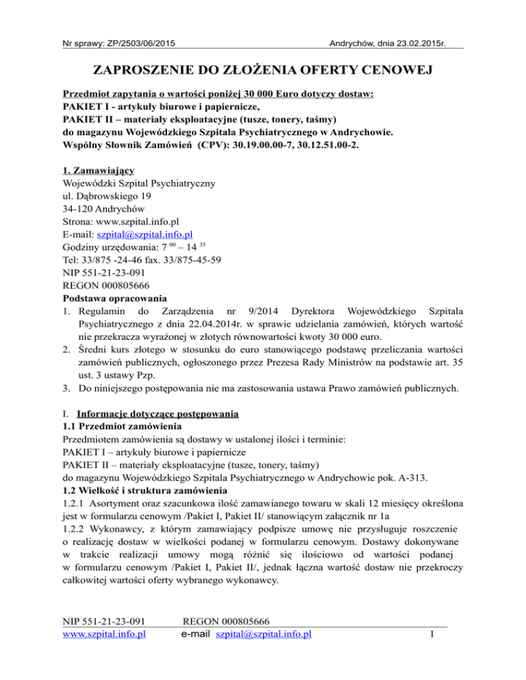 Nr sprawy: ZP/2503/06/2015 Andrychów, dnia 23.02.2015r. ZAPROSZENIE DO ZŁOŻENIA OFERTY CENOWEJ Przedmiot zapytania o wartości poniżej 30 000 Euro dotyczy dostaw: PAKIET I - artykuły biurowe i papiernicze, PAKIET II – materiały eksploatacyjne (tusze, tonery, taśmy) do magazynu Wojewódzkiego Szpitala Psychiatrycznego w Andrychowie. Wspólny Słownik Zamówień (CPV): 30.19.00.00-7, 30.12.51.00-2. 1. Zamawiający Wojewódzki Szpital Psychiatryczny ul. Dąbrowskiego 19 34-120 Andrychów Strona: www.szpital.info.pl E-mail: [email protected] Godziny urzędowania: 7 00 – 14 35 Tel: 33/875 -24-46 fax. 33/875-45-59 NIP 551-21-23-091 REGON 000805666 Podstawa opracowania 1. Regulamin do Zarządzenia nr 9/2014 Dyrektora Wojewódzkiego Szpitala Psychiatrycznego z dnia 22.04.2014r. w sprawie udzielania zamówień, których wartość nie przekracza wyrażonej w złotych równowartości kwoty 30 000 euro. 2. Średni kurs złotego w stosunku do euro stanowiącego podstawę przeliczania wartości zamówień publicznych, ogłoszonego przez Prezesa Rady Ministrów na podstawie art. 35 ust. 3 ustawy Pzp. 3. Do niniejszego postępowania nie ma zastosowania ustawa Prawo zamówień publicznych. I. Informacje dotyczące postępowania 1.1 Przedmiot zamówienia Przedmiotem zamówienia są dostawy w ustalonej ilości i terminie: PAKIET I – artykuły biurowe i papiernicze PAKIET II – materiały eksploatacyjne (tusze, tonery, taśmy) do magazynu Wojewódzkiego Szpitala Psychiatrycznego w Andrychowie pok. A-313. 1.2 Wielkość i struktura zamówienia 1.2.1 Asortyment oraz szacunkowa ilość zamawianego towaru w skali 12 miesięcy określona jest w formularzu cenowym /Pakiet I, Pakiet II/ stanowiącym załącznik nr 1a 1.2.2 Wykonawcy, z którym zamawiający podpisze umowę nie przysługuje roszczenie o realizację dostaw w wielkości podanej w formularzu cenowym. Dostawy dokonywane w trakcie realizacji umowy mogą różnić się ilościowo od wartości podanej w formularzu cenowym /Pakiet I, Pakiet II/, jednak łączna wartość dostaw nie przekroczy całkowitej wartości oferty wybranego wykonawcy. NIP 551-21-23-091 www.szpital.info.pl REGON 000805666 e-mail [email protected] 1 Nr sprawy: ZP/2503/06/2015 Andrychów, dnia 23.02.2015r. 1.3 Warunki dostawy 1.3.1 Wykonawca będzie dostarczał zamówiony towar w godz. od 700 do 1200 na swój koszt w terminie do dwóch dni roboczych po uprzednim złożeniu zamówienia w formie faksu. Ilości i rodzaj dostarczonego towaru ma być zgodny ze złożonym zamówieniem. 1.3.2 Miejscem dostawy jest magazyn Zamawiającego (pok. A-313) znajdujący się w Andrychowie przy ul. Dąbrowskiego 19. Wykonawca dokona również wniesienia zamówionego towaru do magazynu Zamawiającego. 1.3.3 Towar powinien być dostarczony wraz z oryginałem faktury VAT. Pakiet II – materiały eksploatacyjne (tusze, tonery, taśmy) Wykaz urządzeń do których przeznaczony będzie dostarczany materiał eksploatacyjny Drukarki Producent Model Typ Rodzaj materiału eksploatacyjnego zalecany przez producenta urządzenia Brother DCP-J105 Atramentowa LC-529XL-BK (wydajność 2400 stron) LC-525XL, C, M, Y) (wydajność 1300 stron) Canon iP4850 Atramentowa PGI-525PGBK, (wydajność 340 stron) CLI-526BK, C, M, Y (wydajność 500 stron) Canon iP4950 Atramentowa PGI-525PGBK, (wydajność 340 stron) CLI-526BK, C, M, Y (wydajność 500 stron) Canon PIXMA MG 5350 Atramentowa PGI-525PGBK, (wydajność 340 stron) CLI-526BK, C, M, Y (wydajność 500 stron) Canon PIXMA MG 5550 Atramentowa PGI-550PGBK (wydajność 300 stron) CLI-551C (wydajność 345 stron) CLI-551M (wydajność 306 stron) CLI-551Y (wydajność 347 stron) Canon iP7250 Atramentowa PGI-550PGBK (wydajność 300 stron) CLI-551C NIP 551-21-23-091 www.szpital.info.pl REGON 000805666 e-mail [email protected] 2 Nr sprawy: ZP/2503/06/2015 Andrychów, dnia 23.02.2015r. Canon PIXMA MP280 Canon i-sensys MF 4580Dn Atramentowa Laserowa HP DeskJet 3550 Atramentowa HP DeskJet 3650 Atramentowa HP DeskJet 3745 Atramentowa HP DeskJet 3845 Atramentowa HP DeskJet 920C Atramentowa HP LaserJet E-1005 Laserowa HP LaserJet P-1006 Laserowa HP LaserJet M1120n Laserowa HP LaserJet P3005 Laserowa HP LaserJet 1015 Laserowa NIP 551-21-23-091 www.szpital.info.pl REGON 000805666 e-mail [email protected] (wydajność 345 stron) CLI-551M (wydajność 306 stron) CLI-551Y (wydajność 347 stron) PG-510 (wydajność 220 stron) CL-511 (wydajność 244 stron) CRG-728 (wydajność 2100 stron) C8727AE C8727BE (wydajność 280 stron) C8728AE (wydajność 190 stron) C8727AE C8727BE (wydajność 280 stron) C8728AE (wydajność 190 stron) C8727AE C8727BE (wydajność 280 stron) C8728AE (wydajność 190 stron) C8727AE C8727BE (wydajność 280 stron) C8728AE (wydajność 190 stron) C6615DE (wydajność 500 stron) C6578AE (wydajność 990 stron) CB435A (wydajność 1500 stron) CB435A (wydajność 1500 stron) CB436A (wydajność 2000 stron) Q7551A (wydajność 6500 stron) Q2612A 3 Nr sprawy: ZP/2503/06/2015 Andrychów, dnia 23.02.2015r. (wydajność 2000 stron) HP LaserJet 1018 Laserowa HP LaserJet M1132 Laserowa HP LaserJet LJ P1102 Laserowa HP LaserJet Pro 400 M425dn LaserJet 1220 Laserowa SCX-4300 Laserowa HP Samsung Kserokopiarki Producent Minolta Xerox Model Laserowa Typ EP-2030 Laserowa C-118 Laserowa Q2612A (wydajność 2000 stron) CE285A (wydajność 1600 stron) CE285A (wydajność 1600 stron) CF280XD (wydajność 6900 stron) C7115A (wydajność 2500 stron) MLT-D1092S (wydajność 2000 stron) Rodzaj materiału eksploatacyjnego zalecany przez producenta urządzenia Toner 2030 (wydajność 23 000 stron) TXE6R01179BG (wydajność 11 000 stron) 1.3.4. – dostarczone materiały eksploatacyjne muszą być: a) fabrycznie nowe, tonery oryginalne producentów sprzętu lub tonery zamienniki równoważne, wytwarzane ze zużytych tonerów oryginalnych. b) nieużywane, nieregenerowane, nie poddane procesowi ponownego napełnienia, pochodzące z bieżącej produkcji, c) opakowane w oryginalne i