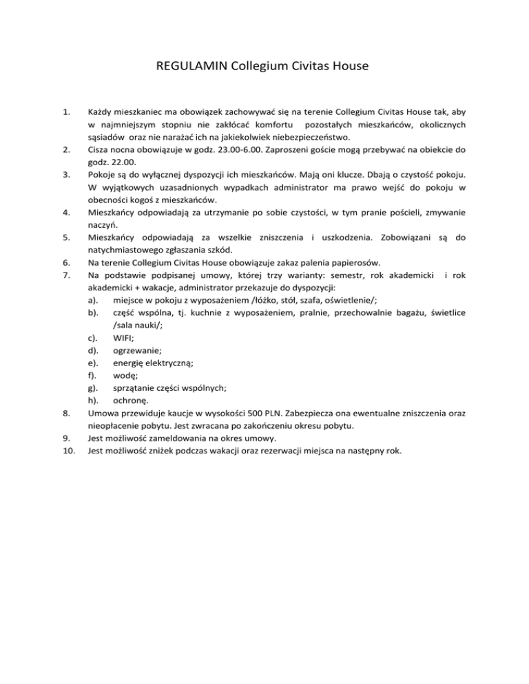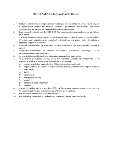 REGULAMIN Collegium Civitas House 1. 2. 3. 4. 5. 6. 7. 8. 9. 10. Każdy mieszkaniec ma obowiązek zachowywać się na terenie Collegium Civitas House tak, aby w najmniejszym stopniu nie zakłócać komfortu pozostałych mieszkańców, okolicznych sąsiadów oraz nie narażać ich na jakiekolwiek niebezpieczeństwo. Cisza nocna obowiązuje w godz. 23.00-6.00. Zaproszeni goście mogą przebywać na obiekcie do godz. 22.00. Pokoje są do wyłącznej dyspozycji ich mieszkańców. Mają oni klucze. Dbają o czystość pokoju. W wyjątkowych uzasadnionych wypadkach administrator ma prawo wejść do pokoju w obecności kogoś z mieszkańców. Mieszkańcy odpowiadają za utrzymanie po sobie czystości, w tym pranie pościeli, zmywanie naczyń. Mieszkańcy odpowiadają za wszelkie zniszczenia i uszkodzenia. Zobowiązani są do natychmiastowego zgłaszania szkód. Na terenie Collegium Civitas House obowiązuje zakaz palenia papierosów. Na podstawie podpisanej umowy, której trzy warianty: semestr, rok akademicki i rok akademicki + wakacje, administrator przekazuje do dyspozycji: a). miejsce w pokoju z wyposażeniem /łóżko, stół, szafa, oświetlenie/; b). część wspólna, tj. kuchnie z wyposażeniem, pralnie, przechowalnie bagażu, świetlice /sala nauki/; c). WIFI; d). ogrzewanie; e). energię elektryczną; f). wodę; g). sprzątanie części wspólnych; h). ochronę. Umowa przewiduje kaucje w wysokości 500 PLN. Zabezpiecza ona ewentualne zniszczenia oraz nieopłacenie pobytu. Jest zwracana po zakończeniu okresu pobytu. Jest możliwość zameldowania na okres umowy. Jest możliwość zniżek podczas wakacji oraz rezerwacji miejsca na następny rok.