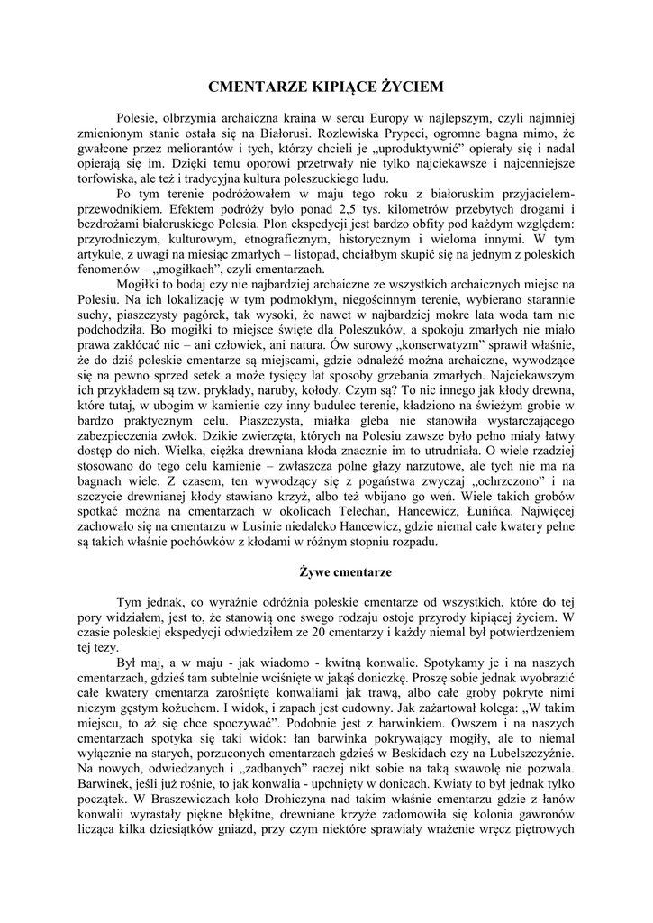 CMENTARZE KIPIĄCE ŻYCIEM Polesie, olbrzymia archaiczna kraina w sercu Europy w najlepszym, czyli najmniej zmienionym stanie ostała się na Białorusi. Rozlewiska Prypeci, ogromne bagna mimo, że gwałcone przez meliorantów i tych, którzy chcieli je „uproduktywnić” opierały się i nadal opierają się im. Dzięki temu oporowi przetrwały nie tylko najciekawsze i najcenniejsze torfowiska, ale też i tradycyjna kultura poleszuckiego ludu. Po tym terenie podróżowałem w maju tego roku z białoruskim przyjacielemprzewodnikiem. Efektem podróży było ponad 2,5 tys. kilometrów przebytych drogami i bezdrożami białoruskiego Polesia. Plon ekspedycji jest bardzo obfity pod każdym względem: przyrodniczym, kulturowym, etnograficznym, historycznym i wieloma innymi. W tym artykule, z uwagi na miesiąc zmarłych – listopad, chciałbym skupić się na jednym z poleskich fenomenów – „mogiłkach”, czyli cmentarzach. Mogiłki to bodaj czy nie najbardziej archaiczne ze wszystkich archaicznych miejsc na Polesiu. Na ich lokalizację w tym podmokłym, niegościnnym terenie, wybierano starannie suchy, piaszczysty pagórek, tak wysoki, że nawet w najbardziej mokre lata woda tam nie podchodziła. Bo mogiłki to miejsce święte dla Poleszuków, a spokoju zmarłych nie miało prawa zakłócać nic – ani człowiek, ani natura. Ów surowy „konserwatyzm” sprawił właśnie, że do dziś poleskie cmentarze są miejscami, gdzie odnaleźć można archaiczne, wywodzące się na pewno sprzed setek a może tysięcy lat sposoby grzebania zmarłych. Najciekawszym ich przykładem są tzw. prykłady, naruby, kołody. Czym są? To nic innego jak kłody drewna, które tutaj, w ubogim w kamienie czy inny budulec terenie, kładziono na świeżym grobie w bardzo praktycznym celu. Piaszczysta, miałka gleba nie stanowiła wystarczającego zabezpieczenia zwłok. Dzikie zwierzęta, których na Polesiu zawsze było pełno miały łatwy dostęp do nich. Wielka, ciężka drewniana kłoda znacznie im to utrudniała. O wiele rzadziej stosowano do tego celu kamienie – zwłaszcza polne głazy narzutowe, ale tych nie ma na bagnach wiele. Z czasem, ten wywodzący się z pogaństwa zwyczaj „ochrzczono” i na szczycie drewnianej kłody stawiano krzyż, albo też wbijano go weń. Wiele takich grobów spotkać można na cmentarzach w okolicach Telechan, Hancewicz, Łunińca. Najwięcej zachowało się na cmentarzu w Lusinie niedaleko Hancewicz, gdzie niemal całe kwatery pełne są takich właśnie pochówków z kłodami w różnym stopniu rozpadu. Żywe cmentarze Tym jednak, co wyraźnie odróżnia poleskie cmentarze od wszystkich, które do tej pory widziałem, jest to, że stanowią one swego rodzaju ostoje przyrody kipiącej życiem. W czasie poleskiej ekspedycji odwiedziłem ze 20 cmentarzy i każdy niemal był potwierdzeniem tej tezy. Był maj, a w maju - jak wiadomo - kwitną konwalie. Spotykamy je i na naszych cmentarzach, gdzieś tam subtelnie wciśnięte w jakąś doniczkę. Proszę sobie jednak wyobrazić całe kwatery cmentarza zarośnięte konwaliami jak trawą, albo całe groby pokryte nimi niczym gęstym kożuchem. I widok, i zapach jest cudowny. Jak zażartował kolega: „W takim miejscu, to aż się chce spoczywać”. Podobnie jest z barwinkiem. Owszem i na naszych cmentarzach spotyka się taki widok: łan barwinka pokrywający mogiły, ale to niemal wyłącznie na starych, porzuconych cmentarzach gdzieś w Beskidach czy na Lubelszczyźnie. Na nowych, odwiedzanych i „zadbanych” raczej nikt sobie na taką swawolę nie pozwala. Barwinek, jeśli już rośnie, to jak konwalia - upchnięty w donicach. Kwiaty to był jednak tylko początek. W Braszewiczach koło Drohiczyna nad takim właśnie cmentarzu gdzie z łanów konwalii wyrastały piękne błękitne, drewniane krzyże zadomowiła się kolonia gawronów licząca kilka dziesiątków gniazd, przy czym niektóre sprawiały wrażenie wręcz piętrowych albo połączonych ze sobą. Obok, co się bardzo rzadko zdarza, na wyniosłym drzewie znajdowało się gniazdo najprawdopodobniej kruka, bo młode, lotne już kruki latały wokół niego metalicznie kracząc. Najciekawszym jednak spotkaniem z cmentarnym krukiem było to na cmentarzu w Łyszczy pod Pińskiem. Dojechaliśmy tam pochmurnym popołudniem przejeżdżając rzeczkę o mile brzmiącej nazwie Wiślica. Ciemne chmury wisiały nad cudnie błękitną drewnianą cerkiewką. Z pobliskiego cmentarza, pełnego grobów pińskiej szlachty, porośniętych, a jakże, barwinkiem, zrazu dochodził tylko delikatny śpiew samca pleszki. Kolorowy ptak wywodził nad drewnianą kaplicą. Wkrótce jednak zamilkł, a w jego miejsce dało się słyszeć donośny krakanie kruka. Weszliśmy na cmentarz, by obejrzeć nagrobki. Młody kruk siedział na jednym z drzew i bezczelnie krakał, niewiele sobie robiąc z naszej obecności. Chodziliśmy po cmentarzu odczytując napisy po polsku i rosyjsku na starych szlacheckich grobach, a ptak podrywał się i krążył nad cmentarzem ze złowieszczym krakaniem. Zjawisko było z gatunku tych budzących grozę: stary cmentarz, rozwalające się krzyże, pułap ciężkich i ciemnych chmur i to donośne, przeszywające krakanie. Wioska Bobryk, to przysłowiowe „cztery chaty na krzyż” na granicach rejonów pińskiego i hancewickiego. Pewnie dlatego jakiś wesołek dopisał na tablicy z nazwą wioski napis „City”. Nazwę swą wzięła od nazwy rzeki przezeń przepływającej a nazwy rzeki możemy się nieomylnie domyślać. Bobrycki cmentarz to „poleska klasyka” – „chołm” piaszczysty wynoszący się kilka metrów nad otaczający teren. Na nim oczywiście łany kwitnących konwalii i sosny. Z jednej z nich dochodził delikatny, ale dobrze słyszalny pisk. Odnaleźliśmy ją. Na wysokości kilku metrów znajdowała się w niej dziupla a w niej zadomowiły się nietoperze. Chatynicze to duża wieś kilkanaście kilometrów na południe od Hancewicz. Pełn