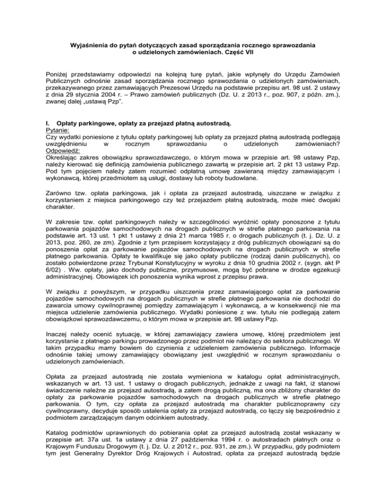 Wyjaśnienia do pytań dotyczących zasad sporządzania rocznego sprawozdania o udzielonych zamówieniach. Część VII Poniżej przedstawiamy odpowiedzi na kolejną turę pytań, jakie wpłynęły do Urzędu Zamówień Publicznych odnośnie zasad sporządzania rocznego sprawozdania o udzielonych zamówieniach, przekazywanego przez zamawiających Prezesowi Urzędu na podstawie przepisu art. 98 ust. 2 ustawy z dnia 29 stycznia 2004 r. – Prawo zamówień publicznych (Dz. U. z 2013 r., poz. 907, z późn. zm.), zwanej dalej „ustawą Pzp”. I. Opłaty parkingowe, opłaty za przejazd płatną autostradą. Pytanie: Czy wydatki poniesione z tytułu opłaty parkingowej lub opłaty za przejazd płatną autostradą podlegają uwzględnieniu w rocznym sprawozdaniu o udzielonych zamówieniach? Odpowiedź: Określając zakres obowiązku sprawozdawczego, o którym mowa w przepisie art. 98 ustawy Pzp, należy kierować się definicją zamówienia publicznego zawartą w przepisie art. 2 pkt 13 ustawy Pzp. Pod tym pojęciem należy zatem rozumieć odpłatną umowę zawieraną między zamawiającym i wykonawcą, której przedmiotem są usługi, dostawy lub roboty budowlane. Zarówno tzw. opłata parkingowa, jak i opłata za przejazd autostradą, uiszczane w związku z korzystaniem z miejsca parkingowego czy też przejazdem płatną autostradą, może mieć dwojaki charakter. W zakresie tzw. opłat parkingowych należy w szczególności wyróżnić opłaty ponoszone z tytułu parkowania pojazdów samochodowych na drogach publicznych w strefie płatnego parkowania na podstawie art. 13 ust. 1 pkt 1 ustawy z dnia 21 marca 1985 r. o drogach publicznych (t. j. Dz. U. z 2013, poz. 260, ze zm). Zgodnie z tym przepisem korzystający z dróg publicznych obowiązani są do ponoszenia opłat za parkowanie pojazdów samochodowych na drogach publicznych w strefie płatnego parkowania. Opłaty te kwalifikuje się jako opłaty publiczne (rodzaj danin publicznych), co zostało potwierdzone przez Trybunał Konstytucyjny w wyroku z dnia 10 grudnia 2002 r. (sygn. akt P 6/02) . Ww. opłaty, jako dochody publiczne, przymusowe, mogą być pobrane w drodze egzekucji administracyjnej. Obowiązek ich ponoszenia wynika wprost z przepisu prawa. W związku z powyższym, w przypadku uiszczenia przez zamawiającego opłat za parkowanie pojazdów samochodowych na drogach publicznych w strefie płatnego parkowania nie dochodzi do zawarcia umowy cywilnoprawnej pomiędzy zamawiającym i wykonawcą, a w konsekwencji nie ma miejsca udzielenie zamówienia publicznego. Wydatki poniesione z ww. tytułu nie podlegają zatem obowiązkowi sprawozdawczemu, o którym mowa w przepisie art. 98 ustawy Pzp. Inaczej należy ocenić sytuację, w której zamawiający zawiera umowę, której przedmiotem jest korzystanie z płatnego parkingu prowadzonego przez podmiot nie należący do sektora publicznego. W takim przypadku mamy bowiem do czynienia z udzieleniem zamówienia publicznego. Informacje odnośnie takiej umowy zamawiający obowiązany jest uwzględnić w rocznym sprawozdaniu o udzielonych zamówieniach. Opłata za przejazd autostradą nie została wymieniona w katalogu opłat administracyjnych, wskazanych w art. 13 ust. 1 ustawy o drogach publicznych, jednakże z uwagi na fakt, iż stanowi świadczenie należne za przejazd autostradą, a zatem drogą publiczną, ma ona zbliżony charakter do opłaty za parkowanie pojazdów samochodowych na drogach publicznych w strefie płatnego parkowania. O tym, czy opłata za przejazd autostradą ma charakter publicznoprawny czy cywilnoprawny, decyduje sposób ustalenia opłaty za przejazd autostradą, co łączy się bezpośrednio z podmiotem zarządzającym danym odcinkiem autostrady. Katalog podmiotów uprawnionych do pobierania opłat za przejazd autostradą został wskazany w przepisie art. 37a ust. 1a ustawy z dnia 27 października 1994 r. o autostradach płatnych oraz o Krajowym Funduszu Drogowym (t. j. Dz. U. z 2012 r., poz. 931, ze zm.). W przypadku, gdy podmiotem tym jest Generalny Dyrektor Dróg Krajowych i Autostrad, opłata za przejazd autostradą będzie stanowić opłatę publiczną, gdyż Generalny Dyrektor Dróg Krajowych i Autostrad jest organem administracji publicznej, a wysokość opłaty ustalona jest przepisami prawa powszechnie obowiązującego – rozporządzenia Ministra Infrastruktury i Rozwoju (wcześniej Ministra Transportu, Budownictwa i Gospodarki Morskiej). Wydatek poniesiony przez zamawiającego tytułem uiszczenia ww. opłaty nie będzie zatem podlegać uwzględnieniu w rocznym sprawozdaniu o udzielonych zamówieniach. W tym przypadku nie dochodzi bowiem do udzielenia zamówienia publicznego. Podmiotem pobierającym opłaty za przejazd autostradą może być spółka, z którą Generalny Dyrektor Dróg Krajowych i Autostrad albo drogowa spółka specjalnego przeznaczenia zawarli umowę o budowę i eksploatację, na warunkach określonych w tej umowie. Zgodnie z przepisem art. 37b ust. 1 ustawy o autostradach płatnych oraz o Krajowym Funduszu Drogowym opłaty za przejazd autostradą pobrane przez spółkę co do zasady stanowią jej przychód. W tym przypadku opłaty za przejazd autostradą stanowią świadczenie uiszczane na podstawie umowy odpłatnej zawieranej z użytkownikiem autostrady na zasadach określonych regulaminem korzystania z autostrady, zgodnie z przepisami Kodeksu cywilnego. W przypadku zatem uiszczania przez zamawiającego opłaty za przejazd autostradą na rzecz ww. spółki, dochodzi do udzielenia zamówienia publicznego w rozumieniu przepisu art. 2 pkt 13 ustawy Pzp, a zatem wartość wydatków poniesionych z tego tytułu będzie podlegała uwzględnieniu w rocznym sprawozdaniu. II. Nabycie nieruchomości na podstawie decyzji o zezwoleniu na realizację inwestycji drogowej. Pytanie: Czy nabycie nieruchomości na podstawie decyzji o zezwoleniu na realizację inwestycji drogowej zgodnie z przepisami ustawy z dnia 10 kwietnia 2003 r. o szczególnych zasada