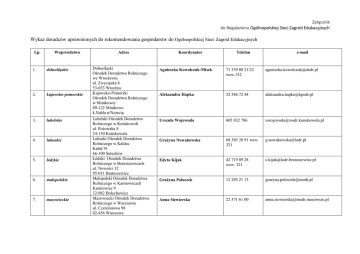 Załącznik do Regulaminu Ogólnopolskiej Sieci Zagród Edukacyjnych Wykaz doradców uprawnionych do rekomendowania gospodarstw do Ogólnopolskiej Sieci Zagród Edukacyjnych Lp. Województwo 1. dolnośląskie 2. kujawsko-pomorskie 3. lubelskie 4. lubuskie 5. łódzkie 6. małopolskie 7. mazowieckie Adres Dolnośląski Ośrodek Doradztwa Rolniczego we Wrocławiu ul. Zwycięska 8 53-033 Wrocław Kujawsko-Pomorski Ośrodek Doradztwa Rolniczego w Minikowie 89-122 Minikowo k.Nakła n/Notecią Lubelski Ośrodek Doradztwa Rolniczego w Końskowoli ul. Pożowska 8 24-130 Końskowola Lubuski Ośrodek Doradztwa Rolniczego w Kalsku Kalsk 91 66-100 Sulechów Łódzki Ośrodek Doradztwa Rolniczego w Bratoszewicach ul. Nowości 32 95-011 Bratoszewice Małopolski Ośrodek Doradztwa Rolniczego w Karniowicach Karniowice 9 32-082 Bolechowice Mazowiecki Ośrodek Doradztwa Rolniczego w Warszawie ul. Czereśniowa 98 02-456 Warszawa Koordynator Telefon e-mail Agnieszka Kowalczuk-Misek 71 339 80 21/22 wew.152 [email protected] Aleksandra Hapka 52 386 72 44 [email protected] Urszula Wojewoda 605 832 786 [email protected] Grażyna Nowakowska 68 385 20 91 wew. 321 [email protected] Edyta Kijak 42 719 89 28 wew. 321 [email protected] Grażyna Poloczek 12 285 21 13 [email protected] Anna Siewierska 22 571 61 00 [email protected] 8. opolskie 9. podkarpackie 10. podlaskie 11. pomorskie 12. śląskie 13. świętokrzyskie 14. warmińsko-mazurskie 15. wielkopolskie 16. zachodniopomorskie Opolski Ośrodek Doradztwa Rolniczego w Łosiowie ul. Główna 1 49-330 Łosiów Podkarpacki Ośrodek Doradztwa Rolniczego w Boguchwale ul. Tkaczowa 146 36-040 Boguchwała Podlaski Ośrodek Doradztwa Rolniczego w Szepietowie 18-210 Szepietowo Pomorski Ośrodek Doradztwa Rolniczego w Gdańsku Trakt św. Wojciecha 293 80-001 Gdańsk Śląski Ośrodek Doradztwa Rolniczego w Częstochowie ul. Wyszyńskiego 70/126 42-200 Częstochowa Świętokrzyski Ośrodek Doradztwa Rolniczego w Modliszewicach ul. Piotrkowska 30 26-200 Końskie Modliszewice Warmińsko-Mazurski Ośrodek Doradztwa Rolniczego w Olsztynie Ul. Jagiellońska 91 10-356 Olsztyn Wielkopolski Ośrodek Doradztwa Rolniczego w Poznaniu ul. Sieradzka 29 60-163 Poznań Zachodniopomorski Ośrodek Doradztwa Rolniczego w Barzkowicach 73-134 Barzkowice Ewa Klekot 77 412 53 27 wew. 259, 260 [email protected] Janina Kamińską 17 870 15 56 [email protected] Joanna Czarkowska 86 275 89 10 [email protected] Barbara Ditrich 58 326 39 14 [email protected] Beata Fąfera 34 377 01 00 [email protected] Renata Rosiek 34 377 01 19 [email protected] Teresa Wąsik 41 372 22 84 [email protected] Katarzyna Podbielska 89 526 44 39 wew. 49 [email protected] Wiktoria Maciejewska 61 863 04 18 [email protected] Izabela Dudzińska-Krawczyk 94 341 87 38 [email protected] Ewelina Pawłowicz 94 479 40 29 [email protected]