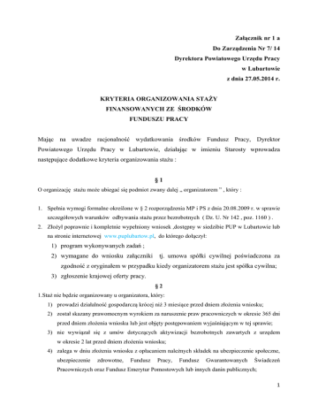 Załącznik nr 1 a Do Zarządzenia Nr 7/ 14 Dyrektora Powiatowego Urzędu Pracy w Lubartowie z dnia 27.05.2014 r. KRYTERIA ORGANIZOWANIA STAŻY FINANSOWANYCH ZE ŚRODKÓW FUNDUSZU PRACY Mając na uwadze racjonalność wydatkowania środków Fundusz Pracy, Dyrektor Powiatowego Urzędu Pracy w Lubartowie, działając w imieniu Starosty wprowadza następujące dodatkowe kryteria organizowania stażu : §1 O organizację stażu może ubiegać się podmiot zwany dalej „ organizatorem ” , który : 1. Spełnia wymogi formalne określone w § 2 rozporządzenia MP i PS z dnia 20.08.2009 r. w sprawie szczegółowych warunków odbywania stażu przez bezrobotnych ( Dz. U. Nr 142 , poz. 1160 ) . 2. Złożył poprawnie i kompletnie wypełniony wniosek ,dostępny w siedzibie PUP w Lubartowie lub na stronie internetowej www.puplubartow.pl, do którego dołączył: 1) program wykonywanych zadań ; 2) wymagane do wniosku załączniki tj. umowa spółki cywilnej poświadczona za zgodność z oryginałem w przypadku kiedy organizatorem stażu jest spółka cywilna; 3) zgłoszenie krajowej oferty pracy. §2 1.Staż nie będzie organizowany u organizatora, który: 1) prowadzi działalność gospodarczą krócej niż 3 miesiące przed dniem złożenia wniosku; 2) został skazany prawomocnym wyrokiem za naruszenie praw pracowniczych w okresie 365 dni przed dniem złożenia wniosku lub jest objęty postępowaniem wyjaśniającym w tej sprawie; 3) nie wywiązał się z umów dotyczących aktywizacji bezrobotnych zawartych z urzędem w okresie 2 lat przed dniem złożenia wniosku; 4) zalega w dniu złożenia wniosku z opłacaniem należnych składek na ubezpieczenie społeczne, ubezpieczenie zdrowotne, Fundusz Pracy, Fundusz Gwarantowanych Świadczeń Pracowniczych oraz Fundusz Emerytur Pomostowych lub innych danin publicznych; 1 5) posiada w dniu złożenia wniosku nieuregulowane w terminie zobowiązania cywilnoprawne lub toczy się w stosunku do niego postępowanie upadłościowe lub został zgłoszony wniosek o likwidację. 3. Wyklucza się organizowania staży w zawodzie kierowcy oraz na stanowiskach związanych z wykonywaniem handlu obwoźnego oraz na bazarach i targowiskach z zastrzeżeniem pkt 4. 4. Dopuszcza się organizowanie stażu u organizatora prowadzącego działalność handlową na bazarach i targowiskach w stałych punktach handlowych. §3 1. Do odbycia stażu mogą być kierowane osoby zarejestrowane w Urzędzie jako osoby bezrobotne i dla których został ustalony II profil pomocy. 2. Na staż mogą być kierowani bezrobotni, dla których został ustalony III profil pomocy, w przypadku realizowania programu specjalnego. 3. Okres odbywania stażu realizowany zgodnie wynosi od 3-6 miesięcy z możliwością przedłużenia do 12 miesięcy, w szczególnie uzasadnionych przypadkach dla osób bezrobotnych, którzy nie ukończyli 30 roku życia. 4. Starosta może kierować na badania lekarskie kandydatów na staż oraz dokonywać zwrotu kosztów przejazdu do miejsca odbywania stażu i powrotu do miejsca zamieszkania w miarę posiadania środków z Funduszu Pracy. 5. Organizator może we wniosku wskazać imię i nazwisko bezrobotnego , którego przyjmie na staż, pod warunkiem spełnienia przez bezrobotnego określonego profilu pomocy. §4 1. Staże organizowane są przede wszystkim na terenie działania tutejszego Urzędu Pracy oraz u organizatorów deklarujących zatrudnienie stażysty po odbyciu stażu na co najmniej 3 miesiące. 2. W szczególnych i uzasadnionych przypadkach Dyrektor Powiatowego Urzędu Pracy działający w imieniu Starosty może zezwolić na odbywanie stażu poza terenem powiatu lubartowskiego lub odstąpić od warunku zatrudnienia. §5 Wnioski na staż będą realizowane do czasu wyczerpania się limitu środków finansowanych z Funduszu Pracy przeznaczonych na ten cel . §6 Niniejsze kryteria wchodzą w życie od 27 maja 2014 r. i obowiązują do odwołania. 2 3