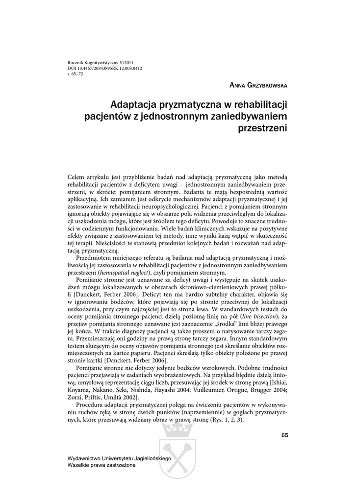 Rocznik Kognitywistyczny V/2011 DOI 10.4467/20843895RK.12.008.0412 s. 65–72 ANNA GRZYBKOWSKA Adaptacja pryzmatyczna w rehabilitacji pacjentów z jednostronnym zaniedbywaniem przestrzeni Celem artykułu jest przybliżenie badań nad adaptacją pryzmatyczną jako metodą rehabilitacji pacjentów z deficytem uwagi – jednostronnym zaniedbywaniem przestrzeni, w skrócie: pomijaniem stronnym. Badania te mają bezpośrednią wartość aplikacyjną. Ich zamiarem jest odkrycie mechanizmów adaptacji pryzmatycznej i jej zastosowanie w rehabilitacji neuropsychologicznej. Pacjenci z pomijaniem stronnym ignorują obiekty pojawiające się w obszarze pola widzenia przeciwległym do lokalizacji uszkodzenia mózgu, które jest źródłem tego deficytu. Powoduje to znaczne trudności w codziennym funkcjonowaniu. Wiele badań klinicznych wskazuje na pozytywne efekty związane z zastosowaniem tej metody, inne wyniki każą wątpić w skuteczność tej terapii. Nieścisłości te stanowią przedmiot kolejnych badań i rozważań nad adaptacją pryzmatyczną. Przedmiotem niniejszego referatu są badania nad adaptacją pryzmatyczną i możliwością jej zastosowania w rehabilitacji pacjentów z jednostronnym zaniedbywaniem przestrzeni (hemispatial neglect), czyli pomijaniem stronnym. Pomijanie stronne jest uznawane za deficyt uwagi i występuje na skutek uszkodzeń mózgu lokalizowanych w obszarach skroniowo-ciemieniowych prawej półkuli [Danckert, Ferber 2006]. Deficyt ten ma bardzo subtelny charakter, objawia się w ignorowaniu bodźców, które pojawiają się po stronie przeciwnej do lokalizacji uszkodzenia, przy czym najczęściej jest to strona lewa. W standardowych testach do oceny pomijania stronnego pacjenci dzielą poziomą linię na pół (line bisection); za przejaw pomijania stronnego uznawane jest zaznaczenie „środka” linii bliżej prawego jej końca. W trakcie diagnozy pacjenci są także proszeni o narysowanie tarczy zegara. Przemieszczają oni godziny na prawą stronę tarczy zegara. Innym standardowym testem służącym do oceny objawów pomijania stronnego jest skreślanie obiektów rozmieszczonych na kartce papieru. Pacjenci skreślają tylko obiekty położone po prawej stronie kartki [Danckert, Ferber 2006]. Pomijanie stronne nie dotyczy jedynie bodźców wzrokowych. Podobne trudności pacjenci przejawiają w zadaniach wyobrażeniowych. Na przykład błędnie dzielą liniową, umysłową reprezentację ciągu liczb, przesuwając jej środek w stronę prawą [Ishiai, Koyama, Nakano, Seki, Nishida, Hayashi 2004; Vuilleumier, Ortigue, Brugger 2004; Zorzi, Priftis, Umiltà 2002]. Procedura adaptacji pryzmatycznej polega na ćwiczeniu pacjentów w wykonywaniu ruchów ręką w stronę dwóch punktów (naprzemiennie) w goglach pryzmatycznych, które przesuwają widziany obraz w prawą stronę (Rys. 1, 2, 3). 65 Wydawnictwo Uniwersytetu Jagiellońskiego Wszelkie prawa zastrzeżone ANNA GRZYBKOWSKA Rysunek 1. Przyrząd służący do adaptacji pryzmatycznej Rysunek 2. Przesunięcie obrazu wzrokowego za pomocą gogli pryzmatycznych 66 Wydawnictwo Uniwersytetu Jagiellońskiego Wszelkie prawa zastrzeżone Adaptacja pryzmatyczna w rehabilitacji pacjentów z jednostronnym zaniedbywaniem przestrzeni Rysunek 3. Gogle pryzmatyczne Początkowo, wykonując zadanie wskazywania, pacjenci popełniają błędy. Z czasem jednak wykonują to zadanie poprawnie, co stanowi przejaw zaadaptowania się do przesunięcia obrazu wywołanego przez gogle. Aby poprawnie wskazać punkty, pacjent musi dokonać korekty ruchu ręki w lewą stronę. Ta korekta jest uznawana za źródło pozytywnych efektów terapeutycznych adaptacji pryzmatycznej obserwowanych po zdjęciu gogli. Zdaniem Jamesa Danckerta i Susanne Ferber [2006] gogle pryzmatyczne indukują błąd (przesunięcie w prawą stronę), którego korekta zmniejsza błąd wywołany przez uszkodzenie mózgu. Ponadto zastosowanie gogli zwiększa liczbę ruchów gałek ocznych w lewą stronę. W ten sposób gogle wpływają na zachowania motoryczne niezbędne do świadomego spostrzegania bodźców (eksploracja). Według Yves’a Rossettiego [Rossetti, Rode, Pisella, Farnè, Li, Boisson, Perenin 1998] i Gilles’a Rode’a [Rode, Rossetti, Li, Boisson 1998] pozytywne oddziaływania adaptacji pryzmatycznej są wynikiem stymulacji zmian plastycznych w mózgu. Procesy te są inicjowane dzięki zasygnalizowaniu błędu w konstrukcji przestrzeni wywołanego przez uszkodzenie mózgu. Uszkodzenie to odpowiada również za brak świadomości deficytu uwagi. Sygnał błędu pochodzi z rozbieżności pomiędzy konstruowaną reprezentacją przestrzeni a rezultatami działania w tej przestrzeni. Adaptacja pryzmatyczna sygnalizuje zatem błąd i skłania do jego korekty – zmian plastycznych i przekształceń w obrębie wyższorzędowej reprezentacji przestrzeni. Według Andrei Serino i współpracowników [Serino, Angeli, Frassinetti, Làdavas 2006] korekta ruchu ręki w lewą stronę pociąga za sobą odchylenie całego systemu okulomotorycznego, które jest następnie wzmacniane przez środowisko pacjenta (zapewnia sprawne funkcjonowanie w przestrzeni). Z kolei Gordon M. Redding i Benjamin Wallace [2003, 2004, 2006] wyodrębniają dwa mechanizmy odpowiedzialne za pozytywne efekty adaptacji pryzmatycznej: kalibrację (calibration) i ponowne dopasowanie (realignment). Kalibracja polega na 67 Wydawnictwo Uniwersytetu Jagiellońskiego Wszelkie prawa zastrzeżone ANNA GRZYBKOWSKA modyfikacji wykonywanego ruchu w przypadku zaistnienia nowych okoliczności w celu zwiększenia jego precyzji (przejawia się w poprawie wykonania zadania wskazywania). Dopasowanie (alignment) polega na przekształceniu poleceń motorycznych wydawanych w obrębie jednego systemu koordynatów sensoryczno-motorycznych, czyli sposobów reprezentowania przestrzeni, na inny system, z uwzględnieniem różnic pomiędzy nimi. Przestrzeń jest reprezentowana w wielu systemach odniesienia: oko, głowa, tułów, r