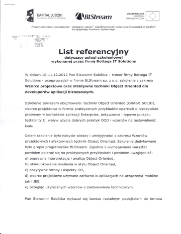 Szkolenie zakresem obejmowałol techniki Object Oriented (GRASą SOLID),