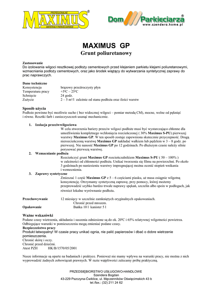 MAXIMUS GP Grunt poliuretanowy Zastosowanie Do izolowania wilgoci resztkowej podłoży cementowych przed klejeniem parkietu klejami poliuretanowymi, wzmacniania podłoży cementowych, oraz jako środek wiążący do wytwarzania syntetycznej zaprawy do prac naprawczych. Dane techniczne Konsystencja Temperatura pracy Schnięcie Zużycie brązowy przeźroczysty płyn +50C – 250C 24 godz. 2 – 5 m2/l zależnie od stanu podłoża oraz ilości warstw Sposób użycia Podłoże powinno być możliwie suche ( bez widocznej wilgoci – pomiar metodą CM), mocne, wolne od pęknięć i równe. Resztki farb i zanieczyszczeń usunąć mechanicznie. 1. 2. 3. Izolacja przeciwwilgociowa W celu stworzenia bariery przeciw wilgoci podłoże musi być wystarczająco chłonne dla umożliwienia kompletnego wchłonięcia rozcieńczonej ( 30% Maximus S-PU) pierwszej warstwy Maximus GP. W ten sposób zostaje zapewniona skutecznie przyczepność. Drugą nierozcieńczoną warstwę Maximus GP nakładać wałkiem lub pędzlem w 3 – 8 godz. po pierwszej. Nie nanosić Maximus GP po 12 godzinach. Po dłuższym czasie należy silnie porysować pierwszą warstwę. Wzmacnianie podłoża Rozcieńczyć grunt Maximus GP rozcieńczalnikiem Maximus S-PU ( 50 – 100% ) w zależności od chłonności podłoża. Unikać tworzenia się filmu na powierzchni. Po około 3 godzinach po naniesieniu warstwy impregnującej można ocenić stopień wnikania i wzmocnienia. Zaprawy syntetyczne Zmieszać 1 część Maximus GP z 5 – 6 częściami piasku, aż masa osiągnie wilgotną konsystencję. Otrzymamy syntetyczną zaprawę, przy pomocy, której możemy przeprowadzić szybko bardzo trwałe naprawy spękań, szczelin albo spoin w podłogach, jak również lokalne wyrównanie podłoża. Przechowywanie Opakowanie 12 miesięcy w szczelnie zamkniętych oryginalnych opakowaniach. Chronić przed mrozem. Bańka 10 l kanister 5 l Ważne wskazówki Podane czasy wietrzenia, układania i suszenia odniesione są do ok. 200C i 65% relatywnej wilgotności powietrza. Odbiegające warunki w pomieszczeniu mogą zmieniać podane czasy. Bezpieczeństwo pracy Produkt łatwopalny! W czasie pracy unikać ognia, nie palić papierosów i dbać o dobre wietrzenie pomieszczenia. Chronić skórę i oczy. Chronić przed dziećmi. Atest PZH HK/B/1570/05/2001 Nasze informacje są oparte na badaniach i praktyce. Ponieważ nie mamy wpływu na warunki pracy, nie można z nich wyprowadzić żadnych zobowiązań prawnych. W razie wątpliwości zalecamy próbę praktyczną. PRZEDSIĘBIORSTWO USŁUGOWO-HANDLOWE Szendera Bogdan 43-229 Pszczyna-Ćwiklice, ul. Męczenników Oświęcimskich 43 b tel./fax.: (32) 211 24 62