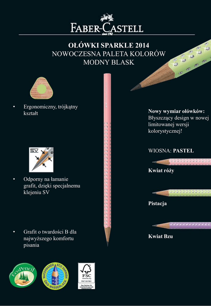 OŁÓWKI SPARKLE 2014 NOWOCZESNA PALETA KOLORÓW MODNY BLASK • Ergonomiczny, trójkątny kształt Nowy wymiar ołówków: Błyszczący design w nowej limitowanej wersji kolorystycznej! WIOSNA: PASTEL Kwiat róży • Odporny na łamanie grafit, dzięki specjalnemu klejeniu SV Pistacja • Grafit o twardości B dla najwyższego komfortu pisania Kwiat Bzu OŁÓWKI SPARKLE PASTEL 2014 DISPLAY’E NA KOLORY SEZONU • Atrakcyjna paleta kolorystyczna: wiosna: “pastel“ Wiosna: 3 przyjemne pastelowe kolory: kwiat bzu, pistacja oraz kwiat róży • Wszystkie ołówki z modnym i błyszczącym efektem SPARKLE • Piękne pastelowe kolory doskonale pasują do wiosennej pory. Najmodniejsze i wyjątkowe kolory w wiosennej palecie kolorystycznej! Wiosna: “pastel“ • Każda paleta kolorystyczna posiada 3 pojedyncze kolory ołówków w pojemnikach plexi, dając łącznie 144 szt. ołówków (48 szt. w pojedynczym pojemniku) • Nr art. 11 83 23 Wymiary: Szer. 80 mm Wys. 177 mm Głęb. 80 mm Cena det. netto Cena det. brutto Cena det. netto w display’u 568,80 zł 699,62 zł 3,95 zł FC118355 Ołówek SPARKLE PASTEL 2014, kwiat róży, 12 szt. 3,95 zł / szt. 4,86 zł / szt. - FC118353 Ołówek SPARKLE PASTEL 2014, pistacja, 12 szt. 3,95 zł / szt. 4,86 zł / szt. - FC118359 Ołówek SPARKLE PASTEL, kwiat bzu, 12 szt. 3,95 zł / szt 4,86 zł / szt. - Nr art. Nazwa FC118323 3 x 48 szt. ołówków SPARKLE PASTEL 2014 W ulotce podano sugerowane ceny detaliczne netto/brutto. Primo Polska S.A.ul. Studencka 31 lok. 2 02-735 Warszawatel. 22 8524510 E-mail: [email protected] www.primo-polska.pl