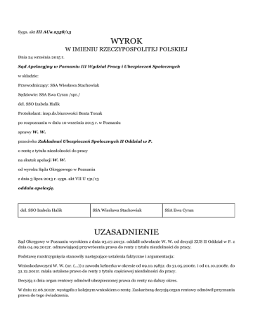 Sygn. akt III AUa 2358/13 WYROK W IMIENIU RZECZYPOSPOLITEJ POLSKIEJ Dnia 24 września 2015 r. Sąd Apelacyjny w Poznaniu III Wydział Pracy i Ubezpieczeń Społecznych w składzie: Przewodniczący: SSA Wiesława Stachowiak Sędziowie: SSA Ewa Cyran /spr./ del. SSO Izabela Halik Protokolant: insp.ds.biurowości Beata Tonak po rozpoznaniu w dniu 10 września 2015 r. w Poznaniu sprawy W. W. przeciwko Zakładowi Ubezpieczeń Społecznych II Oddział w P. o rentę z tytułu niezdolności do pracy na skutek apelacji W. W. od wyroku Sądu Okręgowego w Poznaniu z dnia 3 lipca 2013 r. sygn. akt VII U 131/13 oddala apelację. del. SSO Izabela Halik SSA Wiesława Stachowiak SSA Ewa Cyran UZASADNIENIE Sąd Okręgowy w Poznaniu wyrokiem z dnia 03.07.2013r. oddalił odwołanie W. W. od decyzji ZUS II Oddział w P. z dnia 04.09.2012r. odmawiającej przywrócenia prawa do renty z tytułu niezdolności do pracy. Podstawę rozstrzygnięcia stanowiły następujące ustalenia faktyczne i argumentacja: Wnioskodawczyni W. W. (ur. (...)) z zawodu kelnerka w okresie od 09.10.1985r. do 31.05.2006r. i od 01.10.2008r. do 31.12.2011r. miała ustalone prawo do renty z tytułu częściowej niezdolności do pracy. Decyzją z dnia organ rentowy odmówił ubezpieczonej prawa do renty na dalszy okres. W dniu 12.06.2012r. wystąpiła z kolejnym wnioskiem o rentę. Zaskarżoną decyzją organ rentowy odmówił przyznania prawa do tego świadczenia. Sąd Okręgowy rozpoznając odwołanie wnioskodawczyni przeprowadził dowód z opinii laryngologa, psychologa, psychiatry, ortopedy i neurologa. Biegli rozpoznali u badanej sprawność umysłową na pograniczu normy i upośledzenia, psychologiczne wykładniki organicznych zmian w obrębie CUN – w niewielkim stopniu nasilenia, zaburzenia sfery emocjonalno-motywacyjnej, postawę agrawacyjną, przewlekłe zaburzenia rzekomo nerwicowe nieznacznie upośledzające sprawność, obustronny niedosłuch średniego stopnia z szumami usznymi, zespół cerebrestaniczny po przebytym w 1979r. urazie czaszkowomózgowym, przebyte w 1979r. złamanie obojczyka prawego bez upośledzenia funkcji, zespół bólowy szyjny i lędźwiowy u osoby z początkowymi zmianami zwyrodnieniowymi kręgosłupa szyjnego i lędźwiowo- krzyżowego, początkowe zmiany zwyrodnieniowe stawów biodrowych – bez dysfunkcji, koślawość paluchów. W łącznej opinii biegli uznali, że wnioskodawczyni nie jest niezdolna do pracy w jakimkolwiek stopniu. Biegli psychiatra i psycholog odnosząc się do zastrzeżeń wnioskodawczyni stwierdzili, że wyniki badań nie potwierdzają występowania u badanej istotnych ubytków w sferze intelektu, szczególnie narastających zaburzeń pamięci, istotnych wykładników zmian organicznych w OUN i istotnej orzeczniczo depresji, sugerowanych w zaświadczeniach leczącego psychiatry i psychologów, na które powołuje się wnioskodawczyni. Wszystkie tego rodzaju zmiany występują obecnie w stopniu niewielkim i nie uzasadniają orzekania o niezdolności do pracy. Orzeczenie Lekarza Orzecznika ZUS psychiatry z 11. 12.2008r. o częściowej niezdolności jest natomiast bardzo słabo uzasadnione. Obecnie nie obserwuje się odchyleń w stanie psychicznym. Z kolei biegły ortopeda wyjaśnił, że nasilenie schorzeń narządu ruchu, zwłaszcza zmian zwyrodnieniowych stawów biodrowych nie ogranicza aktualnie sprawności ruchowej wnioskodawczyni i nie powoduje niezdolności do pracy. Sąd Okręgowy przyjął ustalenia biegłych za własne i podzielił stanowisko o braku niezdolności wnioskodawczyni do pracy. W tym stanie faktycznym Sąd i instancji przytaczając treść art. 57, art. 12, art.61 ustawy z dnia 17 grudnia 1998r. o emeryturach i rentach z Funduszu Ubezpieczeń Społecznych nie znalazł podstaw do przywrócenia wnioskodawczyni prawa do renty z tytułu niezdolności do pracy. Stwierdził, że materiał dowodowy zgromadzony w sprawie, w tym dokumentacja medyczna, całkowicie wiarygodna opinia biegłych sądowych jednoznacznie wskazują na brak niezdolności do pracy z przyczyn laryngologicznych, psychiatryczno-psychologicznych i schorzeń neurologiczno-ortopedycznych. Opinia zasadnicza uzupełniona opinią biegłego psychiatry, psychologa i ortopedy zawiera szczegółowe odniesienia do dokumentacji medycznej, historii chorób oraz aktualnych wyników badań, nadto jest podbudowana badaniem przedmiotowym oraz szczegółowym wywiadem. Dlatego na podstawie art. 47714 § 1 k.p.c. orzekł jak w sentencji. Powyższy wyrok wnioskodawczyni zaskarżyła apelacją. Domagała się zmiany zaskarżonego wyroku i przywrócenia prawa do renty z tytułu niezdolności do pracy. W ocenie skarżącej biegli źle ocenili jej stan zdrowia, gdyż według lekarzy ją leczących psychologa, psychologa klinicznego i psychiatry wynika, że stan zdrowia nie uległ poprawie. Organ rentowy nie zajął stanowiska wobec wniesionej apelacji. SĄD APELACYJNY ZWAŻYŁ, CO NASTĘPUJE: Apelacja wnioskodawczyni nie zasługiwała na uwzględnienie. Z niekwestionowanego stanu faktycznego wynika, że wnioskodawczyni urodzona (...), z zawodu kelnerka była uprawniona do renty z tytułu częściowej niezdolności do pracy w okresie od 09.10.1985 roku do 31.05.2006r., a następnie od 01.10.2008r. do 31.12.2011r. Zaskarżoną decyzją pozwany organ rentowy odmówił przywrócenia prawa do renty. Sąd Okręgowy w oparciu o opinię biegłych sądowych neurologa, ortopedy, laryngologa, psychiatry i psychologa nie znalazł podstaw do przywrócenia prawa do renty. W apelacji wnioskodawczyni powoływała się przede wszystkim na brak poprawy stanu zdrowia, podnosząc, że nadal pozostaje w leczeniu psychiatry, psychologa i psychologa klinicznego. Sąd Apelacyjny mając na uwadze okoliczności rozpoznawanej sprawy uznał za konieczne uzupełnienie postępowania dowodowego i w tym celu przeprowadził dowód z opinii innego zespołu biegłych ortopedy, psychiatry i psychologa na okoliczność, czy wnioskodawczyni, która przez okre