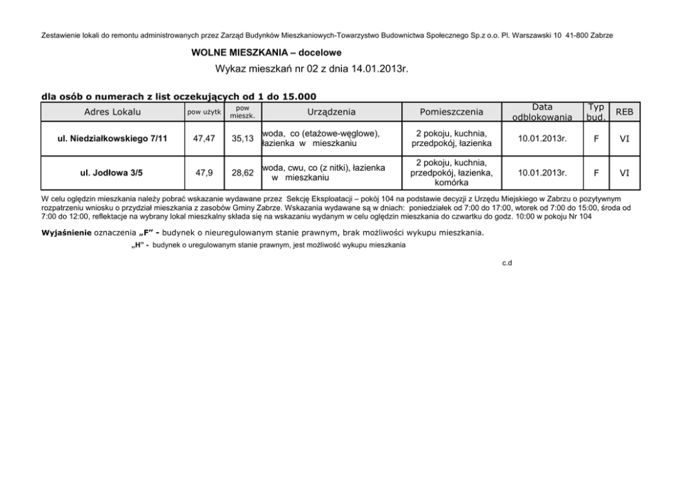 Zestawienie lokali do remontu administrowanych przez Zarząd Budynków Mieszkaniowych-Towarzystwo Budownictwa Społecznego Sp.z o.o. Pl. Warszawski 10 41-800 Zabrze WOLNE MIESZKANIA – docelowe Wykaz mieszkań nr 02 z dnia 14.01.2013r. dla osób o numerach z list oczekujących od 1 do 15.000 Adres Lokalu pow użytk pow mieszk. ul. Niedziałkowskiego 7/11 47,47 35,13 ul. Jodłowa 3/5 47,9 28,62 Pomieszczenia Data odblokowania Typ bud. REB woda, co (etażowe-węglowe), łazienka w mieszkaniu 2 pokoju, kuchnia, przedpokój, łazienka 10.01.2013r. F VI woda, cwu, co (z nitki), łazienka w mieszkaniu 2 pokoju, kuchnia, przedpokój, łazienka, komórka 10.01.2013r. F VI Urządzenia W celu oględzin mieszkania należy pobrać wskazanie wydawane przez Sekcję Eksploatacji – pokój 104 na podstawie decyzji z Urzędu Miejskiego w Zabrzu o pozytywnym rozpatrzeniu wniosku o przydział mieszkania z zasobów Gminy Zabrze. Wskazania wydawane są w dniach: poniedziałek od 7:00 do 17:00, wtorek od 7:00 do 15:00, środa od 7:00 do 12:00, reflektacje na wybrany lokal mieszkalny składa się na wskazaniu wydanym w celu oględzin mieszkania do czwartku do godz. 10:00 w pokoju Nr 104 Wyjaśnienie oznaczenia „F” - budynek o nieuregulowanym stanie prawnym, brak możliwości wykupu mieszkania. „H” - budynek o uregulowanym stanie prawnym, jest możliwość wykupu mieszkania c.d Zestawienie lokali do remontu administrowanych przez Zarząd Budynków Mieszkaniowych-Towarzystwo Budownictwa Społecznego Sp.z o.o. Pl. Warszawski 10 41-800 Zabrze WOLNE MIESZKANIA – bieżące do remontu Wykaz mieszkań nr 02 z dnia 14.01.2013r. dla osób o numerach z list oczekujących od 1 do 20.000 Pomieszczenia Data odblokowania Typ bud. REB 3 pokoje, kuchnia, przedpokój, łazienka 10.01.2013r. H I woda, gaz, łazienka w mieszkaniu 1 pokój, kuchnia, przedpokój, łazienka 10.01.2013r. H I 35,07 woda, gaz, łazienka w mieszkaniu 2 pokoje, kuchnia, przedpokój, łazienka 10.01.2013r. H III 49,48 32,9 woda, gaz, łazienka w mieszkaniu 2 pokoje, kuchnia, przedpokój, łazienka, spiżarka 10.01.2013r. F V 47,71 23,81 woda w mieszkaniu, wc kl schodowa 1 pokój, kuchnia 10.01.2013r. F VI Pow mieszk Adres Lokalu Pow użytk. ul. Chojnickiego 13 d /4 65,1 45,87 ul. Opolska 12 a / 7 22,07 16,29 ul. Roosevelta 63/4 45,49 ul .Krakowska 77 c /5 ul. Korczoka 25/4 Urządzenia woda, gaz, łazienka, co (z nitki), w mieszkaniu W celu oględzin mieszkania należy pobrać wskazanie wydawane przez Sekcję Eksploatacji – pokój 104 na podstawie decyzji z Urzędu Miejskiego w Zabrzu o pozytywnym rozpatrzeniu wniosku o przydział mieszkania z zasobów Gminy Zabrze. Wskazania wydawane są w dniach: poniedziałek od 7:00 do 17:00, wtorek od 7:00 do 15:00, środa od 7:00 do 12:00, reflektacje na wybrany lokal mieszkalny składa się na wskazaniu wydanym w celu oględzin mieszkania do czwartku do godz. 10:00 w pokoju Nr 104 Wyjaśnienie oznaczenia „F” - budynek o nieuregulowanym stanie prawnym, brak możliwości wykupu mieszkania. „H” - budynek o uregulowanym stanie prawnym, jest możliwość wykupu mieszkania . WOLNE MIESZKANIA – zalegające do remontu Wykaz mieszkań nr 02 z dnia 14.01.2013r. dla osób o numerach z list oczekujących od 1 do 23.668 Adres Lokalu Pow użytk. Pow mieszk. Urządzenia Pomieszczenia Data odblokowania Typ bud. REB W celu oględzin mieszkania należy pobrać wskazanie wydawane przez Sekcję Eksploatacji – pokój 104 na podstawie decyzji z Urzędu Miejskiego w Zabrzu o pozytywnym rozpatrzeniu wniosku o przydział mieszkania z zasobów Gminy Zabrze. Wskazania wydawane są w dniach: poniedziałek od 7:00 do 17:00, wtorek od 7:00 do 15:00, środa od 7:00 do 12:00, reflektacje na wybrany lokal mieszkalny składa się na wskazaniu wydanym w celu oględzin mieszkania do czwartku do godz. 10:00 w pokoju Nr 104 Wyjaśnienie oznaczenia „F” - budynek o nieuregulowanym stanie prawnym, brak możliwości wykupu mieszkania. „ H” - budynek o uregulowanym stanie prawnym, jest możliwość wykupu mieszkania .