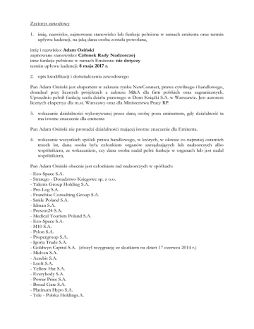 Życiorys zawodowy 1. imię, nazwisko, zajmowane stanowisko lub funkcje pełnione w ramach emitenta oraz termin upływu kadencji, na jaką dana osoba została powołana, imię i nazwisko: Adam Osiński zajmowane stanowisko: Członek Rady Nadzorczej inne funkcje pełnione w ramach Emitenta: nie dotyczy termin upływu kadencji: 8 maja 2017 r. 2. opis kwalifikacji i doświadczenia zawodowego Pan Adam Osiński jest ekspertem w zakresie rynku NewConnect, prawa cywilnego i handlowego, doradzał przy licznych projektach z zakresu M&A dla firm polskich oraz zagranicznych. Uprzednio pełnił funkcję szefa działu prawnego w Dom Książki S.A. w Warszawie. Jest autorem licznych ekspertyz dla m.st. Warszawy oraz dla Ministerstwa Pracy RP. 3. wskazanie działalności wykonywanej przez daną osobę poza emitentem, gdy działalność ta ma istotne znaczenie dla emitenta Pan Adam Osiński nie prowadzi działalności mającej istotne znaczenie dla Emitenta. 4. wskazanie wszystkich spółek prawa handlowego, w których, w okresie co najmniej ostatnich trzech lat, dana osoba była członkiem organów zarządzających lub nadzorczych albo wspólnikiem, ze wskazaniem, czy dana osoba nadal pełni funkcje w organach lub jest nadal wspólnikiem, Pan Adam Osiński obecnie jest członkiem rad nadzorczych w spółkach: - Eco-Space S.A. - Stratego - Doradztwo Księgowe sp. z o.o. - Talents Group Holding S.A. - Pro-Log S.A. - Franchise Consulting Group S.A. - Smile Poland S.A. - Idman S.A. - Present24 S.A. - Medical Tourism Poland S.A. - Eco-Space S.A. - M10 S.A. - Pylon S.A. - Propergroup S.A. - Igoria Trade S.A. - Goldwyn Capital S.A. (złożył rezygnację ze skutkiem na dzień 17 czerwca 2014 r.) - Midven S.A. - Acrebit S.A. - Lsoft S.A. - Yellow Hat S.A. - Everybody S.A. - Power Price S.A. - Broad Gate S.A. - Platinum Hypo S.A. - Tele - Polska Holdings.A. - Platinum Properties Group S.A. - Iq Partners S.A. - Eastsidecapital S.A. Pan Adam Osiński w okresie ostatnich 3 lat pełnił rolę członka rad nadzorczych w spółkach: - Startit Fund sp. z o.o. - Eattab.com S.A. - Cowork Polska S.A. - Legal Stream S.A. - W Investments S.A. - Fachowcy.Pl Ventures S.A. - Opulentia S.A. - Call Center Tools S.A. - Danks - Europejskie Centrum Doradztwa Podatkowego S.A. - Minox S.A. - Mobile Partner S.A. - Magnifico S.A. - Infinity8 S.A. - Niemczyk i Wspólnicy Ochrona Inwestycji S.A. - Martynix sp. z o.o. - Liberty Group S.A. - F24 S.A. Aktualnie Pan Adam Osiński jest wspólnikiem w EBC Partners sp. z o.o. z siedzibą w Warszawie oraz Innowacje Polskie sp. z o.o. z siedzibą w Warszawie. Do 2012 roku Pan Adam Osiński był wspólnikiem Amo Capital sp. z o.o. z siedzibą w Lublinie. Do 2011 roku Pan Adam Osiński sprawował funkcję wiceprezesa zarządu w Reklamofon.pl S.A. z siedzibą w Warszawie. Obecnie Pan Adam Osiński jest prezesem zarządu Świętokrzyski Inkubator Technologii S.A. z siedzibą w Kielcach oraz Grupa Proinvest sp. z o.o. z siedzibą w Warszawie. Pełni również funkcję Prezesa Zarządu EBC Solicitors S.A. z siedzibą w Warszawie, oraz partnera zarządzającego w Kancelarii Adwokackiej Osiński i Wspólnicy spółka komandytowa. 5. informacje na temat prawomocnych wyroków, na mocy których dana osoba została skazana za przestępstwa oszustwa w okresie co najmniej ostatnich pięciu lat oraz wskazanie, czy w okresie co najmniej ostatnich pięciu lat osoba taka otrzymała sądowy zakaz działania jako członek organów zarządzających lub nadzorczych w spółkach prawa handlowego W okresie ostatnich pięciu lat Pan Adam Osiński nie został skazany za przestępstwo oszustwa. W okresie ostatnich pięciu lat Pan Adam Osiński nie otrzymał sądowego zakazu działania jako członek organów zarządzających lub nadzorczych w spółkach prawa handlowego. 6. szczegóły wszystkich przypadków upadłości, zarządu komisarycznego lub likwidacji, w okresie co najmniej ostatnich pięciu lat, w odniesieniu do podmiotów, w których dana osoba pełniła funkcje członka organu zarządzającego lub nadzorczego W okresie ostatnich pięciu lat nie miała miejsce upadłość, zarząd komisaryczny lub likwidacja podmiotu, w którym Pan Adam Osiński pełnił funkcje członka organu zarządzającego lub nadzorczego. 7. informacje, czy dana osoba prowadzi działalność, która jest konkurencyjna w stosunku do działalności emitenta, oraz czy jest wspólnikiem konkurencyjnej spółki cywilnej lub osobowej albo członkiem organu spółki kapitałowej lub członkiem organu jakiejkolwiek konkurencyjnej osoby prawnej, Pan Adam Oiński nie prowadzi konkurencyjnej działalności w stosunku do działalności Emitenta, ani nie jest wspólnikiem konkurencyjnej spółki cywilnej lub osobowej albo członkiem organu spółki kapitałowej lub członkiem organu jakiejkolwiek konkurencyjnej osoby prawnej. 8. informacje, czy dana osoba figuruje w rejestrze dłużników niewypłacalnych, prowadzonym na podstawie ustawy z dnia 20 sierpnia 1997 r. o Krajowym Rejestrze Sądowym; Pan Adam Osiński nie figuruje w rejestrze dłużników niewypłacalnych prowadzonym na podstawie ustawy z dnia 20 sierpnia 1997 r. o Krajowym Rejestrze Sądowym.