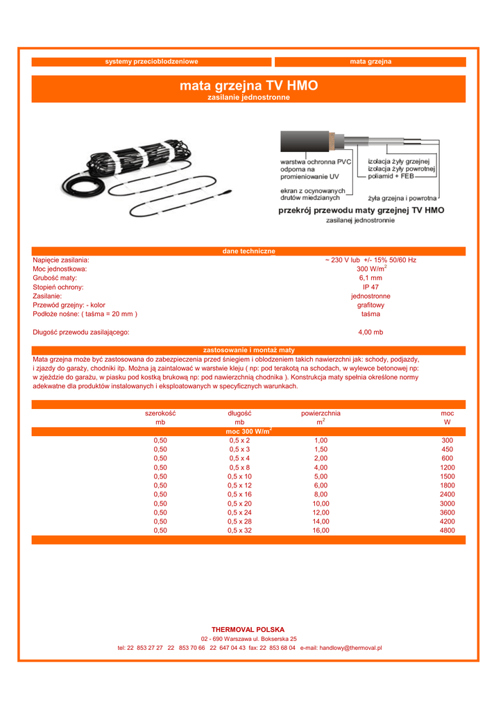 systemy przecioblodzeniowe mata grzejna 1 mata grzejna TV HMO zasilanie jednostronne dane techniczne Napięcie zasilania: Moc jednostkowa: Grubość maty: Stopień ochrony: Zasilanie: Przewód grzejny: - kolor Podłoże nośne: ( taśma = 20 mm ) ~ 230 V lub +/- 15% 50/60 Hz 300 W/m2 6,1 mm IP 47 jednostronne grafitowy taśma Długość przewodu zasilającego: 4,00 mb zastosowanie i montaż maty Mata grzejna może być zastosowana do zabezpieczenia przed śniegiem i oblodzeniem takich nawierzchni jak: schody, podjazdy, i zjazdy do garaży, chodniki itp. Można ją zaintalować w warstwie kleju ( np: pod terakotą na schodach, w wylewce betonowej np: w zjeździe do garażu, w piasku pod kostką brukową np: pod nawierzchnią chodnika ). Konstrukcja maty spełnia określone normy adekwatne dla produktów instalowanych i eksploatowanych w specyficznych warunkach. szerokość mb 0,50 0,50 0,50 0,50 0,50 0,50 0,50 0,50 0,50 0,50 0,50 długość mb moc 300 W/m2 0,5 x 2 0,5 x 3 0,5 x 4 0,5 x 8 0,5 x 10 0,5 x 12 0,5 x 16 0,5 x 20 0,5 x 24 0,5 x 28 0,5 x 32 powierzchnia m2 moc W 1,00 1,50 2,00 4,00 5,00 6,00 8,00 10,00 12,00 14,00 16,00 300 450 600 1200 1500 1800 2400 3000 3600 4200 4800 THERMOVAL POLSKA 02 - 690 Warszawa ul. Bokserska 25 tel: 22 853 27 27 22 853 70 66 22 647 04 43 fax: 22 853 68 04 e-mail: [email protected]