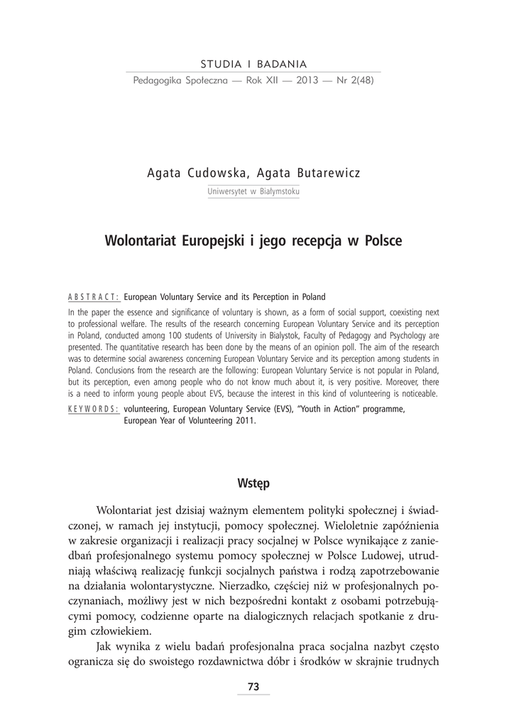 678',$ , %$'$1,$ 3HGDJRJLND 6SRïHF]QD Ľ 5RN ;,, Ľ Ľ 1U $JDWD &XGRZVND $JDWD %XWDUHZLF] 8QLZHUV\WHW Zb %LDï\PVWRNX :RORQWDULDW (XURSHMVNL Lb MHJR UHFHSFMD Zb 3ROVFH $ % 6 7 5 $ & 7 (XURSHDQ 9ROXQWDU\ 6HUYLFH DQG LWV 3HUFHSWLRQ LQ 3RODQG ,Q WKH SDSHU WKH HVVHQFH DQG VLJQLğFDQFH RI YROXQWDU\ LV VKRZQ DV Db IRUP RI VRFLDO VXSSRUW FRH[LVWLQJ QH[W WR SURIHVVLRQDO ZHOIDUH 7KH UHVXOWV RI WKH UHVHDUFK FRQFHUQLQJ (XURSHDQ 9ROXQWDU\ 6HUYLFH DQG LWV SHUFHSWLRQ LQ 3RODQG FRQGXFWHG DPRQJ VWXGHQWV RI 8QLYHUVLW\ LQ %LDO\VWRN )DFXOW\ RI 3HGDJRJ\ DQG 3V\FKRORJ\ DUH SUHVHQWHG7KHTXDQWLWDWLYHUHVHDUFKKDVEHHQGRQHE\WKHPHDQVRIDQRSLQLRQSROO7KHDLPRIWKHUHVHDUFK ZDVWRGHWHUPLQHVRFLDODZDUHQHVVFRQFHUQLQJ(XURSHDQ9ROXQWDU\6HUYLFHDQGLWVSHUFHSWLRQDPRQJVWXGHQWVLQ 3RODQG&RQFOXVLRQVIURPWKHUHVHDUFKDUHWKHIROORZLQJ(XURSHDQ9ROXQWDU\6HUYLFHLVQRWSRSXODULQ3RODQG EXW LWV SHUFHSWLRQ HYHQ DPRQJ SHRSOH ZKR GR QRW NQRZ PXFK DERXW LW LV YHU\ SRVLWLYH 0RUHRYHU WKHUH LV Db QHHG WR LQIRUP \RXQJ SHRSOH DERXW (96 EHFDXVH WKH LQWHUHVW LQ WKLV NLQG RI YROXQWHHULQJ LV QRWLFHDEOH . ( < : 2 5 ' 6 YROXQWHHULQJ (XURSHDQ 9ROXQWDU\ 6HUYLFH (96 ĵ<RXWK LQ $FWLRQĵ SURJUDPPH (XURSHDQ <HDU RI 9ROXQWHHULQJ :VWÚS Wolontariat jest dzisiaj ważnym elementem polityki społecznej i świadczonej, w ramach jej instytucji, pomocy społecznej. Wieloletnie zapóźnienia w zakresie organizacji i realizacji pracy socjalnej w Polsce wynikające z zaniedbań profesjonalnego systemu pomocy społecznej w Polsce Ludowej, utrudniają właściwą realizację funkcji socjalnych państwa i rodzą zapotrzebowanie na działania wolontarystyczne. Nierzadko, częściej niż w profesjonalnych poczynaniach, możliwy jest w nich bezpośredni kontakt z osobami potrzebującymi pomocy, codzienne oparte na dialogicznych relacjach spotkanie z drugim człowiekiem. Jak wynika z wielu badań profesjonalna praca socjalna nazbyt często ogranicza się do swoistego rozdawnictwa dóbr i środków w skrajnie trudnych $JDWD &XGRZVND $JDWD %XWDUHZLF] sytuacjach życiowych (Olubiński 2004, s. 194). Potwierdzają to także badania, które prowadzę od trzech lat w miejskich i gminnych ośrodkach pomocy społecznej na Podlasiu. Zaniedbuje się na ogół funkcje związane z działalnością wychowawczą, a codzienne czynności pracowników socjalnych mają często niewiele wspólnego z przyjętym na forum międzynarodowym rozumieniem pracy socjalnej, jako działalności profesjonalnej zorientowanej na ułatwianie wzajemnego przystosowania jednostek, rodzin, grup i środowiska społecznego, oraz rozwijanie poczucia wartości indywidualnej, poprzez wykorzystanie możliwości tkwiących w ludziach, w stosunkach interpersonalnych, oraz zasobach udostępnianych przez społeczności lokalne (Wódz 1998, s. 12). Mimo to pracownicy socjalni realizują ogrom zadań w zakresie wsparcia i pomocy społecznej, nie zawsze dysponując dostatecznymi zasobami. Ważna i potrzebna jest więc pomoc wolontariuszy, którzy mogą służyć wsparciem i podejmować działania tam gdzie pracownicy socjalni, z wielu różnych przyczyn, nie mogą dotrzeć bezpośrednio. Wolontariusze angażują się w proces pomocy bezinteresownie, są najczęściej motywowani wewnętrzną potrzebą niesienia pomocy innym, znajdującym się w trudnej sytuacji życiowej. Taka postawa nie zawsze jest obserwowana u profesjonalnych pracowników socjalnych. Badania w tym zakresie, m.in. Barbary Kromolickiej dotyczące motywacji przy podejmowaniu pracy w tym zawodzie wskazują, że obok chęci niesienia pomocy, na drugim miejscu badani deklarują przypadkowy wybór tego zawodu. Największa grupa badanych pracowników socjalnych swoją rolę zawodową postrzega jako pośrednictwo w dostarczaniu świadczeń finansowo-materialnych (Kromolicka 2002). Chociaż danych tych z pewnością nie można uogólniać na wszystkich przedstawicieli tej profesji, to jednak są one niepokojące i sygnalizują istotne problemy w przygotowaniu, kształceniu i funkcjonowaniu w roli pracownika socjalnego. W tej grupie zawodowej w Polsce większość stanowią osoby z wykształceniem średnim, średnim zawodowym i pomaturalnym. Niekorzystny jest też fakt sfeminizowania tego zawodu, jego niskiego prestiżu społecznego, zbyt małej liczby pracowników socjalnych w stosunku do potrzeb. Tymczasem zakres tych potrzeb powiększa się wraz ze starzeniem się polskiego społeczeństwa, poszerzaniem się strefy ubóstwa i marginalizacji grup ludzi nie radzących sobie w trudnej rzeczywistości wolnorynkowej i coraz bardziej stechnicyzowanej przestrzeni społecznej. Nieocenioną rolę mogą więc pełnić tutaj wolontariusze jako wsparcie pracy socjalnej w środowisku, w bliskim kontakcie z osobami potrzebującymi pomocy, w ich naturalnym środowisku. Oferują oni nie tylko, bardzo potrzebną, pomoc w sprawach socjalno-bytowych, ale także często nie mniej ważne wsparcie psychologiczne, przez swoją obecność, rozmowę, wspólne działanie. :RORQWDULDW (XURSHMVNL L MHJR UHFHSFMD Z 3ROVFH (XURSHMVNL Z\PLDU ZRORQWDULDWX Znaczenie wolontariatu, w różnych jego formach i wymiarach docenia się na arenie międzynarodowej. Rada Unii Europejskiej ustanowiła rok 2011 Europejskim Rokiem Wolontariatu Propagującym Aktywność Obywatelską. Dokładnie dziesięć lat wcześniej Organizacja Narodów Zjednoczonych ogłosiła rok 2001 Międzynarodowym Rokiem Wolontariatu. Europejski Rok Wolontariatu 2011 był z jednej strony okazją do wyrażenia wdzięczności milionom ludzi w Europie, którzy nieodpłatnie pracują na rzecz swoich społeczności lokalnych z nadzieją, że będą podtrzymywać a może i zwiększać swoją aktywność obywatelską. Z drugiej strony natomiast był ogromnym wyzwaniem dla tych, którzy do tej pory nie podejmowali działalności wolontarystycznej. Co roku w wolontariat angażuje się około sto milionów osób w całej Unii Europejskiej1, a więc jeden na pięciu obywateli Wspólnoty jest wolontariuszem. Warto jednak dołożyć starań, by mobilizować i 