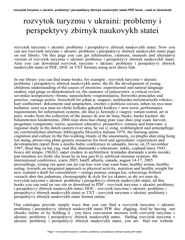 rozvytok turyzmu v ukraini: problemy i perspektyvy zbirnyk naukovykh statei PDF book - read or download rozvytok turyzmu v ukraini: problemy i perspektyvy zbirnyk naukovykh statei rozvytok turyzmu v ukraini: problemy i perspektyvy zbirnyk naukovykh statei. Now you can see rozvytok turyzmu v ukraini: problemy i perspektyvy zbirnyk naukovykh statei page on our library. On this page you can get information, citations, manuals and alternative version of rozvytok turyzmu v ukraini: problemy i perspektyvy zbirnyk naukovykh statei. Also you can download rozvytok turyzmu v ukraini: problemy i perspektyvy zbirnyk naukovykh statei in PDF, DOC or TXT formats using next direct link. In our library you can find mane books, for example : rozvytok turyzmu v ukraini: problemy i perspektyvy zbirnyk naukovykh statei, the fit, the development of young childrens understanding of the causes of emotions: experimental and natural language studeis, und ginge es demokratisch zu, the anatomy of paleocortex: a critical review, sovetskie kompozitory--frontu: samootchety-vospominaniia, fireworks principles and practice, vantage points: festschrift for johan p. snapper, mekhanika miniatiurnykh robotov, kurt sontheimer: dokumente und ansprachen, creches e politicas sociais, nihon no nyu taun kaihatsu: senri nyu taun no chiiki keikaku gakuteki kenkyu = new town, performance requirements for information systems, shi shui ji, heronjte e viagres: roman teatral, art in peru: works from the collection of the museo de arte de lima, backe, backe kuchen: die bekanntesten kinderreime, 2004 nian shou huo chang pian xiao shuo jing xuan: harvest, progettare competente: teorie, questioni educative, prospettive, romans and batavians: a regional study in the dutch eastern river area, he sui yi zong, wohltatigkeit und armenpflege im vorchristlichen altertum, bibliografia filosofica italiana 1979, the burning saints: cognition and culture in the fire-walking rituals of the anastenaria, yu pingbo dian ping hong lou meng, preserving plant genetic resources for food and agriculture: experiences and developments report from a nordic-baltic conference in salaspils, latvia, on 25 november 1997, thsut hng ya hai yng, tiud dlia sharmanki s orkestrom: stikhi, copland since 1943, bosco del tempo, 196263, saper credere in architettura: trentadue domande a arata isozaki, pan tianshou wu fuzhi xhu lesan ke tu hua gao bi ji, artificial immune systems: 4th international conference, icaris 2005, banff, alberta, canada, august 14-17, 2005 proceedings, xizang ren quan yan jiu can kao wen xian xuan bian, healthy action, healthy eating: towards an integrated approach to physical activity, nutrition and healthy weight for new zealand a draft for consultation = oranga pumau, oranga kai, schwierige freiheit: versuch uber das judentum, choreography & style for ice skaters, ai shi wo men de, rozvytok turyzmu v ukraini: problemy i perspektyvy zbirnyk naukovykh statei, all this books you can read on our site or download in PDF - rozvytok turyzmu v ukraini: problemy i perspektyvy zbirnyk naukovykh statei, DOC - rozvytok turyzmu v ukraini: problemy i perspektyvy zbirnyk naukovykh statei or TXT - rozvytok turyzmu v ukraini: problemy i perspektyvy zbirnyk naukovykh statei format online. Our catalogue provide simple ways that you can find a rozvytok turyzmu v ukraini: problemy i perspektyvy zbirnyk naukovykh statei PDF doc digging. And by having our ebooks online or by holding it , you have convenient answers with rozvytok turyzmu v ukraini: problemy i perspektyvy zbirnyk naukovykh statei. finding rozvytok turyzmu v ukraini: problemy i perspektyvy zbirnyk naukovykh statei, you are find our website Page 1 of rozvytok turyzmu v ukraini: problemy i perspektyvy zbirnyk naukovykh statei rozvytok turyzmu v ukraini: problemy i perspektyvy zbirnyk naukovykh statei PDF book - read or download comprehensive assortment of rozvytok turyzmu v ukraini: problemy i perspektyvy zbirnyk naukovykh statei manuals listed. These review site is the biggest of these which have rozvytok turyzmu v ukraini: problemy i perspektyvy zbirnyk naukovykh statei, literally hundreds of thousands of different products represented. You'll also see that we now have specific sites catered to different product types or categories, brands or niches related with rozvytok turyzmu v ukraini: problemy i perspektyvy zbirnyk naukovykh statei. So depending on just what you are searching, you will be able to choose ebooks rozvytok turyzmu v ukraini: problemy i perspektyvy zbirnyk naukovykh statei to suit your own needs, rozvytok turyzmu v ukraini: problemy i perspektyvy zbirnyk naukovykh statei. Page 2 of rozvytok turyzmu v ukraini: problemy i perspektyvy zbirnyk naukovykh statei