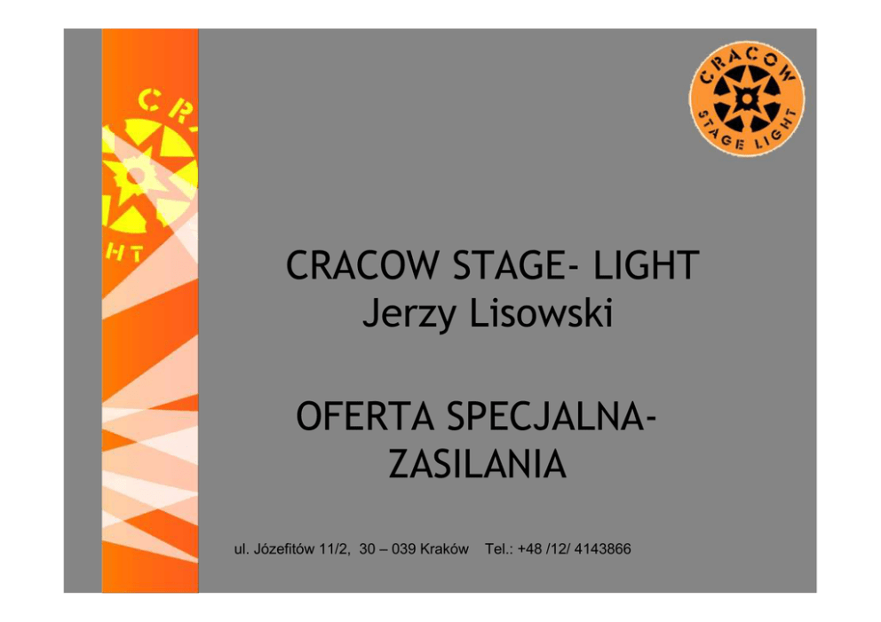 CRACOW STAGE- LIGHT Jerzy Lisowski OFERTA SPECJALNAZASILANIA ul. Józefitów 11/2, 30 – 039 Kraków Tel.: +48 /12/ 4143866 Firma CRACOW STAGE - LIGHT, Jerzy Lisowski wprowadziła do swojej oferty usługę: ZASILANIE IMPREZ PLENEROWYCH. Jeśli nie wiesz jak doprowadzić energię elektryczną do miejsca koncertu, imprezy, festynu czy pikniku zadzwoń lub napisz do nas: 012 414-38-66 lub [email protected] Wynajmujemy takŜe infrastrukturę energetyczną tj.: Kable energetyczne do zasilań wysokiej mocy o przekroju : • 5 x 150 mm², • 5 x 120 mm², • 5 x 90 mm², • 5 x 70 mm², • 5 x 50 mm², • 5 x 35 mm², • 5 x 25 mm², • 5 x 16 mm², • 5 x 10 mm², • 5 x 6 mm², • 5 x 4 mm², • 5 x 2.5 mm², Inne kable: • 3 x 2.5 mm², • 3 x 1.5 mm². Skrzynie energetyczne tzw. skrzynie RB 400A, 200A oraz 100A z przekładnikami i licznikami Najazdy kablowe oraz gumy do przykrywania kabli Na Ŝądanie klienta moŜemy podstawić Agregat prądotwórczy kaŜdej mocy. Naszym klientom zapewniamy równieŜ kompleksowa obsługę uzgodnień z Zakładem Energetycznym od momentu ustalenia warunków technicznych po podpisanie umowy o dostarczenie energii. O naszej fachowości świadczą obsługiwane imprezy jak np.: • Sylwester 2006/2007, Kraków - Rynek Główny (na potrzeby tej imprezy zabezpieczaliśmy prąd o mocy 800 kW ) oraz Sylwester 2007/2008, Kraków - Rynek Główny (na potrzeby tej imprezy zabezpieczaliśmy prąd o mocy 600 kW). • Koncerty związane z obchodami 750-lecia lokacji Miasta Krakowa - Rynek Główny, Plac Szczepański, Błonia Krakowskie (na potrzeby tej imprezy zabezpieczaliśmy prąd o mocy 1,5 MW) • „Wianki 2007 r.” - imprezę plenerową, Kraków Bulwary Wiślane (na potrzeby tej imprezy zabezpieczaliśmy prąd o mocy 700kW) • Superwidowisko Opery Wrocławskiej - „Napój miłosny” Gaetano Donizetti, Wrocław (na potrzeby tej imprezy zabezpieczaliśmy prąd o mocy 600kW) • VII Międzynarodowa Wielka Parada Smoków, Kraków (na potrzeby tej imprezy zabezpieczaliśmy prąd o mocy 300kW) GALERIA SPRZĘT GALERIA WYDARZEŃ REALIZACJA PRZYŁĄCZY I ZASILAŃ ENERGETYCZNYCH GALERIA WYDARZEŃ REALIZACJA PRZYŁĄCZY I ZASILAŃ ENERGETYCZNYCH GALERIA WYDARZEŃ REALIZACJA PRZYŁĄCZY I ZASILAŃ ENERGETYCZNYCH KONTAKT Jerzy Lisowski, Prezes Tel.kom. 0502127247; e-mail: [email protected] Kamila Maciąg, Project Manager Tel. kom. 0501157723; e-mail: [email protected] Magda Naraniecka, Project Manager Tel.kom. 0509411438 e-mail: [email protected] Biuro: ul. Józefitów 11/2, 30-039 Kraków Tel.: +48 /12/ 4143866 Fax.:+48 /12/ 4292023 Siedziba: CRACOW STAGE- LIGHT 32-086 Kraków, Węgrzce, Oś. Wojskowe 12/11 ZAPRASZAMY http://www.cs-light.pl/ light.pl