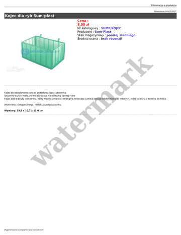 Informacje o produkcie Utworzono 04-03-2017 Kojec dla ryb Sum-plast Cena : 8,00 zł er m ar k Nr katalogowy : SUMP/KOJEC Producent : Sum-Plast Stan magazynowy : poniżej średniego Średnia ocena : brak recenzji Kojec do odizolowania ryb od pozostałej części zbiornika. Szczeliny są tak małe, że nie pozwalają na ucieczkę żadnej rybie Kojec jest większy od kotnika, który można umieścić wewnątrz. Wówczas samica zostaje odizolowana od młodych, które uciekną z kotnika do kojca. Wykonany z bezpiecznego, nietoksycznego plastiku. w at Wymiary: 19,8 x 10,7 x 11.0 cm Wygenerowano w programie www.oscGold.com