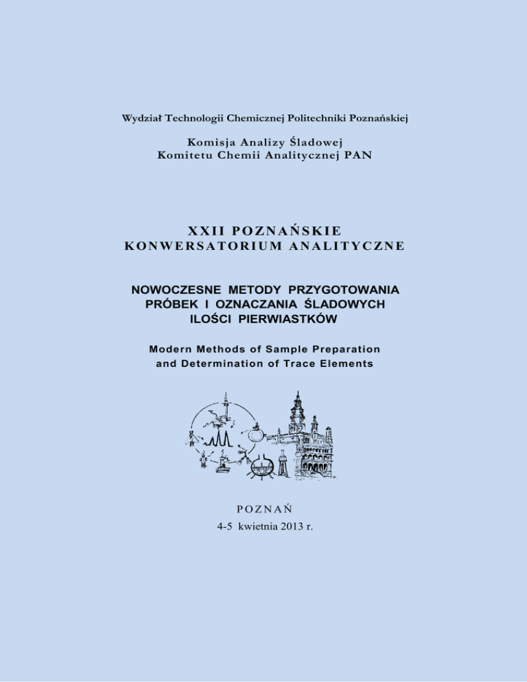 Wydział Technologii Chemicznej Politechniki Poznańskiej Komisja Analizy Śladowej Komitetu Chemii Analitycznej PAN XXII POZNAŃSKIE KONWERSATORIUM ANALITYCZNE NOWOCZESNE METODY PRZYGOTOWANIA PRÓBEK I OZNACZANIA ŚLADOWYCH ILOŚCI PIERWIASTKÓW Modern Methods of Sample Preparation and Determination of Trace Elements POZNAŃ 4-5 kwietnia 2013 r. P R O G R A M 4 kwietnia 2013 r. (czwartek) 11:00 - 11:05 O t w a r c i e - H. Matusiewicz 11:05 - 11:30 H. Matusiewicz (Politechnika Poznańska, Poznań) Kierunki rozwoju analizy spektrochemicznej w bionieorganicznej analizie śladowej i specjacyjnej: od makro do mikroanalityki 11:30 - 12:00 K. Chojnacka (Politechnika Wrocławska, Wrocław) Analiza wielopierwiastkowa jako użyteczna technika w oznaczaniu pierwiastków śladowych w produktach chemii dla rolnictwa 12:00 - 12:30 R. Sitko, E. Turek, B. Zawisza (Uniwersytet Śląski, Katowice) Grafen jako nowy sorbent w chemii analitycznej 12:30 - 13:00 M.I. Szynkowska, A. Pawlaczyk, K. Osingłowska, K. Palińska, (Politechnika Łódzka) A. Parczewski (Uniwersytet Jagielloński) LA-ICP-MS w badaniach śladów kryminalistycznych 13:00 - 13:30 P R Z E R W A 13:30 - 14:00 J. Nawrocki (Uniwersytet im. Adama Mickiewicza, Poznań) Ozon w uzdatnianiu wody - mity i fakty 14:00 - 14:30 M. Jabłońska-Czapla, S. Szopa, R. Michalski, A. Łyko (Instytut Podstaw Inżynierii Środowiska PAN, Zabrze) Analiza nieorganicznych form specjacyjnych antymonu z wykorzystaniem techniki HPLC-ICP-MS 14:30 - 14:45 K. Pawlak i K. Brama (Politechnika Warszawska, Warszawa) Wyznaczanie masy cząsteczkowej kompleksów fitochelatyn z kadmem za pomocą chromatografii żelowej i elektroforezy kapilarnej z detekcją ICP MS 14:45 - 15:00 J. Ciba, V. Helán (Politechnika Śląska, Gliwice; 2 THETA ASE, Český Těšín, Czechy) Nowa książka „Chemical elements – compendium“ 11:00 - 15:00 Przygotowanie SESJI PLAKATOWEJ 15:30 OBIAD Zebranie Komisji Analizy Śladowej 19:00 - 22:00 SPOTKANIE TOWARZYSKIE 5 kwietnia 2013 r. (piątek) 09:00 - 09:30 P. Niedzielski, L. Kozak, W. Wachowiak (Uniwersytet im. Adama Mickiewicza, Poznań, Piła) Tandemowe połączenie spektrofotometrii UV-Vis i płomieniowej absorpcyjnej spektrometrii atomowej w badaniach specjacji żelaza 09:30 - 09:50 A. Szymański (Politechnika Poznańska, Poznań) Przygotowanie próbek w chemicznych metodach analizy oksyalkilatów 09:50 - 10:05 B. Zawisza, R. Sitko (Uniwersytet Śląski, Katowice) Nanomateriały węglowe jako nowe sorbenty do zatężania pierwiastków śladowych 10:05 - 10:20 J. Grodowski (Spectro-Lab, Łomianki) Nowa konstrukcja komory zderzeniowej reakcyjnej ICP-Q-MS umożliwiająca optymalizację redukcji interferencji w trudnych matrycach 9:00 - 12:00 S E S J A P L A K A T O W A Prezentacja firm, literatury fachowej, aparatury, sprzętu i odczynników 12:00 - 13:00 P o d s u m o w a n i e s e s j i p l a k a t o w e j i wyróżnienie PLAKATÓW 13:00 Z a k o ń c z e n i e o b r a d - H. Matusiewicz SESJA PLAKATOWA Każdy z autorów prezentujących komunikaty w sesji plakatowej otrzyma do dyspozycji planszę o wymiarach 1m x 1m 1. 2. 3. 4. 5. 6. 7. A. Ściubidło, I. Majchrzak-Kucęba (Politechnika Częstochowska, Częstochowa) Zastosowanie metody ED-XRF do oznaczania składu chemicznego popiołów lotnych S. Szopa, M. Jabłońska–Czapla, R. Michalski (Instytut Podstaw Inżynierii Środowiska PAN, Zabrze) Zagrożenia środowiskowe związane z występowaniem form specjacyjnych talu, arsenu i antymonu w wodach i osadach dennych rzeki Kłodnicy I. Zalewska, A. Karaś, W. Sokołowska (Instytut Technologii Materiałów Elektronicznych, Warszawa) Zastosowanie metod spektroskopowych (FAAS i ICP-OES) do kontroli procesu technologicznego wprowadzania domieszek celowych do spinelu glinowo- magnezowego (Me:MgAl2O4) Z. Wichłacz (Interdyscyplinarny Zespół Badawczy SALUBRIS, Tulce) Interferencje spektralne przy oznaczaniu wybranych metali ciężkich w próbkach środowiskowych przy zastosowaniu wysokorozdzielczej absorpcyjnej spektrometrii atomowej E. Turek, R. Sitko (Uniwersytet Śląski, Katowice) Wykorzystanie tlenku grafenu w zatężaniu jonów ołowiu E. Chajduk, I. Bartosiewicz, M. Pyszynska, J. Chwastowska, H. Polkowska-Motrenko (Instytut Chemii i Techniki Jądrowej, Warszawa) Analiza złóż uranonośnych z obniżenia podlaskiego i syneklizy perybałtyckiej metodą ICP-MS I. Bartosiewicz, W. Skwara, J. Dudek, J. Chwastowska, H. Polkowska-Motrenko (Instytut Chemii i Techniki Jądrowej, Warszawa) Badanie specjacji pierwiastków śladowych występujących w łupkach dictyonemowych i piaskowcach 8. 9. 10. 11. 12. 13. 14. 15. 16. 17. 18. 19. 20. 21. 22. 23. 24. 25. 26. 27. 28. H. Polkowska-Motrenko, M. Smolik, B. Danko, A. Jakóbik-Kolon (Instytut Chemii i Techniki Jądrowej, Warszawa; Politechnika Śląska, Gliwice) Analiza wysokiej czystości cyrkonu metodą NAA P. Kowalewski, P. Niedzielski (Uniwersytet im. Adama Mickiewicza, Poznań) Badania specjacji żelaza w osadach dennych E. Nowak, P. Niedzielski (Uniwersytet im. Adama Mickiewicza, Poznań) Oznaczanie metali ciężkich w osadach tsunami M. Woźniak, P. Niedzielski, M. Rudnicka (Uniwersytet im. Adama Mickiewicza, Poznań) Problematyka oznaczania selenu w suplementach diety obecnych na polskim rynku M. Ślachciński, H. Matusiewicz (Politechnika Poznańska, Poznań) Chemiczne generowanie par przy udziale promieniowania ultrafioletowego oraz ultradźwięków w optycznej spektrometrii emisyjnej plazmy indukowanej mikrofalowo M. Narożny, K. Eitner, W. Urbaniak (Uniwersytet im. Adama Mickiewicza, Poznań) Pionowy rozkład cząstek PM10 w mieście Poznań J. Falandysz, T. Zalewska, L. Cocchi, N. Szylke (Uniwersytet Gdański; Instytut Meteorologii i Gospodarki Wodnej – PIB, Gdańsk; Gruppo Micologico e Naturalistico, Italia; Comitato Scientifico Nazionale dell Associazione Micologica Bresadola, Italia) Radiocez w płachetce kołpakowatej w Italii i Polsce A. Mazur, M. Różycka, J. Falandysz (Uniwersytet G