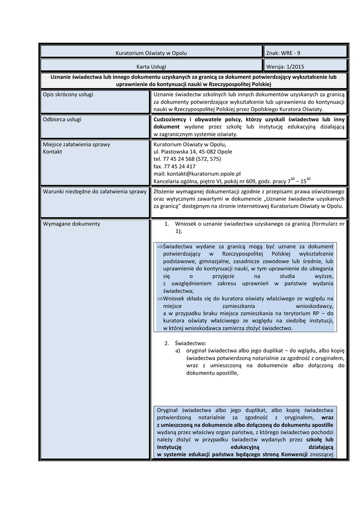 Kuratorium Oświaty w Opolu Karta Usługi Znak: WRE - 9 Wersja: 1/2015 Uznanie świadectwa lub innego dokumentu uzyskanych za granicą za dokument potwierdzający wykształcenie lub uprawnienie do kontynuacji nauki w Rzeczypospolitej Polskiej Opis skrócony usługi Uznanie świadectw szkolnych lub innych dokumentów uzyskanych za granicą za dokumenty potwierdzające wykształcenie lub uprawnienia do kontynuacji nauki w Rzeczypospolitej Polskiej przez Opolskiego Kuratora Oświaty. Odbiorca usługi Cudzoziemcy i obywatele polscy, którzy uzyskali świadectwo lub inny dokument wydane przez szkołę lub instytucję edukacyjną działającą w zagranicznym systemie oświaty. Miejsce załatwienia sprawy Kontakt Kuratorium Oświaty w Opolu, ul. Piastowska 14, 45-082 Opole tel. 77 45 24 568 (572, 575) fax. 77 45 24 417 mail: [email protected] 30 30 Kancelaria ogólna, piętro VI, pokój nr 609, godz. pracy 7 – 15 Warunki niezbędne do załatwienia sprawy Złożenie wymaganej dokumentacji zgodnie z przepisami prawa oświatowego oraz wytycznymi zawartymi w dokumencie „Uznanie świadectw uzyskanych za granicą” dostępnym na stronie internetowej Kuratorium Oświaty w Opolu. Wymagane dokumenty 1. Wniosek o uznanie świadectwa uzyskanego za granicą (formularz nr 1); Świadectwa wydane za granicą mogą być uznane za dokument potwierdzający w Rzeczypospolitej Polskiej wykształcenie podstawowe, gimnazjalne, zasadnicze zawodowe lub średnie, lub uprawnienie do kontynuacji nauki, w tym uprawnienie do ubiegania się o przyjęcie na studia wyższe, z uwzględnieniem zakresu uprawnień w państwie wydania świadectwa; Wniosek składa się do kuratora oświaty właściwego ze względu na miejsce zamieszkania wnioskodawcy, a w przypadku braku miejsca zamieszkania na terytorium RP – do kuratora oświaty właściwego ze względu na siedzibę instytucji, w której wnioskodawca zamierza złożyć świadectwo. 2. Świadectwo: a) oryginał świadectwa albo jego duplikat − do wglądu, albo kopię świadectwa potwierdzoną notarialnie za zgodność z oryginałem, wraz z umieszczoną na dokumencie albo dołączoną do dokumentu apostille, Oryginał świadectwa albo jego duplikat, albo kopię świadectwa potwierdzoną notarialnie za zgodność z oryginałem, wraz z umieszczoną na dokumencie albo dołączoną do dokumentu apostille wydaną przez właściwy organ państwa, z którego świadectwo pochodzi należy złożyć w przypadku świadectw wydanych przez szkołę lub instytucję edukacyjną działającą w systemie edukacji państwa będącego stroną Konwencji znoszącej wymóg legalizacji zagranicznych dokumentów urzędowych, sporządzonej w Hadze dnia 5 października 1961 roku (Dz. U. z 2005 r. Nr 112, poz, 938 i 939). Oryginał świadectwa lub jego duplikat przedstawiany jest do wglądu. Lista państw – stron Konwencji. albo b) zalegalizowany oryginał świadectwa lub jego duplikat – w przypadku świadectw pochodzących z państw niebędących stronami Konwencji Haskiej; Oryginał lub duplikat świadectwa zagranicznego powinien być zalegalizowany przez: konsula Rzeczypospolitej Polskiej, właściwego dla państwa, na którego terytorium lub w którego systemie edukacji wydano świadectwo, lub władze oświatowe państwa, na którego terytorium lub w którego systemie edukacji wydano świadectwo, lub akredytowane w Rzeczypospolitej Polskiej lub innym państwie członkowskim Unii Europejskiej, państwie członkowskim Europejskiego Porozumienia o Wolnym Handlu (EFTA) – stronie umowy o Europejskim Obszarze Gospodarczym, lub państwie członkowskim Organizacji Współpracy Gospodarczej i Rozwoju (OECD) przedstawicielstwo dyplomatyczne, lub urząd konsularny państwa, na którego terytorium lub w którego systemie edukacji wydano świadectwo. 3. Jeżeli świadectwo nie zawiera informacji o przebiegu kształcenia należy dołączyć: a) wykaz ocen uzyskanych podczas egzaminu warunkującego ukończenie szkoły lub instytucji edukacyjnej lub zaliczenie danego etapu kształcenia; b) wykaz przedmiotów i innych zajęć zrealizowanych w ramach danego etapu kształcenia wraz z uzyskanymi ocenami; c) informację o zrealizowanym programie nauczania dotyczącą treści kształcenia, planowanego czasu nauki i skali ocen; d) informację o uzyskanych uprawnieniach do kontynuacji nauki na odpowiednim poziomie w państwie, w którego systemie edukacji wydano świadectwo, w tym o uprawnieniach do ubiegania się o przyjęcie na studia wyższe, oraz o zakresie tych uprawnień; Dokumenty, o których, mowa w pkt. 3 powinny być wydane lub potwierdzone przez szkołę lub instytucję edukacyjną, która wydała świadectwo, albo przez władze oświatowe państwa, na którego terytorium lub w którego systemie edukacji wydano świadectwo. 4. Tłumaczenie na język polski świadectwa po jego zalegalizowaniu / opatrzeniu apostille i innych dokumentów sporządzonych w języku obcym, dokonane przez: osobę wpisaną przez Ministra Sprawiedliwości na listę tłumaczy przysięgłych, lub osobę zarejestrowaną jako tłumacz przysięgły w państwie członkowskim Unii Europejskiej, państwie członkowskim Europejskiego Porozumienia o Wolnym Handlu (EFTA) – stronie umowy o Europejskim Obszarze Gospodarczym lub państwie członkowskim Organizacji Współpracy Gospodarczej i Rozwoju (OECD), lub konsula Rzeczypospolitej Polskiej, właściwego dla państwa, na którego 2 terytorium lub w którego systemie edukacji wydano świadectwo, lub akredytowane w Rzeczypospolitej Polskiej przedstawicielstwo dyplomatyczne lub urząd konsularny państwa, na którego terytorium lub w którego systemie edukacji wydano świadectwo; Jeżeli przetłumaczenie dokumentów na język polski napotyka trudne do usunięcia przeszkody, Opolski Kurator Oświaty może wyrazić zgodę na przedłożenie przez wnioskodawcę tłumaczenia dokonanego przez inny podmiot, którego wiarygodność nie budzi zastrzeżeń. 5. Upoważnienie (formularz nr 2) – w pr