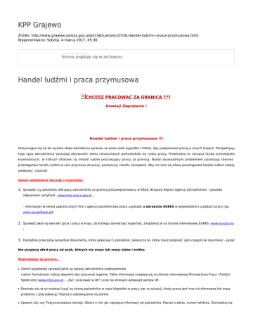 KPP Grajewo Źródło: http://www.grajewo.policja.gov.pl/po7/aktualnosci/2536,Handel-ludzmi-i-praca-przymusowa.html Wygenerowano: Sobota, 4 marca 2017, 05:30 Strona znajduje się w archiwum. Handel ludźmi i praca przymusowa CHCESZ PRACOWAĆ ZA GRANICĄ ??? Uważaj! Zagrożenie ! Handel ludźmi i praca przymusowa !!! Utrzymująca się od lat wysoka stopa bezrobocia sprawia, że wiele osób wyjeżdża z Polski, aby podejmować pracę w innych krajach. Perspektywy tego typu zatrudnienia sprzyjają aktywności wielu nieuczciwych pośredników na rynku pracy. Potwierdza to rosnąca liczba przestępstw kryminalnych, w których ofiarami są młodzi ludzie poszukujący pracy za granicą. Nadal zauważalnym problemem pozostają również przestępstwa handlu ludźmi w celu przymusu do pracy, prostytucji, handlu narządami. Aby nie stać się ofiarą przestępstwa handlu ludźmi należy zwiększyć czujność. Zanim podejmiesz decyzję o wyjeździe: 1. Sprawdź czy pośrednik oferujący zatrudnienie za granicą jestzarejestrowany w KRAZ (Krajowy Rejestr Agencji Zatrudnienia) i posiada odpowiedni certyfikat - www.kraz.praca.gov.pl ; - informacje na temat zagranicznych firm i agencji pośrednictwa pracy uzyskasz u doradców EURES w wojewódzkich urzędach pracy (np. www.up.podlasie.pl); 2. Sprawdź jakie są warunki życia i pracy w kraju, do którego zamierzasz wyjechać, znajdziesz je na stronie internetowej EURES: www.europa.eu ; 3. Dokładnie przeczytaj wszystkie dokumenty, które pokazuje Ci pośrednik, zwłaszcza te, które masz podpisać. Jeśli czegoś nie rozumiesz – pytaj! Nie przyjmuj ofert pracy od osób, których nie znasz lub znasz słabo i krótko. Wyjeżdżając za granicę… ● Zanim wyjedziesz sprawdź jakie są zasady zatrudnienia cudzoziemców i jakich formalności należy dopełnić aby pracować legalnie. Takie informacje znajdują się na stronie internetowej Ministerstwa Pracy i Polityki Społecznej (www.mps.gov.pl – „Żyć i pracować w UE”) oraz na stronach ambasad państw UE. ● Dowiedz się na co możesz liczyć ze strony pośrednika w razie kłopotów w pracy (np. w sytuacji, kiedy praca jest inna niż oferowana lub masz problemy z pracodawcą). Poproś o zobowiązanie na piśmie ● Upewnij się, czy Twój pracodawca istnieje. Zbierz o nim jak najwięcej informacji od pośrednika. Poproś o adres, numer telefonu. Skontaktuj się z nim. ● Zrób kserokopię dokumentów, które ze sobą zabierzesz (paszportu, dowodu osobistego, wiz, pozwolenia na pracę, umowy o pracę) i zostaw bliskim (osobom, którym ufasz). Dołącz do dokumentów aktualną fotografię. ● Zostaw adres, pod którym będziesz przebywać za granicą, numer telefonu, imię i nazwisko pracodawcy oraz nazwiska i adresy osób z którymi wyjeżdżasz (lepiej nie wyruszaj w pojedynkę). ● Ustal częstotliwość kontaktów telefonicznych z bliskimi (osobami którym ufasz), np. raz w tygodniu o określonej porze. Ustal hasło, którym się posłużysz w przypadku ewentualnych kłopotów i niemożności powiedzenia tego wprost przez telefon: np. pozdrowienia dla kogoś, kto nie istnieje itp. Zabierz ze sobą ! ● Adres i numer telefonu najbliższego konsulatu w kraju, do którego jedziesz. W razie jakichkolwiek kłopotów tam otrzymasz pomoc. Wykaz konsulatów znajdziesz na stronie internetowej Ministerstwa Spraw Zagranicznych:www.msz.gov.pl ; ● Słownik lub rozmówki – jeśli nie jesteś pewny(a) swoich umiejętności językowych. ● Numer telefonu Poland direct z kraju do którego jedziesz. Za minimalną opłatą lub za darmo będziesz mógł(mogła) zatelefonować do Polski (tylko na nr tel. stacjonarnego), o ile osoba do której dzwonisz zgodzi się zapłacić za rozmowę. Telefonistka mówi po polsku. ● Numer telefonu organizacji pomagającej kobietom, migrantom czy osobom poszkodowanym w wyniku przestępstwa. Zwykle w takiej organizacji można uzyskać poradę i pomoc. ● Europejską Kartę Ubezpieczenia Zdrowotnego, która jest potwierdzeniem ubezpieczenia w Narodowym Funduszu Zdrowia – (upewnij się jakiego rodzaju koszty leczenia za granicą mogą być pokryte przez NFZ). ● Telefon komórkowy z aktywnym roamingiem. ● Pieniądze (karty kredytowe, czeki), abyś miał(a) za co wrócić do Polski. Za granicą : ● Twoje dokumenty (paszport, dowód osobisty) należą do Ciebie. Nikt nie ma prawa ci ich odebrać. Jednak jeśli stracisz dokumenty, masz takie samo prawo do skorzystania pomocy polskiego konsulatu, Policji czy służb socjalnych. ● Masz prawo do wyboru miejsca zamieszkania i swobodnego poruszania się po terytorium kraju w którym przebywasz. Nikt więc nie ma prawa więzić Cię, przetrzymywać ani zmuszać do czegokolwiek – także do pracy! ● Jeśli masz kłopoty, pomocy możesz szukać w polskiej placówce dyplomatycznej. Po pomoc należy zgłosić się do konsulatu nie do ambasady. W razie potrzeby konsul udzieli ci rady i pomocy (więcej informacji www.msz.gov.pl) ● Jeśli spotkało Cię coś złego np.: stałaś/eś się ofiarą przestępstwa lub je popełniłaś/eś i zostałaś/eś zatrzymana/y przez policję, pamiętaj, masz prawo do obrony swoich praw! Na Twoją prośbę policjant powiadomi o Twojej sytuacji polski konsulat. Twoje prawa za granicą mają obowiązek chronić polski konsul i Policja. ● Jeśli ktoś cię krzywdzi (np. bije, szantażuje, zmusza do czegoś) To nie jest Twoja wina! Winien jest sprawca – powinien być ukarany. zawsze możesz liczyć na pomoc ze strony Policji:w kraju tel.997, tel. 112 – numer alarmowy służb ratunkowych obowiązujący w krajach Unii Europejskiej Polskie Organizacje udzielające pomocy oraz zaangażowane w walkę i zapobieganie handlowi ludźmi: www.strada.org.pl Fundacja Przeciwko Handlowi Ludźmi i Niewolnictwu „LaStrada”. Zawiera informacje na temat zjawiska handlu ludźmi, regulacje prawne dla osób chcących pracować za granicą Telefon zaufania: 48 22 628 99 99 e-mail:[email protected] w