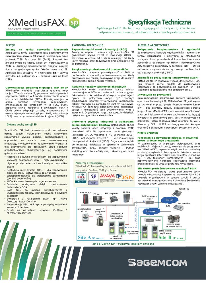 Specyfikacja Techniczna SERVICE PROVIDER EDITION BOARDLESS, T.38 MULTI-TENANT Aplikacja FoIP dla firm wymagających efektywnej kosztowo odporności na awarie, skalowalności i wielopodmiotowości FAX OVER IP WSTĘP EKONOMIA PRZEKONUJE FLEXIBLE ARCHITECTURE Zmiany na rynku serwerów faksowych XMediusFAX firmy Sagemcom jest opatentowanym rozwiązaniem serwera faksowego wspieranym przez protokół T.38 Fax over IP (FoIP). Produkt ten zmienił rynek od czasu, kiedy był wprowadzony w 2002 r, działając konsekwentnie osiągnął pozycję lidera na globalnym rynku faksów przez sieć IP. Aplikacja jest dostępna w 4 wersjach: sp – service provider, ee- enterprise, x – Express i axp na Cisco (ISR). Zapewnia szybki zwrot z inwestycji (ROI) Prosty w użyciu i administracji XMediusFAX SP gwarantuje szybki zwrot z inwestycji (ROI) zazwyczaj w czasie od 1 do 6 miesięcy, od kiedy karty faksowe oraz dedykowane linie analogowe nie są potrzebne. Polepszenie bezpieczeństwa i zgodności Zaawansowana kontrola użytkowników i administratorów, zarządzanie i enkrypcja w XMediusFAX wydajnie chroni prywatność dokumentów i zapewnia zgodność z regulacjami np. HIPAA i Sarbanes-Oxley Act. Wrażliwe dokumenty w formacie TIFF i PDF są rutowane wyłącznie do autoryzowanych odbiorców i bezpiecznych drukarek / MFD. Optymalizacja globalnej migracji z TDM do IP XMediusFax wydajnie przyspiesza globalną migrację z TDM do świata IP, poprawia produktywność i usprawnia działanie w firmach, jednoczeńnie obniża koszty ich działalności (TCO). Rozwiązanie jest w stanie sprostać wymogom regulacyjnym, zmieniającym się strategiom w IT (UC, ECM), zapewnia łatwą integracją z aplikacjami (ERP / CRM) celem adaptacji bardziej ekonomicznych i eko-przyjaznych technologii (np. FoIP, wirtualizacja i SIP) oraz urządzeniami wielofunkcyjnymi (MFD). Redukcja kosztów telekomuniakacyjnych XMediusFAX może zredukować koszty telekomunikacyjne o 90% w porównaniu z tradycyjnym faksowaniem. W wielooddziałowych organizacjach opłaty za połączenia mogą być znacząco zredukowane poprzez wykorzystanie mechanizmu tablicy routingu do zarządzania ruchem faksowym. XMediusFAX eliminuje kosztowne linie analogowe, sprzęt i konieczność jego utrzymywania wraz z zapasami. Organizacje mogą zaoszczędzić dziesiątki tysięcy w ciągu roku z XMediusFAX. XmediusFax SP jest przeznaczony do zarządzania bardzo dużym wolumenem ruchu faksowego zapewniając wysoki poziom bezpieczeństwa i odporności na awarie oraz zaawansowaną integrację, monitorowanie i raportowanie. Wersja ta jest dedykowana dla dostawców usług i dużych przedsiębiorstw; charakteryzuje się poniższymi głównymi cechami: Replikacja aktywna intra-system dla zapewnienia wysokiej dostępności (HA – high availability) płynne przełączanie na inne kanały w przypadku awarii Replikacja inter-system (DR) – dla zapewnienia ciągłości pracy i odtwarzania po awariach Wielopodmiotowość dla polepszenia zarządzania (do 500 podmiotów) 480+ kanałów faksowych na jeden serwer Dzielenie obciążenia dzięki zastosowaniu architektury SOA Baza SQL do miliona przychodzących i wychodzących faksów, poindeksowana z szybkim dostępem Integracja z katalogiem LDAP np. Active Directory, Lotus Domino Autentykacja SSL i enkrypcja pomiędzy modułami serwera i klientami Działa na wirtualnym serwerze VMWare / Microsoft Hypervisor Zdolność do pracy ciągłej i przetrwania awarii XMediusFAX SP zapewnia wysoką dostępność (HA), jak również różne modele do zastosowania począwszy od odtwarzania po awariach (DR) do zdalnego zabezpieczenia dla oddziałów (BrS). Inwestycja na przyszłość Jako rozwiązanie programowe serwera faksowego, oparte na technologii IP, XMediusFAX SP jest wysoce skalowalny przez proste licencjonowanie kanałów – bez potrzeby zakupu dodatkowego sprzętu innych firm. XMediusFAX może również współdziałać z kartami faksowymi w celu zachowania istniejącej inwestycji w architekturę sieci. Jest to inwestycja na przyszłość, która zapewnia łatwą migrację do VoIP. Standardy SIP i H.323 wspierają również kompatybilność z aktuanymi i przyszłymi systemami VoIP. Ułatwienie płynnej integracji z aplikacjami celem optymalizacji kosztów XMediusFAX obniża koszty poprzez łatwą integrację z bramami VoIP, centralami PBX IP, systemami poczt głosowych (aplikacje UM/UC włącznie z MS Exchange 2010), LDAP, aplikacjami ECM/ERP i wielofunkcyjnymi maszynami drukującymi (MDF). Bogaty w narzędzia do integracji działające w oparciu o technologie Java/CORBA, XML, serwisy webowe i Python scripting umożliwia efektywną i skrojoną na miarę integrację. PROSTE OPERACJE Faksowanie z dowolnego miejsca, o dowolnej porze i z dowolnego urządzenia W dzisiejszych, w większości połączonych, oraz mobilnych miejscach pracy, rozwiązanie programowe XMediusFAX zapewnia użytkownikom unikalną prostotę wysyłania i otrzymywania faksów z szerokiego spektrum interfejsów (np. klientów e-mail na PC, MFDs, telefonów komórkowych i in.) oraz zoptymalizowane narzędzia raportujące dostępne przez szybką sieć wraz z gwarancją wydajności. Partnerzy Technologiczni: XMediusFA X: Powered by the most advanced FoIP integration for these VoIP platfor ms: Siła chroniących środowisko rozwiązań FoIP XMediusFAX wspierany przez podstawowe technologie wirtualizacji i oparte na protokole FoIP T.38 pozwala organizacjom w sposób szybki i prosty zastosować oszczędnościowe i chroniące środowisko rozwiązania tzw. „zielone rozwiązania” . telephone ERP / CRM PC users SIP telephone IP PBX VoIP gateway / router PSTN fax machine LAN multifunction device email / group ware server XMediusFAX intra-system replication T.30 (T.38 / SIP / H.323) Główne cechy wersji SP Zwiększenie produktywności pracowników XMediusFAX zwiększa produktywność o 90% w porównaniu z manualnym faksowaniem, od kiedy pracownicy nie muszą pokonywać drogi do maszyn