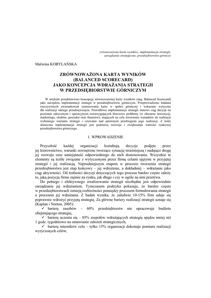 zrównoważona karta wyników, implementacja strategii, zarządzanie strategiczne, przedsiębiorstwo górnicze Malwina KOBYLAŃSKA ZRÓWNOWAŻONA KARTA WYNIKÓW (BALANCED SCORECARD) JAKO KONCEPCJA WDRAŻANIA STRATEGII W PRZEDSIĘBIORSTWIE GÓRNICZYM W artykule przedstawiono koncepcję zrównoważonej karty wyników (ang. Balanced Scorecard) jako narzędzia implementacji strategii w przedsiębiorstwie górniczym. Przeprowadzono badania rzeczywistych uwarunkowań zastosowania karty w spółce górniczej i wskazano wytyczne dla realizacji takiego przedsięwzięcia. Prawidłowa implementacja strategii stanowi ciąg decyzji na poziomie taktycznym i operacyjnym rozstrzygających kluczowe problemy (w obszarze inwestycji, marketingu, struktur, procedur oraz finansów), mających na celu stworzenie warunków do realizacji wybranego wariantu strategii i czuwanie nad sprawnym przebiegiem jego realizacji. Z kolei skuteczna implementacja strategii jest podstawą rozwoju i zwiększania wartości rynkowej przedsiębiorstwa górniczego. 1. WPROWADZENIE Przyszłość każdej organizacji kształtują decyzje podjęte przez jej kierownictwo, warunki zewnętrzne tworzące sytuację teraźniejszą i nadające drogę jej rozwoju oraz umiejętność odpowiedniego do nich dostosowania. Wszystkie te elementy są ściśle związane z wytyczonymi przez firmę celami ujętymi w przyjętej strategii i jej realizacją. Najtrudniejszym etapem w procesie tworzenia strategii przedsiębiorstwa jest etap końcowy – jej wdrożenie, a dokładniej – wdrażanie jako ciąg aktywności. Od trafności decyzji dotyczących tego procesu bardzo często zależy to, jaką pozycję firma zajmie na rynku, jak długo i czy w ogóle na nim przetrwa. Do pełnego i efektywnego zrealizowania strategii niezbędne jest odpowiednie zarządzanie jej wdrażaniem. Tymczasem praktyka pokazuje, że bardzo często w przedsiębiorstwach istnieją rozbieżności pomiędzy procesem formułowania strategii a procesem jej wdrażania. Z badań wynika, że zaledwie 10-15% firm udaje się poprawnie wdrożyć przyjętą strategię. Za główne bariery realizacji strategii uznaje się (Kaplan i Norton, 2005): barierę zasobów – 60% przedsiębiorstw nie opracowuje budżetu obejmującego strategię, barierę uczenia się – 85% zespołów wdrażających strategię spędza mniej niż 1 godz. tygodniowo na omawianie założeń strategicznych, barierę mierników celu – tylko 15% organizacji dokonuje pomiaru realizacji wytyczonych celów, barierę komunikacji – tylko 5% pracowników zna i rozumie opracowaną strategię. Wszystkie te bariery tradycyjnego systemu zarządzania mogą zostać pokonane przez wykorzystanie w przedsiębiorstwie narzędzia ułatwiającego komunikowanie i wdrażanie strategii, jakim jest zrównoważona karta wyników (ang. Balanced Scorecard). Istotne jest to, że prawidłowo stosowana karta wyników to narzędzie zarządzania, a nie tylko pomiaru wyników. Takie podejście pozwala na strategiczne uczenie się i bieżącą adaptację do zmieniających się warunków, w jakich działa przedsiębiorstwo. Dzisiejsze realia rynkowe i przyspieszenie globalnej konkurencji wymuszają od firm nie tylko formułowania skutecznych strategii, ale i skutecznego wdrażania ich w życie. Stąd też problematyka monitoringu postępów we wdrażaniu strategii odgrywa coraz większą rolę, również w branży górniczej (Sitko i in., 2002). Zrównoważoną kartę wyników z powodzeniem wdrożyły m.in. takie firmy jak: Mobil, Chemical Bank, Rockwater, a w Polsce m.in.: Morliny S.A., Telekomunikacja Polska S.A., Stalexport S.A., Elektrownia Rybnik S.A., a ostatnio Kopalnia Soli „Wieliczka” S.A. Przedsiębiorstwa, które zdecydowały się na jej stosowanie, osiągnęły znaczny wzrost przychodów i zyskowności, zapewniły spójność działań organizacji z jej strategią i skutecznie przeprowadziły reorganizację swoich firm (na podstawie wieloletnich badań D. Nortona oraz firmy Arthur Andersen). Ze względu na specyfikę branży górniczej słuszne wydaje się zbadanie uwarunkowań zastosowania zrównoważonej karty wyników w przedsiębiorstwie górniczym i wskazanie wytycznych dla tego przedsięwzięcia. 2. UWARUNKOWANIA IMPLEMENTACJI STRATEGII Pojęcie implementacji strategii jest pojęciem rozumianym niejednoznacznie. Termin ten zasadniczo oznacza wcielenie w życie rozwiązań teoretycznych (modelowych) i projektów użytkowych (Stabryła, 2012). Mówiąc bardziej precyzyjnie, implementacja strategii określana jest jako ciąg decyzji na poziomie taktycznym i operacyjnym rozstrzygających kluczowe problemy z zakresu inwestycji, marketingu, struktur, procedur, finansów, których celem jest stworzenie warunków do realizacji wybranego wariantu strategii i czuwanie nad sprawnym przebiegiem jego realizacji (Romanowska, 1995). Sam problem podejmowania tych decyzji nie jest jednak usystematyzowany. Ponadto, o ile dla pierwszej fazy zarządzania strategicznego – formułowania strategii – istnieje prawdziwe bogactwo praktycznych wytycznych, o tyle dla fazy drugiej – jej implementacji – brak jest spójnego systemu zaleceń, co stanowi prawdziwe wyzwanie dla firm budujących długookresowe programy działania i stosujących tzw. podejście strategicznie. Stąd też, jak pokazuje praktyka, większość kadr zarządzających przedsiębiorstw wykazuje dużą kreatywność tylko przy formułowaniu strategii, nierzadko ambitnych i dalekosiężnych. Z kolei już przy przekładaniu celów strategicznych na konkretne zadania z terminami realizacji, wykonawcami i budżetami napotyka ona na poważne problemy. Wtedy też dochodzi do rozważań nad koniecznością restrukturyzacji procesów, umożliwiającej realizację celów strategicznych. Kierownictwo organizacji często w tym momencie wskazuje na nierealność płynących ze strategii zadań oraz zmian, które trzeba przeprowadzić i za które mieliby być osobiście odpowiedzialni. Kończy 