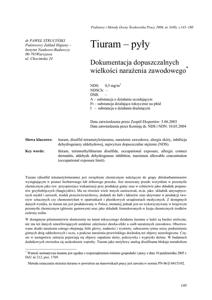Podstawy i Metody Oceny Środowiska Pracy 2006, nr 3(49), s.145–180 dr PAWEŁ STRUCIŃSKI Państwowy Zakład Higieny – Instytut Naukowo-Badawczy 00-791Warszawa ul. Chocimska 24 Tiuram – pyły Dokumentacja dopuszczalnych wielkości narażenia zawodowego* NDS: 0,5 mg/m3 NDSCh: – DSB: – A – substancja o działaniu uczulającym Ft – substancja działająca toksycznie na płód I – substancja o działaniu drażniącym Data zatwierdzenia przez Zespół Ekspertów: 5.06.2003 Data zatwierdzenia przez Komisję ds. NDS i NDN: 10.03.2004 Słowa kluczowe: tiuram, disulfid tetrametylotiuramu, narażenie zawodowe, alergia skóry, inhibicja dehydrogenazy aldehydowej, najwyższe dopuszczalne stężenie (NDS). Key words: thiram, tetramethylthiuram disulfide, occupational exposure, allergic contact dermatitis, aldehyde dehydrogenase inhibition, maximum allowable concentration (occupational exposure limit). Tiuram (disulfid tetrametylotiuramu) jest związkiem chemicznym należącym do grupy ditiokarbaminianów występującym w postaci bezbarwnego lub żółtawego proszku. Jest stosowany przede wszystkim w przemyśle chemicznym jako tzw. przyspieszacz wukanizacji przy produkcji gumy oraz w rolnictwie jako składnik preparatów grzybobójczych (fungicydów). Ma on również wiele innych zastosowań, m.in. jako: składnik antyseptycznych mydeł i aerozoli, środek przeciwświerzbowy, dodatek do farb i lakierów oraz aktywator w produkcji tworzyw sztucznych czy chemosterylant w opatrunkach i plastikowych urządzeniach medycznych. Z dostępnych danych wynika, że tiuram nie jest produkowany w Polsce, niemniej jednak jest on wykorzystywany w krajowym przemyśle chemicznym (głównie gumowym) oraz jako składnik formułowanych w kraju chemicznych środków ochrony roślin. W dostępnym piśmiennictwie doniesienia na temat toksycznego działania tiuramu u ludzi są bardzo nieliczne, nie ma też danych umożliwiających ustalenie zależności dawka-efekt u osób narażonych zawodowo. Obserwowane skutki narażenia ostrego obejmują: bóle głowy, nudności i wymioty, zaburzenia rytmu serca, podrażnienie górnych dróg oddechowych i oczu, a podczas narażenia przewlekłego dochodzą też objawy neurologiczne. Często w następstwie zatrucia pojawiają się objawy zapalenia skóry, pokrzywka i wypryski skórne. W badaniach dodatkowych stwierdza się uszkodzenie wątroby. Tiuram jako metylowy analog disulfiramu blokuje metabolizm * Wartość normatywna tiuramu jest zgodna z rozporządzeniem ministra gospodarki i pracy z dnia 10 października 2005 r. DzU nr 212, poz. 1769. Metoda oznaczania steżenia tiuramu w powietrzu na stanowiskach pracy jest zawarta w normie PN-86/Z-04153/02. 145 alkoholu etylowego, prowadząc do powstania objawów, tzw. „szoku disulfiramowego”. W ostatnich latach coraz więcej uwagi przywiązuje się do wywoływania przez tiuram alergii skóry oraz oczu na skutek narażenia inhalacyjnego, a także kontaktu z przedmiotami wykonanymi z tworzyw zawierających tiuram (np. rękawiczki lateksowe). Tiuram jest związkiem wykazującym stosunkowo niewielką toksyczność ostrą, niezależnie od drogi podania. Wartości LD50 przy podaniu per os dla szczurów i myszy sięgają nawet 4000 mg/kg m.c. Koty i owce są znacznie bardziej wrażliwe na toksyczne działanie pojedynczych dawek tiuramu niż gryzonie; wartość medialnej dawki śmiertelnej wynosi około 200 mg/kg m.c. W przypadku narażenia dermalnego, wartości LD50 na ogół przekraczają 2000 mg/kg m.c. Ogromna większość dostępnych danych z badań toksyczności przewlekłej tiuramu pochodzi z eksperymentów paszowych. Wśród obserwowanych skutków dominowały objawy neurologiczne, zmniejszenie tempa przyrostu masy ciała, zmiany parametrów hematologicznych, uszkodzenie oraz zmiany morfologiczne nerek, wątroby i innych narządów. Wartości NOAEL wyznaczone w długoterminowych badaniach na różnych gatunkach zwierząt wynoszą 0,4 ÷ 5 mg/kg m.c. W badaniach in vitro tiuram wykazuje umiarkowane działanie mutagenne zarówno bez udziału aktywacji metabolicznej, jak i z jej udziałem. Wyniki genotoksyczności w modelach doświadczalnych in vivo przyniosły wyniki ujemne. Tiuram w badaniach na zwierzętach nie wykazuje działania rakotwórczego. Zwiększenie się częstości występowania nowotworów jamy nosowej u szczurów stwierdzono jedynie przy łącznym narażeniu na tiuram i azotan (III) sodu, co było związane z powstaniem w organizmie zwierząt rakotwórczej N-nitrozodimetyloaminy. Tiuram został zaklasyfikowany przez ekspertów IARC do grupy 3. Udowodnione działanie embriotoksyczne i teratogenne ujawniało się po podaniu dużych, toksycznych dla matek dawek. Wykazano też, że tiuram niekorzystnie wpływa na rozrodczość zwierząt doświadczalnych, oddziałując na proces spermatogenezy u samców, a także zaburzając cykl rujowy u samic. Tiuram łatwo wchłania się do organizmu przez układ oddechowy i pokarmowy. Ulega on szybkiemu metabolizmowi i jest wydalany głównie z wydychanym powietrzem i z moczem. Wśród jego metabolitów są m.in. disiarczek węgla i kwas dimetylotiokarbaminianowy (lub jego aniony), które są współodpowiedzialne za obserwowane skutki toksycznego działania tiuramu. Mechanizm toksycznego działania tiuramu jest wielokierunkowy. Wynika on m.in. z jego zdolności do chelatowania metali i związanych z tym zdolności do hamowania aktywności enzymów (m.in. β-hydroksylazy dopaminy). Jest on również odpowiedzialny za zaburzanie metabolizmu węglowodanów i alkoholi (inhibicja dehydrogenazy aldehydowej) oraz gospodarki wapniowej organizmu. Działa również hepatotoksycznie, niszcząc struktury błon komórkowych hepatocytów oraz wpływa na aktywność różnych form molekularnych cytochromu P-450. Proponowaną wartość najwyższego dopuszczalnego stężenia (NDS) tiuramu równą 0,5 mg/m3 wyliczono na podstawie wyników dwóch eksperymentów paszowych przeprowadzonych na psach r
