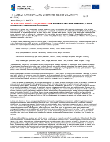 15. KAPITAŁ INTELEKTUALNY W BIZNESIE TO JEST WŁAŚNIE TO (05.2010) Autor Henryk S. KOLKA 15. ROZWAśANIA O WSPÓŁCZESNYM BIZNESIE, czyli O WIEDZY ORAZ INTELIGENCJI W BIZNESIE, a więc O FUNDAMENTACH KONKURENCYJNOŚCI (05.2010) Prawie wszyscy mówią dziś o globalizacji, biznesie, konkurencyjności, przedsiębiorczości i sukcesie biznesowym. Mówi się teŜ o gospodarce opartej na wiedzy, własności intelektualnej i wartościach niematerialnych, a takŜe o transferze IP (intellectual property). Mam wraŜenie, Ŝe nie zawsze chodzimy po ziemi, nie do końca zdajemy sobie sprawę z tego w jakim miejscu jest nasz kraj i jaka droga jest przed nami, by zrównać się z najlepszymi (przynajmniej w gronie europejskich krajów). Bezpośrednią inspiracją do zaprezentowania tych rozwaŜań stały się wnioski z analizy i klasyfikacji naszego kraju wg syntetycznego wskaźnika innowacyjności ( Summary Innovation Index-SSI)... Ta analiza została dokonana w oparciu o waŜoną sumę 29 wskaźników, którymi oceniono róŜne obszary związane z innowacyjnością w tym liczba absolwentów szkół wyŜszych, wydatki budŜetowe i firmowe na badania oraz innowacje, infrastruktura informacyjna – internet itp. Kraje europejskie zostały sklasyfikowane w czterech grupach: -liderzy innowacyjni (Szwajcaria, Szwecja, Finlandia, Niemcy, Dania i Wielka Brytania) -kraje goniące czołówkę (Austria, Luksemburg, Irlandia, Francja, Belgia i Holandia) -umiarkowani innowatorzy (Cypr, Estonia, Słowenia, Islandia, Czechy, Norwegia, Hiszpania, Portugalia i Włochy) -kraje nadrabiające opóźnienia (Malta, Grecja, Węgry, Słowacja, Polska, Litwa, Rumunia, Łotwa, Bułgaria i Turcja). Zaprezentowana klasyfikacja i szczegółowe wyniki naszego kraju w ostatniej ocenie nie są imponujące. Mnie niepokoi coś innego. Ta rankingowa klasyfikacja jest swoistą miarą myślenia o swojej przyszłości, pokazuje jaką uwagę przywiązuje oceniany kraj do budowy nowoczesnej gospodarki, jakie jest jego zaangaŜowanie w osiągnięcie wysokiego poziomu rozwoju i jakie znaczenie w jego polityce mają inwestycje w budowę potencjału wiedzy swojego społeczeństwa. PowyŜsza klasyfikacja skłoniła mnie do spojrzenia na świat biznesu z nieco innego, niŜ dotąd punktu widzenia. Zakładam, Ŝe kaŜdy z nas, kaŜdy człowiek biznesu chce zrozumieć otaczający go świat, zastanawia się nad tym, jakie ma szanse w przyszłości i od czego one zaleŜą. Proponuję, by tym razem moi czytelnicy (szczególnie menedŜerowie) wykorzystali zaprezentowane tu uwagi, jako pretekst do głębszej refleksji związanej z budową przyszłej pozycji konkurencyjnej swojej firmy ... 1.śyjemy w świecie konkurencyjnym. Konkurują na nim wszyscy, w prawie wszystkich dziedzinach Ŝycia społecznego. Konkurencja gospodarcza to rywalizacja podmiotów gospodarczych, których celem jest osiągnięcie korzyści związanych z prowadzoną działalnością. Ogólnie moŜna powiedzieć, Ŝe ta działalność ma sens ekonomiczny, gdy pozwala na uzyskanie nadwyŜki w stosunku do poniesionych nakładów. Niezdolność do spełniania tego warunku powinna wyeliminować taki podmiot z rynku. Oznacza to, Ŝe rynek ocenia konkurencyjność produktów oraz oferty rynkowej kaŜdej firmy i w swoim werdyktem stwarza warunki do kontynuacji działań i dalszego rozwoju tym firmom, które te oczywiste dla wszystkich wymagania spełniają, a daje sygnał ostrzegawczy lub nawet eliminuje te, które ich nie spełniają. W pewnym uproszczeniu moŜna teŜ powiedzieć, Ŝe warunkiem konkurencyjności produktu (oferowanego przez podmiot gospodarczy) jest jego zdolność do zapewnienia wartości dodanej tak dla klienta, jak i dla inwestora, a wyrób uznaje się za konkurencyjny, jeśli zapewni klientowi większą wartość dodaną, niŜ produkt rywala (o czym niekiedy zapominamy). 2.Świat jest obecnie w okresie postępującej globalizacji. Oznacza to, Ŝe podstawowym zadaniem kaŜdej firmy jest opanowanie umiejętności sprawnego poruszania się po globalnym rynku, postrzegania zachodzących na nim zmian i rozumienia ich istoty. Globalizacja to wyzwanie wymagające nieustannego poznawania świata (jego zmieniających się potrzeb, ale teŜ nowych moŜliwości) oraz duŜej zdolności do ciągłego gromadzenia, selekcjonowania, weryfikowania, aktualizowania i hierarchizowania wiedzy o rynkach. Wobec nieustannie i szybko następujących zmian kaŜdy musi nieustannie uczyć się tego świata, musi umieć swoje stare umiejętności korygować, a nowe zdobywać i umiejętnie łączyć ze starymi, juŜ zweryfikowanymi na rynku. To takŜe umiejętność trafnego lokalizowania w rozpoznanym, globalnym rynku swoich obecnych i przyszłych moŜliwości. Zrozumienie czym w takich warunkach jest zarządzanie działalnością gospodarczą i jaka jest w tym procesie rola menedŜera to pierwszy krok na drodze do sukcesu. 3. Zrozumieć świat biznesu, swoje w tym świecie szanse i moŜliwości to marzenie wszystkich menedŜerów, które niestety dla wielu przedstawicieli tego zawodu jest nieosiągalne. Ten świat w zasadzie nie ma stałych reguł i jednego słusznego rozwiązania w danej sytuacji. Nie ma teŜ uniwersalnego stylu zarządzania firmą, swoistej receptury, która dawałby pewność, a przynajmniej wysokie prawdopodobieństwo osiągnięcia przez nią sukcesu. Mówimy, Ŝe współczesny biznes jest na wskroś intelektualny co oznacza, Ŝe kaŜdą w nim sytuację trzeba rozpatrywać indywidualnie. Mówimy teŜ, Ŝe obecny etap, to etap gospodarki opartej na wiedzy, a dla znalezienia skutecznego (konkurencyjnego) rozwiązania problemu biznesowego niezbędna jest coraz bardziej zaawansowana wiedza, coraz wyŜszy poziom umiejętności oraz coraz sprawniej działająca wyobraźnia. ZA®ZĄDZANIE WŁASNOŚ©IĄ INTELEKTUALNĄ Dotacje na innowacje • Inwestujemy w waszą przyszłość Krajowa Izba Gospodarcza Biuro Projektów 00-074 Warszawa, ul. Trębacka 4; tel.: (022) 630 96 87; 630 98