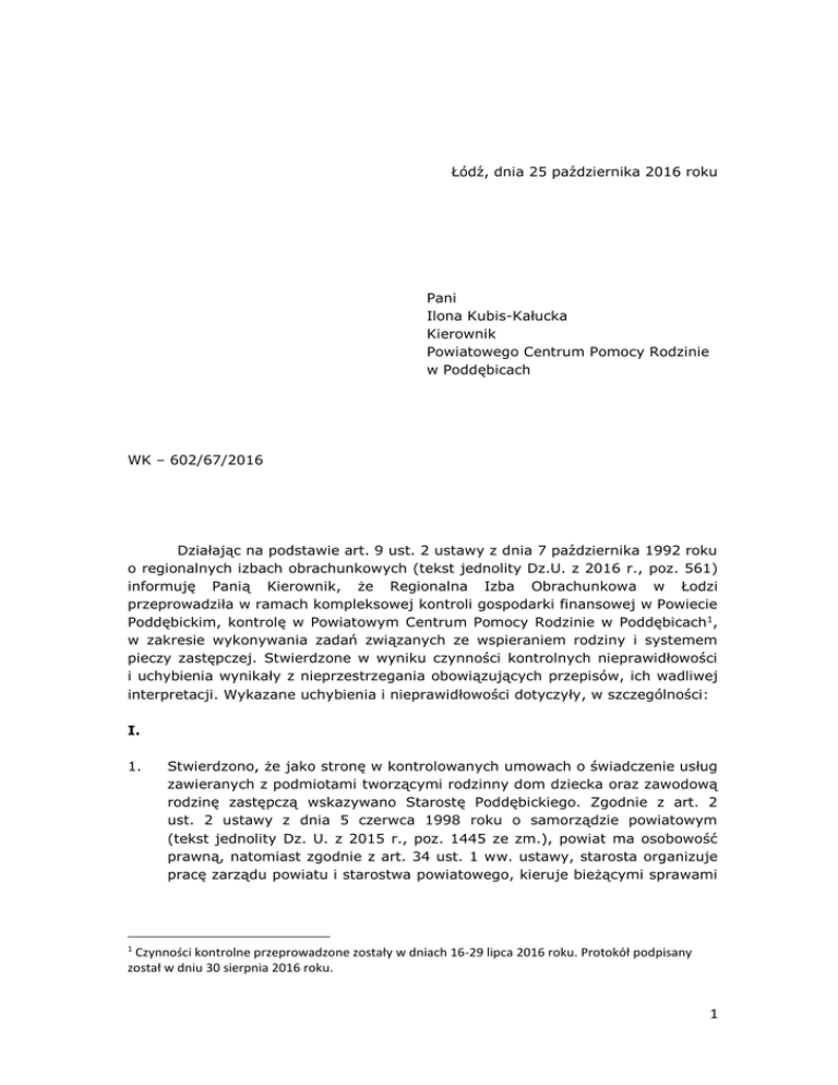 Łódź, dnia 25 października 2016 roku Pani Ilona Kubis-Kałucka Kierownik Powiatowego Centrum Pomocy Rodzinie w Poddębicach WK – 602/67/2016 Działając na podstawie art. 9 ust. 2 ustawy z dnia 7 października 1992 roku o regionalnych izbach obrachunkowych (tekst jednolity Dz.U. z 2016 r., poz. 561) informuję Panią Kierownik, że Regionalna Izba Obrachunkowa w Łodzi przeprowadziła w ramach kompleksowej kontroli gospodarki finansowej w Powiecie Poddębickim, kontrolę w Powiatowym Centrum Pomocy Rodzinie w Poddębicach1, w zakresie wykonywania zadań związanych ze wspieraniem rodziny i systemem pieczy zastępczej. Stwierdzone w wyniku czynności kontrolnych nieprawidłowości i uchybienia wynikały z nieprzestrzegania obowiązujących przepisów, ich wadliwej interpretacji. Wykazane uchybienia i nieprawidłowości dotyczyły, w szczególności: I. 1. Stwierdzono, że jako stronę w kontrolowanych umowach o świadczenie usług zawieranych z podmiotami tworzącymi rodzinny dom dziecka oraz zawodową rodzinę zastępczą wskazywano Starostę Poddębickiego. Zgodnie z art. 2 ust. 2 ustawy z dnia 5 czerwca 1998 roku o samorządzie powiatowym (tekst jednolity Dz. U. z 2015 r., poz. 1445 ze zm.), powiat ma osobowość prawną, natomiast zgodnie z art. 34 ust. 1 ww. ustawy, starosta organizuje pracę zarządu powiatu i starostwa powiatowego, kieruje bieżącymi sprawami 1 Czynności kontrolne przeprowadzone zostały w dniach 16-29 lipca 2016 roku. Protokół podpisany został w dniu 30 sierpnia 2016 roku. 1 powiatu oraz reprezentuje powiat na zewnątrz. Z powyższego wynika, że jako strona umowy powinien być wskazany powiat reprezentowany przez starostę. 2. Umowy o świadczenie usługi zawierane z podmiotami tworzącymi rodzinne domy dziecka nie zawierały wszystkich wymaganych elementów, wskazanych w art. 62 ust. 2 ustawy z dnia 9 czerwca 2011 roku o wspieraniu rodziny i systemie pieczy zastępczej (tekst jednolity Dz. U. z 2016 r., poz. 575), mianowicie: [1] wysokości kosztów utrzymania i eksploatacji lokalu mieszkalnego w budynku wielorodzinnym lub domu jednorodzinnego, w którym ma być prowadzony dom dziecka, [2] wysokości i warunków przyznawania środków finansowych na remonty lub pokrycie kosztów związanych ze zmianą lokalu mieszkalnego w budynku wielorodzinnym lub domu jednorodzinnego, w którym ma być prowadzony rodzinny dom dziecka. 3. W umowach o świadczenie usług z prowadzącymi rodzinny dom dziecka zostały zawarte postanowienia pozostające w sprzeczności z obowiązującymi przepisami prawa. Konkretnie dotyczyło to § 12 pkt 2 umów nr 54/OZ/13 i nr 213/OZ/13, który stanowił, że „Z chwilą uzyskania przez Powiat Poddębicki dofinansowania z budżetu państwa wydatków dotyczących prowadzenia Rodzinnego Domu Dziecka Zleceniobiorca może otrzymywać środki finansowe na: [1] zatrudnienie osoby do pomocy przy sprawowaniu opieki na dziećmi i przy pracach gospodarskich, [2] utrzymanie domu jednorodzinnego, [3] pokrycie kosztów związanych z remontem”. Natomiast zgodnie z art. 84 ww. ustawy, prowadzący rodzinny dom dziecka otrzymuje środki finansowe na: [1] utrzymanie lokalu mieszkalnego w budynku wielorodzinnym lub domu jednorodzinnego, w którym jest prowadzony rodzinny dom dziecka, [2] pokrycie niezbędnych kosztów związanych z remontem lub ze zmianą lokalu w budynku w budynku wielorodzinnym lub domu jednorodzinnego, w którym jest prowadzony rodzinny dom dziecka – do wysokości środków określonych w umowie, o której mowa w art. 62. 4. Umowa nr 290/OZ/13 o pełnienie funkcji rodziny zastępczej zawodowej nie zawierała wszystkich elementów wymienionych w art. 54 ust. 3 ustawy, a mianowicie maksymalnej liczby dzieci, którą można umieścić w danej rodzinie zastępczej. Natomiast sposób i zakres finansowania pieczy zastępczej w umowie został określony bardzo ogólnie, nie została określona wysokość świadczenia na pokrycie kosztów utrzymania dziecka w rodzinie zastępczej oraz możliwość pozyskania przez rodzinę dodatkowych świadczeń wskazanych w art. 83 ustawy. 5. W wyniku kontroli poprawności przyznawania środków finansowych na utrzymanie lokalu mieszkalnego w budynku wielorodzinnym lub domu jednorodzinnego w latach 2013-2015 roku stwierdzono następujące nieprawidłowości: w latach 2013-2014 przyznane decyzjami środki na utrzymanie lokalu nie wynikały ze sposobu obliczania wskazanego w art. 83 ust. 2 oraz art. 84 pkt 1 ww. ustawy. Ich wysokość była mniejsza od kosztów wynikających z załączonych do wniosków faktur. Było to spowodowane niewystarczającymi możliwościami finansowymi Powiatu, 2 w przypadku jednego z rodzinnych domów dziecka zaniżono kwotę należnych środków finansowych za pierwsze półrocze 2015 roku o kwotę 487,04 zł (decyzja PCPR-SPI.590.14.2015.DF), w przypadku drugiego rodzinnego domu dziecka zaniżono kwotę należnych środków finansowych za III kwartał 2015 roku o kwotę 28,92 zł (błędne rozliczenie faktury nr VAT nr 01584/1106/2/2015 z dnia 9 marca 2015 roku), w przypadku zastępczej rodziny zawodowej zaniżono kwotę należnych środków finansowych za okres od dnia 25 marca do dnia 20 kwietnia 2015 (decyzja PCPR-SPI.590.16.2015.DF) o kwotę 88,95 zł. Powyższe było spowodowane tym, że środki na utrzymanie lokalu mieszkalnego były liczone poprzez zsumowanie wszystkich ponoszonych kosztów (wymienionych w art. 83 ust. 2 i 84 ustawy), podzielenie tej kwoty przez liczbę osób zamieszkujących w tym lokalu a następnie pomnożenie przez liczbę dzieci i osób, które osiągnęły pełnoletność, przebywając w pieczy zastępczej, o których mowa w art. 37 ust. 2 ustawy, umieszczonych w rodzinie zastępczej lub rodzinnym domu dziecka wraz z prowadzącym rodzinny dom dziecka lub osobami tworzącymi tę rodzinę zastępcza, z tym że jako prowadzący został uwzględniony tylko jeden z małżonków. Zgodnie natomiast z art. 41 ust. 1 ustawy, rodzinny dom dziecka, podo