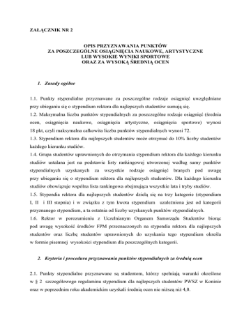 ZAŁĄCZNIK NR 2 OPIS PRZYZNAWANIA PUNKTÓW ZA POSZCZEGÓLNE OSIĄGNIĘCIA NAUKOWE, ARTYSTYCZNE LUB WYSOKIE WYNIKI SPORTOWE ORAZ ZA WYSOKĄ ŚREDNIĄ OCEN 1. Zasady ogólne 1.1. Punkty stypendialne przyznawane za poszczególne rodzaje osiągnięć uwzględniane przy ubieganiu się o stypendium rektora dla najlepszych studentów sumują się. 1.2. Maksymalna liczba punktów stypendialnych za poszczególne rodzaje osiągnięć (średnia ocen, osiągnięcia naukowe, osiągnięcia artystyczne, osiągnięcia sportowe) wynosi 18 pkt, czyli maksymalna całkowita liczba punktów stypendialnych wynosi 72. 1.3. Stypendium rektora dla najlepszych studentów moŜe otrzymać do 10% liczby studentów kaŜdego kierunku studiów. 1.4. Grupa studentów uprawnionych do otrzymania stypendium rektora dla kaŜdego kierunku studiów ustalana jest na podstawie listy rankingowej utworzonej według sumy punktów stypendialnych uzyskanych za wszystkie rodzaje osiągnięć branych pod uwagę przy ubieganiu się o stypendium rektora dla najlepszych studentów. Dla kaŜdego kierunku studiów obowiązuje wspólna lista rankingowa obejmująca wszystkie lata i tryby studiów. 1.5. Stypendia rektora dla najlepszych studentów dzielą się na trzy kategorie (stypendium I, II i III stopnia) i w związku z tym kwota stypendium uzaleŜniona jest od kategorii przyznanego stypendium, a ta ostatnia od liczby uzyskanych punktów stypendialnych. 1.6. Rektor w porozumieniu z Uczelnianym Organem Samorządu Studentów biorąc pod uwagę wysokość środków FPM przeznaczonych na stypendia rektora dla najlepszych studentów oraz liczbę studentów uprawnionych do uzyskania tego stypendium określa w formie pisemnej wysokości stypendium dla poszczególnych kategorii. 2. Kryteria i procedura przyznawania punktów stypendialnych za średnią ocen 2.1. Punkty stypendialne przyznawane są studentom, którzy spełniają warunki określone w § 2 szczegółowego regulaminu stypendium dla najlepszych studentów PWSZ w Koninie oraz w poprzednim roku akademickim uzyskali średnią ocen nie niŜszą niŜ 4,0. 2.2. Właściwe dziekanaty dokonują wyliczenia średnich ocen dla wszystkich studentów, którzy złoŜyli wniosek o stypendium rektora dla najlepszych studentów. 2.3. Na poszczególnych latach, kierunkach i trybach studiów tworzone są listy rankingowe studentów według średniej ocen uzyskanych w poprzednim roku akademickim. 2.4. Grupie 10 % najlepszych studentów z kaŜdej ostatecznej listy rankingowej według średniej ocen, którzy jednocześnie spełniają kryteria określone w pkt. 1 przyznawane są punkty stypendialne. W przypadku, gdy ostatnia osoba z wyŜej wymienionej grupy studentów ma taką samą średnią ocen jak kolejne osoby z ostatecznej listy rankingowej według średniej ocen, to osoby te naleŜy równieŜ zakwalifikować do grupy, której przyznawane są punkty stypendialne. 2.5. Punkty stypendialne przyznawane są w trzech kategoriach: kat. I - 18 punktów stypendialnych przyznawanych jest 3% liczby studentów z ostatecznej listy rankingowej według średniej ocen – przy czym dla wartości większej od 0,00 i mniejszej od 1,00 ustala się wartość 1; kat. II – 12 punktów stypendialnych przyznawanych jest 6% liczby studentów z ostatecznej listy rankingowej według średniej ocen po odjęciu liczby osób, którym przyznano punkty w I kategorii; kat. III – 6 punktów stypendialnych przyznawanych jest 10% liczby studentów z ostatecznej listy rankingowej według średniej ocen po odjęciu liczby osób, którym przyznano punkty w kategorii I i liczby osób, którym przyznano punkty w kategorii II. 2.6. Przy ustalaniu liczby studentów w poszczególnych kategoriach naleŜy stosować zasadę zaokrąglenia matematycznego, tzn.: od 0,00 do 0,49 zaokrąglenie w dół, natomiast od 0,50 do 0,99 zaokrąglenie w górę (z wyjątkiem opisanym w pkt 8 dla kat. I). 2.7. W przypadku, gdy na granicy poszczególnych kategorii znajdują się studenci z tą samą średnią, zostają oni zakwalifikowani do kategorii wyŜszej, a jednocześnie ulega zmniejszeniu odpowiednio kategoria niŜsza. 3. Kryteria przyznawania punktów stypendialnych za osiągnięcia naukowe i artystyczne 3.1. Punkty stypendialne za osiągnięcia naukowe i artystyczne przyznawane są w trzech kategoriach, odrębnie dla kaŜdego z rodzaju osiągnięć: kat. I - na szczeblu międzynarodowym, kat. II - na szczeblu krajowym, wojewódzkim, kat. III - na szczeblu regionalnym, miejskim, uczelnianym. 3.2. Za konferencję międzynarodową/konkurs międzynarodowy uznaje się takie, w których udział wzięła co najmniej jedna osoba spoza terytorium RP oraz językiem wykładowym konferencji/konkursu był język inny niŜ język polski. Student do wniosku o przyznanie stypendium rektora dołącza program konferencji/warunki udziału w konkursie, w której/którym uczestniczył. 3.3. Za udział w konferencji/konkursie przyznaje się punkty stypendialne w następujący sposób: kat. I – 3 pkt; kat. II - 2pkt; kat. III – 1 pkt. Punkty te nie sumują się i przyznawane są jednorazowo, w liczbie wynikającej z udziału w konferencji/konkursie o najwyŜszej kategorii (tylko jednej, odrębnie dla kaŜdego rodzaju osiągnięć). 3.4. Za wyróŜnienia i nagrody w konferencjach/konkursach, przyznaje się punkty stypendialne w następujący sposób: kat. I wyróŜnienie – 13 pkt; nagroda – 15 pkt kat. II wyróŜnienie – 8 pkt; nagroda – 10 pkt kat. III wyróŜnienie – 3 pkt; nagroda – 5 pkt Nagrody i wyróŜnienia uzyskane na róŜnych konferencjach/konkursach są sumowane, jeŜeli zostały uzyskane za oddzielne (róŜne) referaty/prezentacje/ postery/prace/inne formy. 3.5. Maksymalna liczba punktów za osiągnięcia naukowe wynosi 18 pkt, za osiągnięcia artystyczne wynosi 18 pkt. JeŜeli suma punktów za udział oraz wyróŜnienia i/lub nagrody – w poszczególnych kategoriach – jest wyŜsza od maksymalnej liczby punktów, to studentowi za dane osiąg