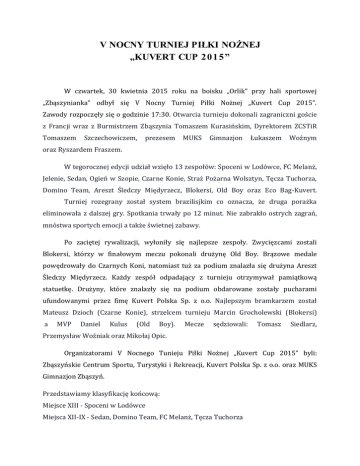 V NOCNY TURNIEJ PIŁKI NOŻNEJ „KUVERT CUP 2 0 1 5 ” W czwartek, 30 kwietnia 2015 roku na boisku „Orlik” przy hali sportowej „Zbąszynianka” odbył się V Nocny Turniej Piłki Nożnej „Kuvert Cup 2015”. Zawody rozpoczęły się o godzinie 17:30. Otwarcia turnieju dokonali zagraniczni goście z Francji wraz z Burmistrzem Zbąszynia Tomaszem Kurasińskim, Dyrektorem ZCSTiR Tomaszem Szczechowiczem, prezesem MUKS Gimnazjon Łukaszem Woźnym oraz Ryszardem Fraszem. W tegorocznej edycji udział wzięło 13 zespołów: Spoceni w Lodówce, FC Melanż, Jelenie, Sedan, Ogień w Szopie, Czarne Konie, Straż Pożarna Wolsztyn, Tęcza Tuchorza, Domino Team, Areszt Śledczy Międyrzecz, Blokersi, Old Boy oraz Eco Bag-Kuvert. Turniej rozegrany został system brazilisjkim co oznacza, że druga porażka eliminowała z dalszej gry. Spotkania trwały po 12 minut. Nie zabrakło ostrych zagrań, mnóstwa sportych emocji a także świetnej zabawy. Po zaciętej rywalizacji, wyłoniły się najlepsze zespoły. Zwycięzcami zostali Blokersi, którzy w finałowym meczu pokonali drużynę Old Boy. Brązowe medale powędrowały do Czarnych Koni, natomiast tuż za podium znalazła się drużyna Areszt Śledczy Międyrzecz. Każdy zespół odpadający z turnieju otrzymywał pamiątkową statuetkę. Drużyny, które znalazły się na podium obdarowane zostały pucharami ufundowanymi przez fimę Kuvert Polska Sp. z o.o. Najlepszym bramkarzem został Mateusz Dzioch (Czarne Konie), strzelcem turnieju Marcin Grocholewski (Blokersi) a MVP Daniel Kulus (Old Boy). Mecze sędziowali: Tomasz Siedlarz, Przemysław Woźniak oraz Mikołaj Opic. Organizatorami V Nocnego Tunieju Piłki Nożnej „Kuvert Cup 2015” byli: Zbąszyńskie Centrum Sportu, Turystyki i Rekreacji, Kuvert Polska Sp. z o.o. oraz MUKS Gimnazjon Zbąszyń. Przedstawiamy klasyfikację końcową: Miejsce XIII - Spoceni w Lodówce Miejsca XII-IX - Sedan, Domino Team, FC Melanż, Tęcza Tuchorza Miejsca VIII-VII - Ogień w Szopie, Eco-Bag Kuvert Miejsca VI-V - Straż Pożarna Wolsztyn, Jelenie Miejsce IV - Areszt Śledczy Międzyrzecz Miejsce III - Czarne Konie Miejsce II - Old Boy Miejsce I – Blokersi
