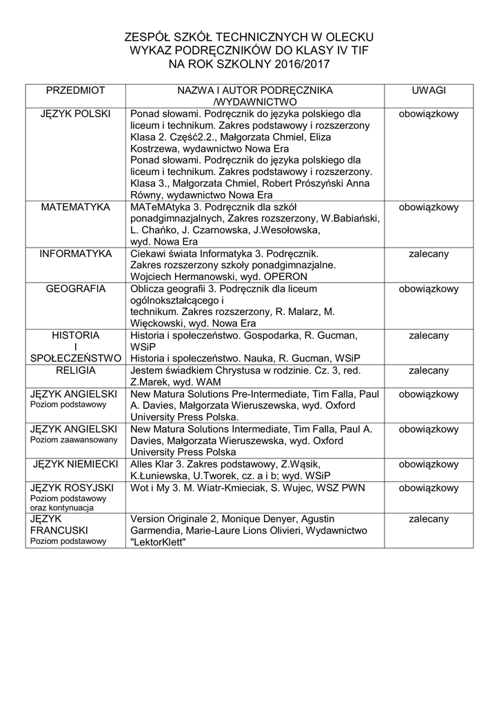 ZESPÓŁ SZKÓŁ TECHNICZNYCH W OLECKU WYKAZ PODRĘCZNIKÓW DO KLASY IV TIF NA ROK SZKOLNY 2016/2017 PRZEDMIOT NAZWA I AUTOR PODRĘCZNIKA /WYDAWNICTWO JĘZYK POLSKI Ponad słowami. Podręcznik do języka polskiego dla liceum i technikum. Zakres podstawowy i rozszerzony Klasa 2. Część2.2., Małgorzata Chmiel, Eliza Kostrzewa, wydawnictwo Nowa Era Ponad słowami. Podręcznik do języka polskiego dla liceum i technikum. Zakres podstawowy i rozszerzony. Klasa 3., Małgorzata Chmiel, Robert Prószyński Anna Równy, wydawnictwo Nowa Era MATEMATYKA MATeMAtyka 3. Podręcznik dla szkół ponadgimnazjalnych, Zakres rozszerzony, W.Babiański, L. Chańko, J. Czarnowska, J.Wesołowska, wyd. Nowa Era INFORMATYKA Ciekawi świata Informatyka 3. Podręcznik. Zakres rozszerzony szkoły ponadgimnazjalne. Wojciech Hermanowski, wyd. OPERON GEOGRAFIA Oblicza geografii 3. Podręcznik dla liceum ogólnokształcącego i technikum. Zakres rozszerzony, R. Malarz, M. Więckowski, wyd. Nowa Era HISTORIA Historia i społeczeństwo. Gospodarka, R. Gucman, I WSiP SPOŁECZEŃSTWO Historia i społeczeństwo. Nauka, R. Gucman, WSiP RELIGIA Jestem świadkiem Chrystusa w rodzinie. Cz. 3, red. Z.Marek, wyd. WAM JĘZYK ANGIELSKI New Matura Solutions Pre-Intermediate, Tim Falla, Paul Poziom podstawowy A. Davies, Małgorzata Wieruszewska, wyd. Oxford University Press Polska. JĘZYK ANGIELSKI New Matura Solutions Intermediate, Tim Falla, Paul A. Poziom zaawansowany Davies, Małgorzata Wieruszewska, wyd. Oxford University Press Polska JĘZYK NIEMIECKI Alles Klar 3. Zakres podstawowy, Z.Wąsik, K.Łuniewska, U.Tworek, cz. a i b; wyd. WSiP JĘZYK ROSYJSKI Wot i My 3. M. Wiatr-Kmieciak, S. Wujec, WSZ PWN UWAGI obowiązkowy obowiązkowy zalecany obowiązkowy zalecany zalecany obowiązkowy obowiązkowy obowiązkowy obowiązkowy Poziom podstawowy oraz kontynuacja JĘZYK FRANCUSKI Poziom podstawowy Version Originale 2, Monique Denyer, Agustin Garmendia, Marie-Laure Lions Olivieri, Wydawnictwo "LektorKlett" zalecany