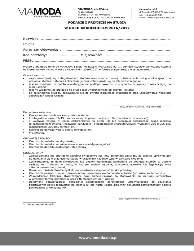 PODANIE O PRZYJĘCIE NA STUDIA W ROKU AKADEMICKIM 2016/2017 Nazwisko: ………………………………………………………………………………………………………………….…………… Imiona: ………………………………………………………..… ………………………..…………………………………..…… Adres zameldowania: ul. …………………………………………….………………………………………………………… Kod pocztowy: …………….……….…… Miejscowość: ……………………………………………………..………… PESEL …………………………………………………………………………………………………….………………………………. Proszę o przyjęcie mnie do VIAMODA Szkoły Wyższej w Warszawie na …… semestr studiów pierwszego stopnia na kierunku wzornictwo w roku akademickim 2016/2017 w formie stacjonarnej / niestacjonarnej* Oświadczam, że: zapoznałem(am) się z Regulaminem studiów oraz treścią Umowy o świadczenie usług edukacyjnych na poziomie studiów I stopnia i akceptuję je oraz zobowiązuję się do ich przestrzegania; jest mi wiadome, że opłata rekrutacyjna nie podlega zwrotowi w przypadku rezygnacji z winy leżącej po mojej stronie; jest mi wiadome, że przyjęcie na studia jest uwarunkowane od decyzji Rektora; po zakończeniu studiów zobowiązuję się do zwrotu legitymacji studenckiej oraz uregulowania wszelkich zobowiązań wobec Uczelni. ………………………………………………………………………… data, czytelnie nazwisko i imię kandydata Do podania załączam: Kwestionariusz osobowy kandydata na studia; 2 fotografie o wym. 35x45 mm bez nakrycia głowy, na jasnym tle (podpisane na rewersie); 1 kolorowe zdjęcie w wersji elektronicznej na płycie CD lub wcześniej dostarczone drogą mailową (z zaznaczeniem imienia i nazwiska kandydata) o następującej charakterystyce: wymiary: 236 x 295 pix, rozdzielczość: 300 dpi, format: JPG; Kserokopię dowodu wpłaty opłaty rekrutacyjnej; Prezentację; OBYWATELE POLSCY Kserokopię świadectwa dojrzałości; Kserokopię świadectwa ukończenia szkoły ponadgimnazjalnej; Kserokopię dowodu osobistego (obie strony); CUDZOZIEMCY Zalegalizowane lub opatrzone apostille świadectwo lub inny dokument uzyskany za granicą uprawniający do ubiegania się o przyjęcie na studia w uczelniach każdego typu w państwie wydania; Zaświadczenie, że dane świadectwo lub dyplom uprawniają kandydata do podjęcia studiów w uczelni wyższej na I stopniu w kraju, w którym zostały wydane, opatrzone apostille lub legalizacją wraz z tłumaczeniem na j. polski; Dokument (świadectwo/certyfikat) potwierdzający znajomość języka polskiego; Kserokopię paszportu wraz z dokumentem uprawniającym do pobytu w Polsce (np. wiza, karta pobytu); Zaświadczenie lekarskie stwierdzające brak przeciwwskazań do studiowania na kierunku wzornictwo w wybranej formie kształcenia wraz z tłumaczeniem na j. polski; Dokument potwierdzający posiadanie ubezpieczenia zdrowotnego uprawniającego do uzyskania podstawowej opieki medycznej na terenie RP lub Kartę Polaka albo inny dokument potwierdzający polskie pochodzenie z Konsulatu RP. ………………………………………………………………………… data i czytelnie imię i nazwisko kandydata ____________________ * niepotrzebne skreślić