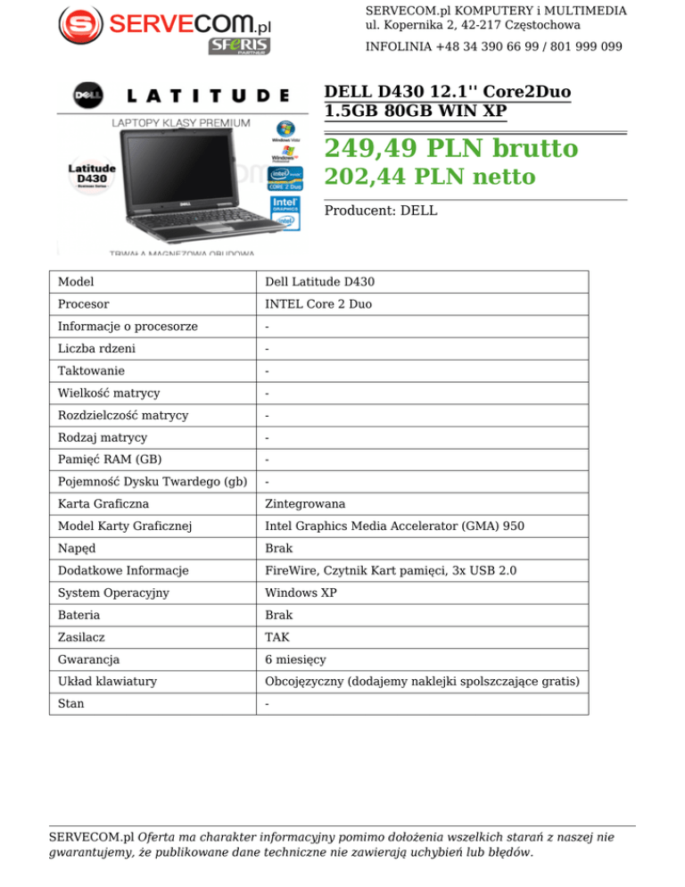 SERVECOM.pl KOMPUTERY i MULTIMEDIA ul. Kopernika 2, 42-217 Częstochowa INFOLINIA +48 34 390 66 99 / 801 999 099 DELL D430 12.1'' Core2Duo 1.5GB 80GB WIN XP 249,49 PLN brutto 202,44 PLN netto Producent: DELL Model Dell Latitude D430 Procesor INTEL Core 2 Duo Informacje o procesorze - Liczba rdzeni - Taktowanie - Wielkość matrycy - Rozdzielczość matrycy - Rodzaj matrycy - Pamięć RAM (GB) - Pojemność Dysku Twardego (gb) - Karta Graficzna Zintegrowana Model Karty Graficznej Intel Graphics Media Accelerator (GMA) 950 Napęd Brak Dodatkowe Informacje FireWire, Czytnik Kart pamięci, 3x USB 2.0 System Operacyjny Windows XP Bateria Brak Zasilacz TAK Gwarancja 6 miesięcy Układ klawiatury Obcojęzyczny (dodajemy naklejki spolszczające gratis) Stan - SERVECOM.pl Oferta ma charakter informacyjny pomimo dołożenia wszelkich starań z naszej nie gwarantujemy, że publikowane dane techniczne nie zawierają uchybień lub błędów.