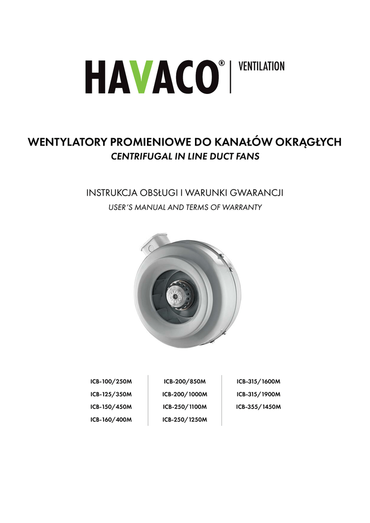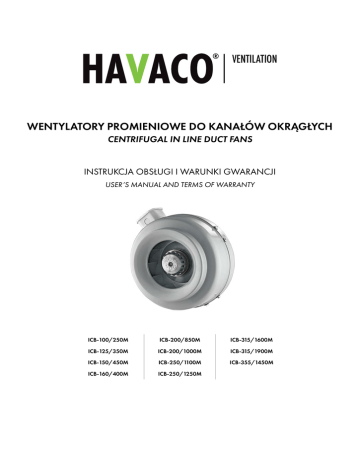 WENTYLATORY PROMIENIOWE DO KANAŁÓW OKRĄGŁYCH CENTRIFUGAL IN LINE DUCT FANS INSTRUKCJA OBSŁUGI I WARUNKI GWARANCJI USER’S MANUAL AND TERMS OF WARRANTY ICB-100/250M ICB-200/850M ICB-315/1600M ICB-125/350M ICB-200/1000M ICB-315/1900M ICB-150/450M ICB-250/1100M ICB-355/1450M ICB-160/400M ICB-250/1250M UWAGI DOTYCZĄCE BEZPIECZEŃSTWA \ SAFETY WARNINGS • Wentylatory posiadają części wirujące oraz połączenia elektryczne. Należy zachować szczególne środki ostrożności podczas montażu, konserwacji oraz użytkowania. • Podczas transportu, montażu i konserwacji, należy stosować rękawice ochronne. • Nie stosować przy temperaturze otoczenia przekraczającej 40°C • Podłączenia elektryczne muszą zostać wykonane przez uprawnionego elektryka, zgodnie z załączonymi schematami. • Fans contain rotating parts and electrical connections. Therefore, pay attention to safety warnings during their installation, maintenance and operation. • During transport, installation and maintenance, hands should be protected with gloves. • Do not use the product at ambient temperature over 40 °C. • Electrical connections must be carried out qualified electricians, according to attached wiring diagrams. TRANSPORT \ TRANSPORTATION • Wentylator należy transportować w oryginalnym opakowaniu, chroniąc go przed wibracjami, kurzem i związkami agresywnymi, dopóki nie zostanie dostarczony na miejsce montażu. • W przypadku stwierdzenia jakichkolwiek uszkodzeń należy sporządzić stosowny protokół w obecności dostawcy/kuriera, z dokładnym opisem uszkodzeń. • Po otrzymaniu wentylatora należy sprawdzić go pod kątem wszelkich uszkodzeń mogących powstać podczas transportu. Wirnik powinien obracać się swobodnie. • The fan should be kept in original package in a vibration-free, dust-free environment, away from aggressive substances until it’s delivered to the installation site. • Eventual damaged revealed must be communicated to the carrier and proper protocol should be made, specifying the type of damage. • The fan should be checked for any damage that may originated during transport – check if impeller rotates free of friction. INSTALACJA \ INSTALLATION • Parametry zasilania – napięcie oraz częstotliwość, muszą być zgodne z tabliczką znamionową wentylatora. • Sprawdzić czy pobór prądu – Natężenie (A) – nie przekracza wartości podanej na tabliczce znamionowej wentylatora. • Celem zapobieżenia przenoszeniu wibracji na instalację należy stosować złącza elastyczne. • Nie należy użytkować wentylatora w obszarach występowania gazów łatwopalnych lub agresywnych – mogą one spowodować nieodwracalne uszkodzenia wentylatora. • Wentylator może zostać zamontowany w dowolnej pozycji. • Sprawdzić kierunek obrotów wirnika. • Power supply, current and frequency values shall comply with the product label. • Check if consumption - Intensity I(A) - does not exceed maximum value, indicated on the fan nameplate. • Use elastic connectors to prevent transmitting the unit vibrations on to the installation. • Do not use the fan in an area in which flammable gasses, acidic or corrosive substances are present, as it may cause irreversible damage to the fan. • The fan can be mounted in any position. • Check if impeller rotates in the correct direction. 2 1. Kierunek przepływu powietrza Air flow direction 2. Wentylator ICB ICB Fan 3. Ściana Wall 4. Kanał okrągły Circular duct 5. Klamra Clamp 6. Uchwyt montażowy Mounting feet SCHEMAT PODŁĄCZENIA\ WIRING DIAGRAM *Większe jednostki mogą być dodatkowo wyposażone w zabezpieczenie termiczne. *Bigger units may be equipped with additional thermal protection. 3 RYSUNEK TECHNICZNY / TECHNICAL DRAWING Wymiary / Dimensions Typ / Type ICB-100/250 M ICB-125/350 M ICB-150/450 M ICB-160/400 M ICB-200/850 M ICB-200/1000 M ICB-250/1100 M ICB-250/1250 M ICB-315/1600 M ICB-315/1900 M ICB-355/1450 M A B C1 C2 D E F 245 245 272 272 330 330 330 330 400 400 400 97 122 147 157 196 196 247 247 313 313 352 22 20 23 23 30 30 30 30 30 30 30 22 20 25 25 28 28 28 28 30 30 30 197 188 192 192 230 230 227 227 285 285 387 273 273 286 286 380 380 380 380 415 415 415 268 268 295 295 352 352 352 352 422 422 422 DANE TECHNICZNE \ TECHNICAL DATA Typ / Type ICB-100/250 M ICB-125/350 M ICB-150/450 M ICB-160/400 M ICB-200/850 M ICB-200/1000 M ICB-250/1100 M ICB-250/1250 M ICB-315/1600 M ICB-315/1900 M ICB-355/1450 M [m3/h] [rpm] [W] [A] [V] [Hz] [μF] [dB(A)] [kg] 250 350 450 400 850 1000 1100 1250 1600 1900 1450 2580 2255 2345 2450 2315 2550 2550 2550 2400 2545 1380 60 80 85 80 85 110 120 140 170 200 130 0,27 0,35 0,37 0,35 0,37 0,48 0,53 0,61 0,74 0,87 0,57 230 230 230 230 230 230 230 230 230 230 230 50 50 50 50 50 50 50 50 50 50 50 2,0 2,5 2,5 2,5 2,5 4,0 4,0 5,0 5,0 7,0 4,0 44 49 51 50 49 51 53 54 52 54 47 3,4 3,4 3,7 3,5 5,3 5,6 5,8 6,3 7,1 8,2 11,2 CZYSZCZENIE I KONSERWACJA \ CLEANING AND MAINTENANCE • Przed rozpoczęciem czyszczenia lub konserwacji należy odłączyć wentylator od sieci elektrycznej. • Wentylator należy czyścić przy użyciu delikatnej szczotki lub wilgotnej ściereczki. • Wszystkie połączenia elektryczne powinny być regularnie sprawdzane – wszystkie uszkodzone lub zużyte przewody powinny zostać wymienione. • Podczas czyszczenia wirnika należy zwrócić szczególną uwagę na ciężarki wyrównoważające. • Okresowe prace konserwacyjne powinny być prowadzone przynajmniej raz w ciągu 6 miesięcy celem zapobieżenia gromadzenia się kurzu wewnątrz urządzenia, mogącego prowadzić do obniżenia parametrów pracy, lub utraty wyważenia wirnika, co znacznie skróci żywotność wentylatora. 4 • Sprawdzić śruby, które mogły się poluzować podczas pracy urządzenia. • Before cleaning or maintenance disconnect the fan from the mains supply. • All electrical connections should be regularly controlled – any wornout or damaged cables should be replaced