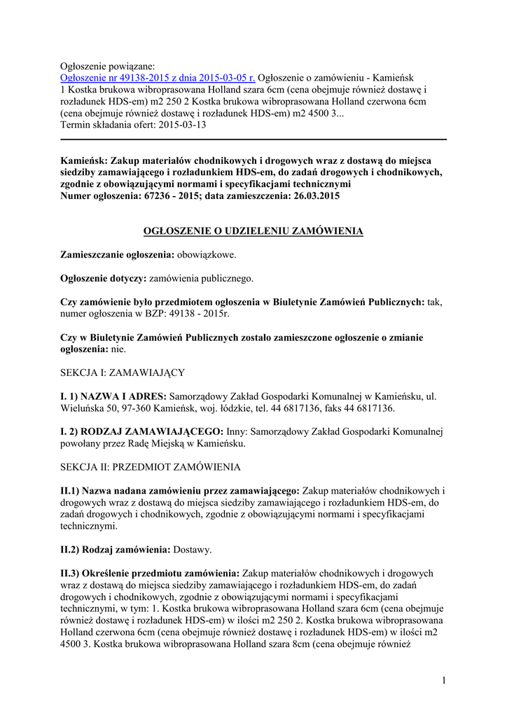 Ogłoszenie powiązane: Ogłoszenie nr 49138-2015 z dnia 2015-03-05 r. Ogłoszenie o zamówieniu - Kamieńsk 1 Kostka brukowa wibroprasowana Holland szara 6cm (cena obejmuje również dostawę i rozładunek HDS-em) m2 250 2 Kostka brukowa wibroprasowana Holland czerwona 6cm (cena obejmuje również dostawę i rozładunek HDS-em) m2 4500 3... Termin składania ofert: 2015-03-13 Kamieńsk: Zakup materiałów chodnikowych i drogowych wraz z dostawą do miejsca siedziby zamawiającego i rozładunkiem HDS-em, do zadań drogowych i chodnikowych, zgodnie z obowiązującymi normami i specyfikacjami technicznymi Numer ogłoszenia: 67236 - 2015; data zamieszczenia: 26.03.2015 OGŁOSZENIE O UDZIELENIU ZAMÓWIENIA Zamieszczanie ogłoszenia: obowiązkowe. Ogłoszenie dotyczy: zamówienia publicznego. Czy zamówienie było przedmiotem ogłoszenia w Biuletynie Zamówień Publicznych: tak, numer ogłoszenia w BZP: 49138 - 2015r. Czy w Biuletynie Zamówień Publicznych zostało zamieszczone ogłoszenie o zmianie ogłoszenia: nie. SEKCJA I: ZAMAWIAJĄCY I. 1) NAZWA I ADRES: Samorządowy Zakład Gospodarki Komunalnej w Kamieńsku, ul. Wieluńska 50, 97-360 Kamieńsk, woj. łódzkie, tel. 44 6817136, faks 44 6817136. I. 2) RODZAJ ZAMAWIAJĄCEGO: Inny: Samorządowy Zakład Gospodarki Komunalnej powołany przez Radę Miejską w Kamieńsku. SEKCJA II: PRZEDMIOT ZAMÓWIENIA II.1) Nazwa nadana zamówieniu przez zamawiającego: Zakup materiałów chodnikowych i drogowych wraz z dostawą do miejsca siedziby zamawiającego i rozładunkiem HDS-em, do zadań drogowych i chodnikowych, zgodnie z obowiązującymi normami i specyfikacjami technicznymi. II.2) Rodzaj zamówienia: Dostawy. II.3) Określenie przedmiotu zamówienia: Zakup materiałów chodnikowych i drogowych wraz z dostawą do miejsca siedziby zamawiającego i rozładunkiem HDS-em, do zadań drogowych i chodnikowych, zgodnie z obowiązującymi normami i specyfikacjami technicznymi, w tym: 1. Kostka brukowa wibroprasowana Holland szara 6cm (cena obejmuje również dostawę i rozładunek HDS-em) w ilości m2 250 2. Kostka brukowa wibroprasowana Holland czerwona 6cm (cena obejmuje również dostawę i rozładunek HDS-em) w ilości m2 4500 3. Kostka brukowa wibroprasowana Holland szara 8cm (cena obejmuje również 1 dostawę i rozładunek HDS-em) w ilości m2 250 4. Kostka brukowa wibroprasowana Holland czerwona 8cm (cena obejmuje również dostawę i rozładunek HDS-em) w ilości m2 300 5. Kostka brukowa wibroprasowana Holland grafitowa 6cm (cena obejmuje również dostawę i rozładunek HDS-em) w ilości m2 300 6. Kostka brukowa wibroprasowana Holland grafitowa 8 cm (cena obejmuje również dostawę i rozładunek HDS-em) w ilości m2 2500 7. Kostka brukowa wibroprasowana Holland zielona 6 cm bez fazy (z przeznaczeniem na ścieżki rowerowe) (cena obejmuje również dostawę i rozładunek HDS-em) w ilości m2 2000 8. Kostka brukowa Creativ pastelowa harmonia 6cm o wymiarach w komplecie m2: 54mmx64mmx83mm, 64mmx74mmx83mm, 74mmx84mmx83mm, 84mmx94mmx83mm, 94mmx104mmx83mm (cena obejmuje również dostawę i rozładunek HDS-em) w ilości m2 128,15 9. Kostka brukowa Creativ granit czarny 6cm o wymiarach w komplecie m2: 54mmx64mmx83mm, 64mmx74mmx83mm, 74mmx84mmx83mm, 84mmx94mmx83mm, 94mmx104mmx83mm (cena obejmuje również dostawę i rozładunek HDS-em) w ilości m2 11,65 10. Obrzeże trawnikowe Standard grafit 80mmx250mmx1000mm (cena obejmuje również dostawę i rozładunek HDS-em) w ilości mb 99 11. Obrzeże Bordir pastelowa harmonia 100mmx125mmx250mm, w tym: - proste w ilości 140 m - skośne wewnętrzne 60 m (cena obejmuje również dostawę i rozładunek HDS-em) w ilości 200 m 12. Krawężnik drogowy szary 15x30x100 cm (cena obejmuje również dostawę i rozładunek HDS-em) mb 3000 13. Krawężnik drogowy szary 20x30x100 cm (cena obejmuje również dostawę i rozładunek HDS-em) mb 300 14. Obrzeże chodnikowe szare 6x20x100 cm (cena obejmuje również dostawę i rozładunek HDS-em) mb 300 15. Obrzeże chodnikowe czerwone 6x20x100 cm (cena obejmuje również dostawę i rozładunek HDS-em) mb 1500 16. Obrzeże chodnikowe grafitowe 6x20x100 cm (cena obejmuje również dostawę i rozładunek HDS-em) mb 800 17. Obrzeże chodnikowe szare 8x30x100 cm (cena obejmuje również dostawę i rozładunek HDS-em) mb 300 18. Obrzeże chodnikowe czerwone 8x30x100 cm (cena obejmuje również dostawę i rozładunek HDS-em) mb 1000 19. Krawężnik betonowy najazdowy szary 15x22x100 cm (cena obejmuje również dostawę i rozładunek HDS-em) mb 1000 20. Krawężnik betonowy skośny szary 15x22x30 cm (cena obejmuje również dostawę i rozładunek HDS-em) mb 500 Ilości przedmiotu umowy wskazane wyżej są ilościami maksymalnymi, dlatego też Zamawiający zastrzega sobie prawo zakupu mniejszej ilości materiałów chodnikowych i drogowych, wymienionych w powyższej tabeli lub całkowitej rezygnacji z danego asortymentu. Wykonawcy nie przysługują żadne roszczenia z tytułu zamówienia przez Zamawiającego mniejszej ilości materiałów niż te, które zostały wymienione powyżej. II.4) Wspólny Słownik Zamówień (CPV): 44.11.38.10-6. SEKCJA III: PROCEDURA III.1) TRYB UDZIELENIA ZAMÓWIENIA: Przetarg nieograniczony III.2) INFORMACJE ADMINISTRACYJNE • Zamówienie dotyczy projektu/programu finansowanego ze środków Unii Europejskiej: nie SEKCJA IV: UDZIELENIE ZAMÓWIENIA IV.1) DATA UDZIELENIA ZAMÓWIENIA: 26.03.2015. 2 IV.2) LICZBA OTRZYMANYCH OFERT: 2. IV.3) LICZBA ODRZUCONYCH OFERT: 1. IV.4) NAZWA I ADRES WYKONAWCY, KTÓREMU UDZIELONO ZAMÓWIENIA: • Kost-Bet Spółka Jawna Krzysztof Matyja Paweł Matyja, ul. Ułańska 15, 42-120 Miedźno, kraj/woj. śląskie. IV.5) Szacunkowa wartość zamówienia (bez VAT): 399040,00 PLN. IV.6) INFORMACJA O CENIE WYBRANEJ OFERTY ORAZ O OFERTACH Z NAJNIŻSZĄ I NAJWYŻSZĄ CENĄ • • • Cena wybranej oferty: 286458,30 Oferta z najniższą ceną: 277652,75 / Oferta z najwyższą ceną: 286458,30 Waluta: PLN. p.o. Dyrektor Karol Trajdos 