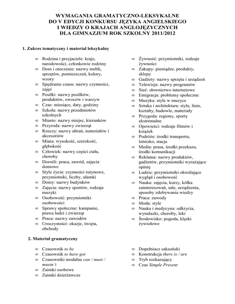 WYMAGANIA GRAMATYCZNO-LEKSYKALNE DO V EDYCJI KONKURSU JĘZYKA ANGIELSKIEGO I WIEDZY O KRAJACH ANGLOJĘZYCZNYCH DLA GIMNAZJUM ROK SZKOLNY 2011/2012 1. Zakres tematyczny i materiał leksykalny • • • • • • • • • • • • • • • • • • • Rodzina i przyjaciele: kraje, narodowości, członkowie rodziny Dom i otoczenie: nazwy mebli, sprzętów, pomieszczeń, kolory, wzory Spędzanie czasu: nazwy czynności, zajęć Posiłki: nazwy posiłków, produktów, owoców i warzyw Czas: miesiące, daty, godziny Szkoła: nazwy przedmiotów szkolnych Miasto: nazwy miejsc, kierunków Przyroda: nazwy zwierząt Rzeczy: nazwy ubrań, materiałów i akcesoriów Miara: wysokość, szerokość, głębokość Człowiek: nazwy części ciała, choroby Dorośli: praca, zawód, zajęcia domowe Style życia: czynności rutynowe, przymiotniki, liczby, ułamki Domy: nazwy budynków Zajęcia: nazwy sportów, rodzaje muzyki Osobowość: przymiotniki osobowości Sprawy społeczne: kampanie, prawa ludzi i zwierząt Praca: nazwy zawodów Uroczystości: okazje, święta, obchody • • • • • • • • • • • • • • • • • • • Żywność: przymiotniki, rodzaje żywności Zakupy: pieniądze, produkty, sklepy Gadżety: nazwy sprzętu i urządzeń Telewizja: nazwy programów Sieć: słownictwo internetowe Emigracja: problemy społeczne Muzyka: style w muzyce Sztuka i architektura: style, linie, kształty, budowle, materiały Przygoda: regiony, sporty ekstremalne Opowieści: rodzaje filmów i książek Podróże: środki transportu, lotnisko, stacja Media: prasa, środki przekazu, środki komunikacji Reklama: nazwy produktów, gadżetów, przymiotniki wyrażające opinię Ludzie: przymiotniki określające wygląd i osobowość Nauka: zajęcia, kursy, kółka zainteresowań, sale, urządzenia, sposoby zdobywania wiedzy Praca: zawody Moda: style Nauka i medycyna: odkrycia, wynalazki, choroby, leki Środowisko: pogoda, klęski żywiołowe 2. Materiał gramatyczny • • • • • Czasownik to be Czasownik to have got Czasowniki modalne can / must / mustn’t Zaimki osobowe Zaimki dzierżawcze • • • • Dopełniacz saksoński Konstrukcja there is / are Tryb rozkazujący Czas Simple Present • • • • • • • • • • • • • • • Przysłówki częstotliwości Rzeczowniki policzalne i niepoliczalne Określniki some / any Przedimek określony the Przedimek nieokreślony a / an Czas Present Continuous Konstrukcja be going to Konstrukcja like / love + gerund Czas Past Simple czasownik to be, czasowniki regularne i nieregularne Czasownik modalny should Czas Past Continuous Czas przyszły Future Simple I, II i zerowy tryb warunkowy Czas Present Perfect Użycie since / for • • • • • • • • • • • • • • • • • Stopniowanie przymiotników Przysłówki Czasownik modalny need / needn’t Zdania przydawkowe z who /which / where Question tags Strona bierna czasów prostych Mowa zależna: prośby i rozkazy Konstrukcja z While / As / When Czasowniki stanu i czynności Czas Past Perfect Konstrukcja used to / would Czas Present Perfect Continuous Zaimki zwrotne III tryb warunkowy Verb Patterns Mowa zależna: zdania twierdzące i pytające Konstrukcja wish / should have 3. Komponent kulturowy -wiedza ogólna z zakresu: • • • • • • • • • • Życie codzienne i obyczaje Święta i uroczystości Historia Geografia Zabytki i architektura Sławni ludzie Literatura Legendy Muzyka Film Wielka Brytania (Anglia, Szkocja, Walia), Irlandia, USA, Kanada, Australia, Nowa Zelandia
