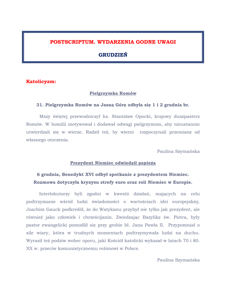 POSTSCRIPTUM. WYDARZENIA GODNE UWAGI GRUDZIEŃ Katolicyzm: Pielgrzymka Romów 31. Pielgrzymka Romów na Jasną Górę odbyła się 1 i 2 grudnia br. Mszy świętej przewodniczył ks. Stanisław Opocki, krajowy duszpasterz Romów. W homilii motywował i dodawał odwagi pielgrzymom, aby nieustannie utwierdzali się w wierze. Radził też, by wierni rozpoczynali przemianę od własnego otoczenia. Paulina Szymańska Prezydent Niemiec odwiedził papieża 6 grudnia, Benedykt XVI odbył spotkanie z prezydentem Niemiec. Rozmowa dotyczyła kryzysu strefy euro oraz roli Niemiec w Europie. Interlokutorzy byli zgodni w kwestii działań, mających na celu podtrzymanie wśród ludzi świadomości o wartościach idei europejskiej. Joachim Gauck podkreślił, że do Watykanu przybył nie tylko jak prezydent, ale również jako człowiek i chrześcijanin. Zwiedzając Bazylikę św. Piotra, były pastor ewangelicki pomodlił się przy grobie bł. Jana Pawła II. Przypomniał o sile wiary, która w trudnych momentach podtrzymywała ludzi na duchu. Wyraził też podziw wobec oporu, jaki Kościół katolicki wykazał w latach 70 i 80. XX w. przeciw komunistycznemu reżimowi w Polsce. Paulina Szymańska Judaizm: In vitro i aborcja wśród Samarytan Samarytanie starają się w pełni przestrzegać starotestamentalnych zasad, do których między innymi należy zawieranie kazirodczych małżeństw. Mniej ortodoksyjni członkowie społeczności, dopiero niedawno zrezygnowali ze związków z kuzynami. Jednak, wielu wyznawców pozostało wiernych tradycji. Małżeństwa, zawierane w obrębie tej samej wspólnoty, mogą przyczynić się do chorób genetycznych potomstwa. Wśród najczęściej występujących dysfunkcji wymienia się: rzadkie choroby krwi, zespół Ushera, głuchotę, niemotę, ślepotę i różne rodzaje niepełnosprawności. Pomimo że związki między spokrewnionymi ze sobą osobami, rodzą wiele niebezpieczeństw - część Samarytan nie chce zrezygnować z tego elementu tradycji. Z jednej strony, celem wyznawców jest zachowanie ciągłości rodu, ale z drugiej równie istotną kwestię stanowi czystość krwi. Z tego względu, współcześni Samarytanie coraz częściej korzystają z dorobku medycyny, w tym technik biomedycznych: testów genetycznych, zapłodnienia in vitro oraz aborcji. Wykorzystując kontrowersyjne metody, Samarytanie kontrolują rozwój płodu, a w przypadku gdy zarodek kształci się wadliwie, rodzice mogą zadecyydować o aborcji. Zasadność tego stanowiska kwestionują ultraortodoksyjni Żydzi, którzy sprzeciwiają się usuwaniu ciąży. Paulina Szymańska Protestantyzm: Protestancka misjonarka zabita w Pakistanie 3 grudnia protestancka misjonarka padła ofiarą zamachu terrorystycznego w Lahaurze. 72-letnia Bargeeta Almby zmarła po tygodniu od postrzelenia. To wydarzenie wstrząsnęło wspólnotą protestancką w Szwecji. Bargeeta Almby pracowała w Pakistanie od prawie czterdziestu lat. Pomagała sierotom, niepełnosprawnym dzieciom oraz ludziom potrzebującym. Oprócz pracy socjalnej, oddana była dziełu edukacyjnemu. Nie była jednak związana z jakąkolwiek działalnością polityczną. Misjonarka została ostrzelana z broni maszynowej przed drzwiami swego mieszkania. W ciężkim stanie przewieziono ją do szpitala w Sztokholmie, gdzie po tygodniu zmarła. Sprawcy zamachu nie zostali schwytani. Dorota Rybak Islam: Terroryzm w islamie W raporcie, opublikowanym przez Institute for Economics and Peace [IEP] podano, że „najprężniej działające religijne ugrupowania terrorystyczne są niemal w 100% islamskie”. Dokument, opracowany przez IEP Global Terrorism Index 2012, opracowano w opaciu o listę 158 krajów powiązanych z terroryzmem w okresie 2001-11. Zaś, indeks wzorowano na informacjach zawartych w Global Terrorism Database [GTD]. Autorzy raportu poddali analizie zarówno liczbę ataków, jak i liczbę ofiar śmiertelnych. W pierwszej piątce znalazły się: Irak, Pakistan, Afganistan, Indie oraz Jemen. Dorota Rybak Źródła - dowiedz się więcej: Ganswein G., Prezydent Niemiec u Papieża, „Niedziela. Tygodnik Katolicki”, nr 51(2012), s. 4. Ganswein G., Pielgrzymka Romów, „Niedziela. Tygodnik Katolicki”, nr 51(2012), s. 6. http://religia.onet.pl/publicystyka,6/genetyka-ocali-samarytan,52294.html http://pl.radiovaticana.va/articolo.asp?c=647681 http://www.euroislam.pl/index.php/2012/12/islam-ma-niemalwylacznosc-na-terroryzm/