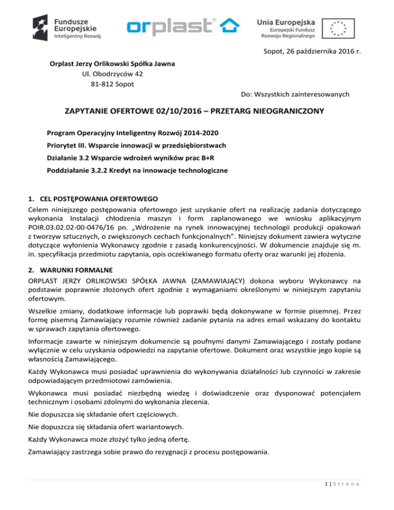 Sopot, 26 października 2016 r. Orplast Jerzy Orlikowski Spółka Jawna Ul. Obodrzyców 42 81-812 Sopot Do: Wszystkich zainteresowanych ZAPYTANIE OFERTOWE 02/10/2016 – PRZETARG NIEOGRANICZONY Program Operacyjny Inteligentny Rozwój 2014-2020 Priorytet III. Wsparcie innowacji w przedsiębiorstwach Działanie 3.2 Wsparcie wdrożeń wyników prac B+R Poddziałanie 3.2.2 Kredyt na innowacje technologiczne 1. CEL POSTĘPOWANIA OFERTOWEGO Celem niniejszego postępowania ofertowego jest uzyskanie ofert na realizację zadania dotyczącego wykonania Instalacji chłodzenia maszyn i form zaplanowanego we wniosku aplikacyjnym POIR.03.02.02-00-0476/16 pn. „Wdrożenie na rynek innowacyjnej technologii produkcji opakowań z tworzyw sztucznych, o zwiększonych cechach funkcjonalnych”. Niniejszy dokument zawiera wytyczne dotyczące wyłonienia Wykonawcy zgodnie z zasadą konkurencyjności. W dokumencie znajduje się m. in. specyfikacja przedmiotu zapytania, opis oczekiwanego formatu oferty oraz warunki jej złożenia. 2. WARUNKI FORMALNE ORPLAST JERZY ORLIKOWSKI SPÓŁKA JAWNA (ZAMAWIAJĄCY) dokona wyboru Wykonawcy na podstawie poprawnie złożonych ofert zgodnie z wymaganiami określonymi w niniejszym zapytaniu ofertowym. Wszelkie zmiany, dodatkowe informacje lub poprawki będą dokonywane w formie pisemnej. Przez formę pisemną Zamawiający rozumie również zadanie pytania na adres email wskazany do kontaktu w sprawach zapytania ofertowego. Informacje zawarte w niniejszym dokumencie są poufnymi danymi Zamawiającego i zostały podane wyłącznie w celu uzyskania odpowiedzi na zapytanie ofertowe. Dokument oraz wszystkie jego kopie są własnością Zamawiającego. Każdy Wykonawca musi posiadać uprawnienia do wykonywania działalności lub czynności w zakresie odpowiadającym przedmiotowi zamówienia. Wykonawca musi posiadać niezbędną wiedzę i doświadczenie oraz dysponować potencjałem technicznym i osobami zdolnymi do wykonania zlecenia. Nie dopuszcza się składanie ofert częściowych. Nie dopuszcza się składania ofert wariantowych. Każdy Wykonawca może złożyć tylko jedną ofertę. Zamawiający zastrzega sobie prawo do rezygnacji z procesu postępowania. 1|S t r o n a Zaoferowana Instalacja chłodzenia maszyn i form oraz urządzenia wchodzące w jej skład muszą być fabrycznie nowe. Oferowana Instalacja chłodzenia maszyn i form oraz wszystkie urządzenia wchodzące w jej skład muszą posiadać gwarancję na minimum 12 miesięcy od daty dostawy oraz instalacji u Zamawiającego. Wszelkie koszty przygotowania i dostarczenia oferty ponosi Oferent. Każdy z Oferentów otrzyma informację o rozstrzygnięciu, wstrzymaniu lub odstąpieniu od postępowania. 3. INFORMACJA NA TEMAT ZAKRESU WYKLUCZENIA W celu uniknięcia konfliktu interesów, w postępowaniu nie mogą brać udziału podmioty powiązane z ORPLAST JERZY ORLIKOWSKI SPÓŁKA JAWNA osobowo lub kapitałowo. Przez powiązania kapitałowe lub osobowe rozumie się wzajemne powiązania między Zamawiającym lub osobami upoważnionymi do zaciągania zobowiązań w imieniu Zamawiającego lub osobami wykonującymi w imieniu Zamawiającego czynności związane z przygotowaniem i przeprowadzeniem procedury wyboru wykonawcy a wykonawcą, polegające w szczególności na: a) uczestniczeniu w spółce jako wspólnik spółki cywilnej lub spółki osobowej, b) posiadaniu co najmniej 10 % udziałów lub akcji, c) pełnieniu funkcji członka organu nadzorczego lub zarządzającego, prokurenta, pełnomocnika, d) pozostawaniu w związku małżeńskim, w stosunku pokrewieństwa lub powinowactwa w linii prostej, pokrewieństwa drugiego stopnia lub powinowactwa drugiego stopnia w linii bocznej lub w stosunku przysposobienia, opieki lub kurateli. Udzielenie zamówienia podmiotowi powiązanemu jest naruszeniem zasady konkurencyjności. 4. FORMAT OFERTY Oferta powinna być sporządzona w języku polskim. Oferta musi zawierać wycenę oraz opis oferowanej Instalacja chłodzenia maszyn i form oraz wszystkich urządzeń wchodzących w jej skład zgodnie ze specyfikacją wymogów technicznych zapytania. Wycena powinna być dokonana w cenach netto w złotych polskich. Zamawiający dopuszcza składanie ofert również w euro oraz dolarach amerykańskich. Jeśli ceny na ofercie będą wyrażone w innej walucie niż złoty polski to podczas wyboru najkorzystniejszej oferty będą one przeliczane przy zastosowaniu średniego kursu sprzedaży ogłaszanego przez NBP, obowiązującego w ostatnim dniu roboczym poprzedzającym dzień dokonywania wyboru. Oferta musi zostać sporządzona na czytelnie wypełnionym i podpisanym formularzu ofertowym stanowiącym Załącznik nr 1 do niniejszego zapytania. W ofercie należy wskazać okres przyznawanej gwarancji na przedmiot zapytania ofertowego oraz warunki płatności. W ofercie należy wskazać termin ważności oferty (minimum 90 dni) i dane osoby kontaktowej. Oferty złożone po terminie nie będą brane pod uwagę. 2|S t r o n a Do oceny ofert brane będą pod uwagę tylko oferty spełniające w całości wymagania określone w zapytaniu. Zamawiający posiada prawo do odrzucenia oferty, jeśli oferta jest niekompletna lub niezgodna z zapytaniem. 5. TERMIN ORAZ SPOSÓB SKŁADANIA OFERT Oferty prosimy składać pocztą elektroniczną na podany adres e-mail, w pliku zabezpieczonym przed edycją np. PDF lub opcjonalnie w 1 egzemplarzu papierowym do dnia 10-11-2016 r. do godziny 14:00. ORPLAST JERZY ORLIKOWSKI SPÓŁKA JAWNA UL. OBODRZYCÓW 42 81-812 SOPOT [email protected] Dodatkowych wyjaśnień w sprawie postępowania udzielać będzie: Jerzy Orlikowski tel. +48 602 216 869 mail: [email protected] Wykonawca przed upływem terminu do składania ofert ma prawo: wycofać ofertę poprzez złożenie pisemnego powiadomienia drogą opisaną dla składania ofert, zmienić ofertę - powiadomienie o wprowadzeniu zmian musi być złożone wg takich samych zasad jak składana oferta, odpowiednio oznakowanych z dopiskiem „ZA