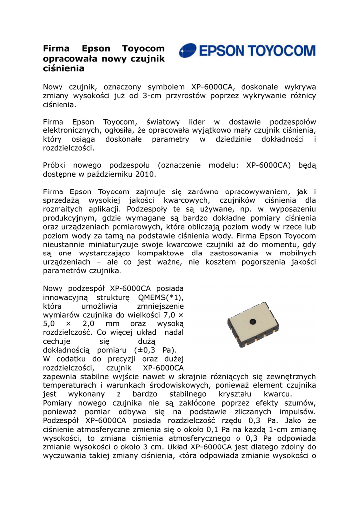 Firma Epson Toyocom opracowała nowy czujnik ciśnienia Nowy czujnik, oznaczony symbolem XP-6000CA, doskonale wykrywa zmiany wysokości już od 3-cm przyrostów poprzez wykrywanie różnicy ciśnienia. Firma Epson Toyocom, światowy lider w dostawie podzespołów elektronicznych, ogłosiła, że opracowała wyjątkowo mały czujnik ciśnienia, który osiąga doskonałe parametry w dziedzinie dokładności i rozdzielczości. Próbki nowego podzespołu (oznaczenie dostępne w październiku 2010. modelu: XP-6000CA) będą Firma Epson Toyocom zajmuje się zarówno opracowywaniem, jak i sprzedażą wysokiej jakości kwarcowych, czujników ciśnienia dla rozmaitych aplikacji. Podzespoły te są używane, np. w wyposażeniu produkcyjnym, gdzie wymagane są bardzo dokładne pomiary ciśnienia oraz urządzeniach pomiarowych, które obliczają poziom wody w rzece lub poziom wody za tamą na podstawie ciśnienia wody. Firma Epson Toyocom nieustannie miniaturyzuje swoje kwarcowe czujniki aż do momentu, gdy są one wystarczająco kompaktowe dla zastosowania w mobilnych urządzeniach – ale co jest ważne, nie kosztem pogorszenia jakości parametrów czujnika. Nowy podzespół XP-6000CA posiada innowacyjną strukturę QMEMS(*1), która umożliwia zmniejszenie wymiarów czujnika do wielkości 7,0 × 5,0 × 2,0 mm oraz wysoką rozdzielczość. Co więcej układ nadal cechuje się dużą dokładnością pomiaru (±0,3 Pa). W dodatku do precyzji oraz dużej rozdzielczości, czujnik XP-6000CA zapewnia stabilne wyjście nawet w skrajnie różniących się zewnętrznych temperaturach i warunkach środowiskowych, ponieważ element czujnika jest wykonany z bardzo stabilnego kryształu kwarcu. Pomiary nowego czujnika nie są zakłócone poprzez efekty szumów, ponieważ pomiar odbywa się na podstawie zliczanych impulsów. Podzespół XP-6000CA posiada rozdzielczość rzędu 0,3 Pa. Jako że ciśnienie atmosferyczne zmienia się o około 0,1 Pa na każdą 1-cm zmianę wysokości, to zmiana ciśnienia atmosferycznego o 0,3 Pa odpowiada zmianie wysokości o około 3 cm. Układ XP-6000CA jest dlatego zdolny do wyczuwania takiej zmiany ciśnienia, która odpowiada zmianie wysokości o przynajmniej 3 cm. Ponieważ podzespół XP-6000CA może wykrywać tak niewielkie zmiany ciśnienia/wysokości, a przy tym jego wymiary są naprawdę małe, to znajduje on zastosowanie w aplikacjach, które wymagają dokładnego odczytu wysokości, jak np. GPS. Nowy czujnik może także pomóc w zmniejszeniu wymiarów przemysłowego wyposażenia służącego do pomiaru ciśnienia, a przez to pozwala zaoszczędzić przestrzeń. Firma Epson Toyocom stawia sobie za zadanie rozwijanie technologii oraz aplikacji w segmencie miniaturowych czujników poprzez opracowywanie kompaktowych podzepołów, które gwarantują doskonałą jakość pomiaru. Dane techniczne: 1) 2) 3) 4) 5) Dokładność pomiaru: ±30 Pa Max, Rozdzielczość: 0,3 Pa, Zakres pomiaru ciśnienia: 30 kPa do 130 kPa, Zakres temperatury pracy: -40ºC do +85ºC, Wymiary: 7,0 × 5,0 × 2,0 mm. Główne parametry Parametr Wartość Zakres pomiaru ciśnienia Od 30 kPa do 130 kPa Dokładność pomiaru ± 30 Pa Max. Rozdzielczość 0,3 Pa Zakres temperatur pracy -40ºC do +85ºC Czujnik temperatur Wbudowany Interfejs I2C Napięcie zasilania +2,4 do +3,6 VDC Wymiary zewnętrzne 7,0 x 5,0 x 2,0 mm Zapraszamy do składania zapytań - przygotujemy satysfakcjonującą Państwa ofertę! SE Spezial-Electronic Sp. z o.o. ul. Stępińska 22/30 lok. 209 00-739 Warszawa tel. 022 840 91 10 fax. 022 841 20 10 www.spezial.pl