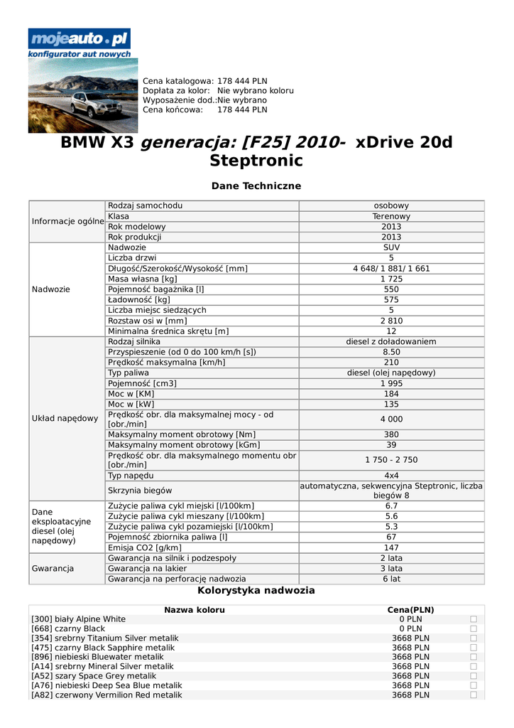 Cena katalogowa: 178 444 PLN Dopłata za kolor: Nie wybrano koloru Wyposażenie dod.:Nie wybrano Cena końcowa: 178 444 PLN BMW X3 generacja: [F25] 2010- xDrive 20d Steptronic Dane Techniczne Rodzaj samochodu Klasa Informacje ogólne Rok modelowy Rok produkcji Nadwozie Liczba drzwi Długość/Szerokość/Wysokość [mm] Masa własna [kg] Nadwozie Pojemność bagażnika [l] Ładowność [kg] Liczba miejsc siedzących Rozstaw osi w [mm] Minimalna średnica skrętu [m] Rodzaj silnika Przyspieszenie (od 0 do 100 km/h [s]) Prędkość maksymalna [km/h] Typ paliwa Pojemność [cm3] Moc w [KM] Moc w [kW] Układ napędowy Prędkość obr. dla maksymalnej mocy - od [obr./min] Maksymalny moment obrotowy [Nm] Maksymalny moment obrotowy [kGm] Prędkość obr. dla maksymalnego momentu obr [obr./min] Typ napędu Skrzynia biegów Dane eksploatacyjne diesel (olej napędowy) Gwarancja Zużycie paliwa cykl miejski [l/100km] Zużycie paliwa cykl mieszany [l/100km] Zużycie paliwa cykl pozamiejski [l/100km] Pojemność zbiornika paliwa [l] Emisja CO2 [g/km] Gwarancja na silnik i podzespoły Gwarancja na lakier Gwarancja na perforację nadwozia osobowy Terenowy 2013 2013 SUV 5 4 648/ 1 881/ 1 661 1 725 550 575 5 2 810 12 diesel z doładowaniem 8.50 210 diesel (olej napędowy) 1 995 184 135 4 000 380 39 1 750 - 2 750 4x4 automatyczna, sekwencyjna Steptronic, liczba biegów 8 6.7 5.6 5.3 67 147 2 lata 3 lata 6 lat Kolorystyka nadwozia Nazwa koloru [300] biały Alpine White [668] czarny Black [354] srebrny Titanium Silver metalik [475] czarny Black Sapphire metalik [896] niebieski Bluewater metalik [A14] srebrny Mineral Silver metalik [A52] szary Space Grey metalik [A76] niebieski Deep Sea Blue metalik [A82] czerwony Vermilion Red metalik Cena(PLN) 0 PLN 0 PLN 3668 PLN 3668 PLN 3668 PLN 3668 PLN 3668 PLN 3668 PLN 3668 PLN [B06] brązowy Sparkling Bronze 3668 PLN Wyposażenie standardowe Nazwa elementu 17-calowe obręcze kół ze stopów lekkich V Spoke 304 aktywne zagłówki apteczka i trójkąt ostrzegawczy oraz gaśnica atrapa chłodnicy z chromowanym obramowaniem i czarnym grilem automatyczne oświetlenie wewnętrzne, płynne włączanie i wyłączanie automatyczne przednie pasy bezpieczeństwa z pirotechnicznymi napinaczami i adaptacyjnymi ogranicznikami siły naciągu bezpieczna karoseria, wzmocnienia boczne, aktywna maska silnika (system ochrony pieszych) centralny zamek z immobiliserem i czujnikiem kolizji, pokrywa wlewu paliwa objęta zamkiem centralnym, pilot czarne obramowanie okien elektryczne podnośniki szyb przednich i tylnych z funkcją całkowitego otwierania/zamykania ergonomiczny system tylnych pasów bezpieczeństwa z trzypunktowymi pasami dla wszystkich miejsc, z zaczepami ukrytymi w klapie filtr cząstek stałych fotele standardowe regulowane ręcznie funkcja Auto Start Stop gniazdo Aux-In hamulce tarczowe na przedniej i tylnej osi ISOFIX - mocowanie fotelików dziecięcych na zewnętrznych siedzeniach tylnych kierownica skórzana klimatyzacja automatyczna, dwustrefowa (z funkcją automatycznego zamykania obiegu powietrza i czujnikiem nasłonecznienia) komputer pokładowy z funkcją Check Control i wskazaniem temperatury zewnętrznej na wyświetlaczu informacyjnym (5,7 calowym) listwy ozdobne satynowo srebrne mat lusterka zewnętrzne, asferyczne, regulacja elektryczna, ogrzewane (sterowane aktywnie na podstawie temperatury zewnętrznej) norma emisji spalin: Euro 5 odzysk energii hamowania oparcie tylnej kanapy dzielone w stosunku 60/40 opony z funkcją jazdy awaryjnej Runflat Personal Profile, personalizacja ważnych funkcji obsługi podłokietnik przedni, uchylany, ze schowkiem podłokietnik środkowy z tyłu poduszki powietrzne boczne poduszki powietrzne chroniące głowę z przodu i z tyłu poduszki powietrzne dla kierowcy i pasażera; czujnik zajęcia miejsca obok kierowcy radio BMW Business z odtwarzaczem CD reflektory przeciwmgielne z przezroczystym kloszem ręczna regulacja kolumny kierownicy w pionie i w poziomie schowek w konsoli środkowej i we wszystkich drzwiach strefy zgniotu z przodu i z tyłu, zderzaki odzyskujące swój pierwotny kształt po uderzeniu z prędkością do 6km/h sygnalizacja uszkodzenia opony system alarmowy sterowany pilotem system zapobiegający blokowaniu się kół podczas hamowania z systemem kontroli hamowania na zakręcie tapicerka materiałowa Ribbon tylny spojler dachowy w kolorze nadwozia uchwyt na napoje w konsoli środkowej z przodu układ dynamicznej kontroli stabilności (DSC, DTC, asystent hamowania) układ kontroli zjazdu ze wzniesienia (HDC - Hill Dessent Control) wspomaganie układu kierowniczego SERVOTRONIC zderzaki w kolorze karoserii Wyposażenie dodatkowe Lista wyposażenia dodatkowego Cena [223] układ Dynamic Damper Control; niedostępne z [225/226]; tylko z [2VG] 4804 PLN [223] układ Dynamic Damper Control; niedostępne z [225/226]; tylko z [2VG]; w połączeniu z 3319 PLN [337] [226] sportowe zawieszenie (zawiera performance control); tylko z [2VG]; niedostępne z [223] 1485 PLN lub [225] [226] sportowe zawieszenie; niedostępne z [223/225]; tylko z [2VG]; w połączeniu z [337] 0 PLN [248] ogrzewanie kierownicy 775 PLN [249] kierownica wielofunkcyjna; tylko z [544] 0 PLN [255] sportowa skórzana kierownica; niedostępne z [337] 437 PLN [2AM] obręcze kół ze stopów lekkich Streamline 306, 17 cali (opony 245/55 R17) 2839 PLN [2B7] obręcze kół ze stopów lekkich Double Spoke 309 z ogumieniem mieszanym, 19 cali 9826 PLN (opony z przodu 245/45 R19, z tyłu 275/40 R19) [2EB] obręcze kół ze stopów lekkich Y-Spoke 305, 17 cali (opony 225/60 R17) 1965 PLN [2EC] obręcze kół ze stopów lekkich Y-Spoke 308, 18 cali (opony 245/50 R18) 5459 PLN [2K8] obręcze kół ze stopów lekkich V-Spoke 307, 18 cali (opony 245/50 R18) 5022 PLN [2VG] Performance Control 655 PLN [2VL] zmienny sportowy układ kierowniczy; tylko z [2VG] 1310 PLN [2VL] zmienny sportowy układ kierowniczy; tylko z [2VG]; w połączeniu z [337] 873 PLN [316] automatyczn