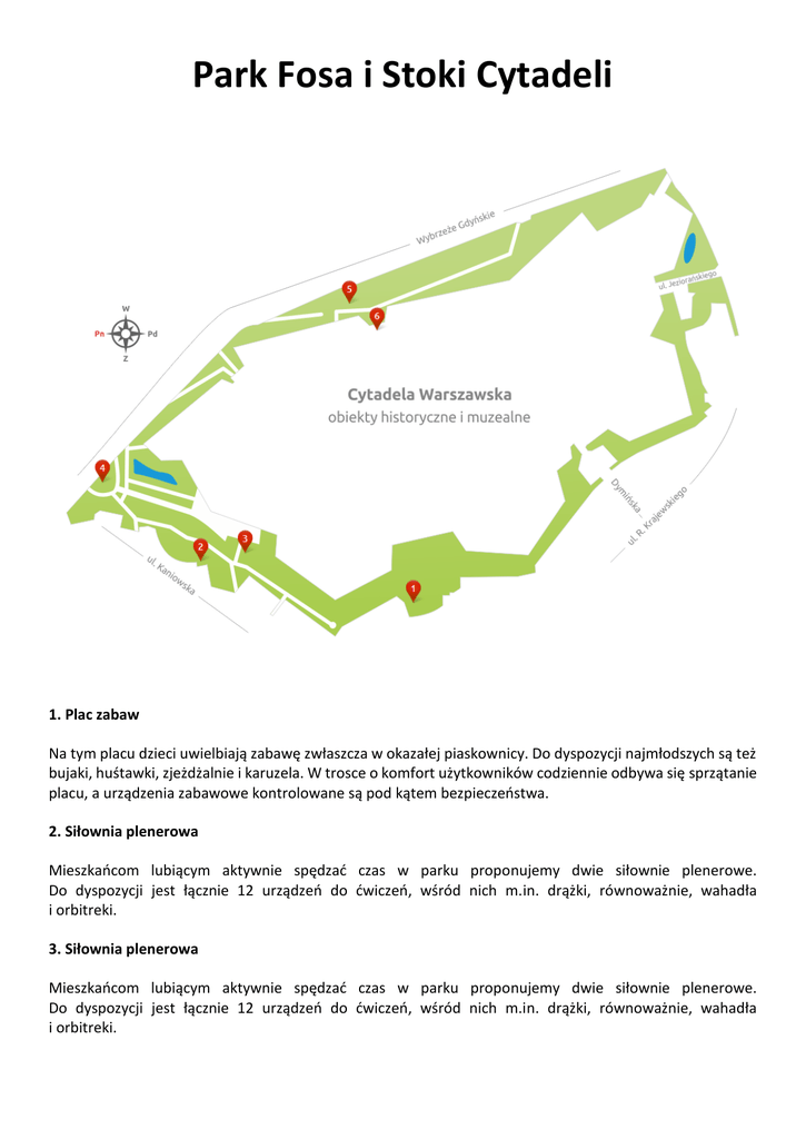 Park Fosa i Stoki Cytadeli 1. Plac zabaw Na tym placu dzieci uwielbiają zabawę zwłaszcza w okazałej piaskownicy. Do dyspozycji najmłodszych są też bujaki, huśtawki, zjeżdżalnie i karuzela. W trosce o komfort użytkowników codziennie odbywa się sprzątanie placu, a urządzenia zabawowe kontrolowane są pod kątem bezpieczeństwa. 2. Siłownia plenerowa Mieszkańcom lubiącym aktywnie spędzać czas w parku proponujemy dwie siłownie plenerowe. Do dyspozycji jest łącznie 12 urządzeń do ćwiczeń, wśród nich m.in. drążki, równoważnie, wahadła i orbitreki. 3. Siłownia plenerowa Mieszkańcom lubiącym aktywnie spędzać czas w parku proponujemy dwie siłownie plenerowe. Do dyspozycji jest łącznie 12 urządzeń do ćwiczeń, wśród nich m.in. drążki, równoważnie, wahadła i orbitreki. 4. Płyta upamiętniająca żołnierzy II Dywizji Piechoty Wojska Polskiego Pamiątkową płytę ustawiono przy ul. Wybrzeże Gdyńskie. Pomnik upamiętnia desant II Dywizji Piechoty I Armii Wojska Polskiego we wrześniu 1944 roku będący próbą niesienia pomocy walczącym na Żoliborzu powstańcom. 5. Symboliczny cmentarz Na terenie parku znajduje się symboliczny cmentarz osób poległych oraz zamordowanych w dawnym więzieniu śledczym. Obok cmentarza zlokalizowano obelisk, przy którym za szkłem umieszczono resztki drewna pochodzącego z szubienicy, stojącej niegdyś w tym samym miejscu. 6. Brama Straceń W te część Żoliborza wtopiona jest okrutna historia egzekucji wykonanych na więźniach politycznych w II połowie XIX w. Dlatego też wschodnia brama Cytadeli nazywana jest Bramą Straceń. Za nią znajduje się X Pawilon – budynek dawnego więzienia śledczego.