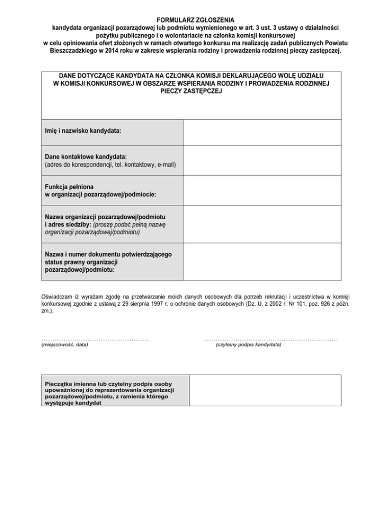 FORMULARZ ZGŁOSZENIA kandydata organizacji pozarządowej lub podmiotu wymienionego w art. 3 ust. 3 ustawy o działalności poŜytku publicznego i o wolontariacie na członka komisji konkursowej w celu opiniowania ofert złoŜonych w ramach otwartego konkursu ma realizację zadań publicznych Powiatu Bieszczadzkiego w 2014 roku w zakresie wspierania rodziny i prowadzenia rodzinnej pieczy zastępczej. DANE DOTYCZĄCE KANDYDATA NA CZŁONKA KOMISJI DEKLARUJĄCEGO WOLĘ UDZIAŁU W KOMISJI KONKURSOWEJ W OBSZARZE WSPIERANIA RODZINY I PROWADZENIA RODZINNEJ PIECZY ZASTĘPCZEJ Imię i nazwisko kandydata: Dane kontaktowe kandydata: (adres do korespondencji, tel. kontaktowy, e-mail) Funkcja pełniona w organizacji pozarządowej/podmiocie: Nazwa organizacji pozarządowej/podmiotu i adres siedziby: (proszę podać pełną nazwę organizacji pozarządowej/podmiotu) Nazwa i numer dokumentu potwierdzającego status prawny organizacji pozarządowej/podmiotu: Oświadczam iŜ wyraŜam zgodę na przetwarzanie moich danych osobowych dla potrzeb rekrutacji i uczestnictwa w komisji konkursowej zgodnie z ustawą z 29 sierpnia 1997 r. o ochronie danych osobowych (Dz. U. z 2002 r. Nr 101, poz. 926 z późn. zm.). …………………………………………. (miejscowość, data) Pieczątka imienna lub czytelny podpis osoby upowaŜnionej do reprezentowania organizacji pozarządowej/podmiotu, z ramienia którego występuje kandydat ……………………………………….…………… (czytelny podpis kandydata)