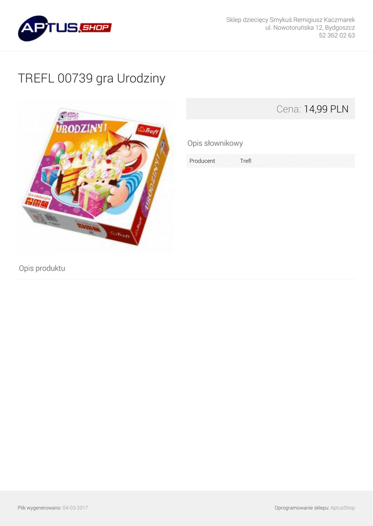 Sklep dziecięcy Smykuś Remigiusz Kaczmarek ul. Nowotoruńska 12, Bydgoszcz 52 362 02 63 TREFL 00739 gra Urodziny Cena: 14,99 PLN Opis słownikowy Producent Trefl Opis produktu Plik wygenerowano: 04-03-2017 Powered by TCPDF (www.tcpdf.org) Oprogramowanie sklepu: AptusShop